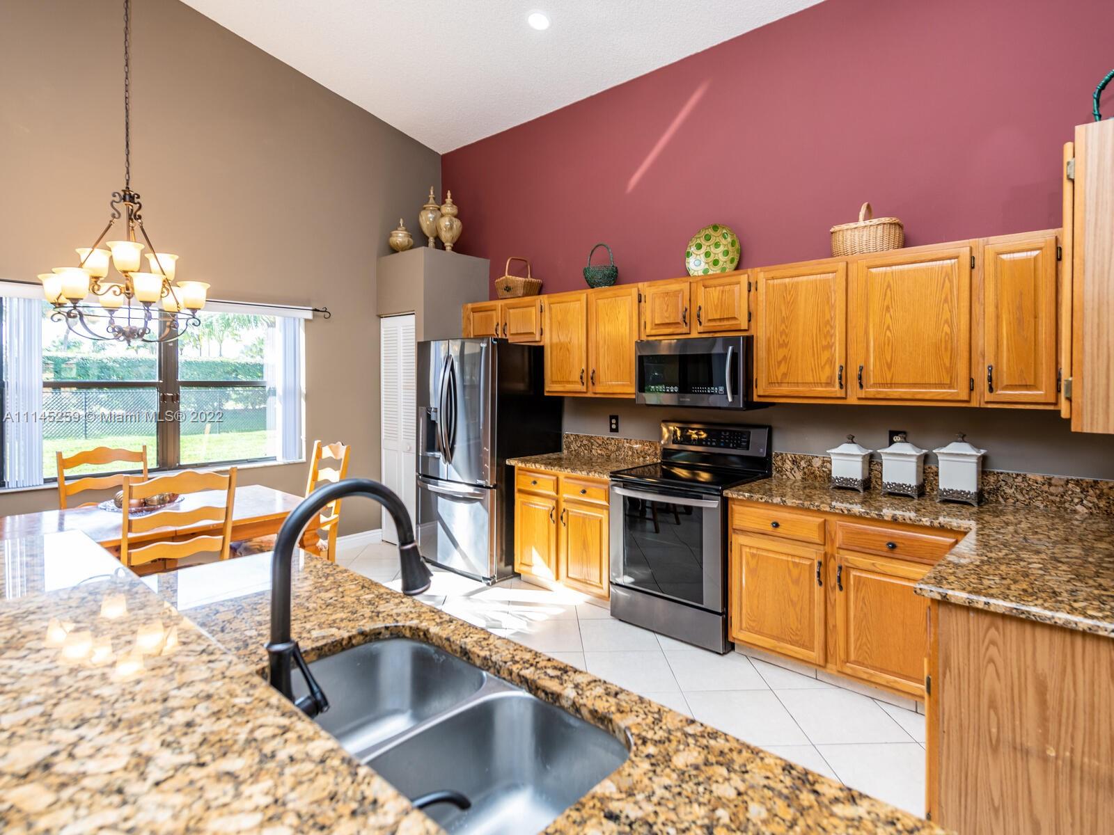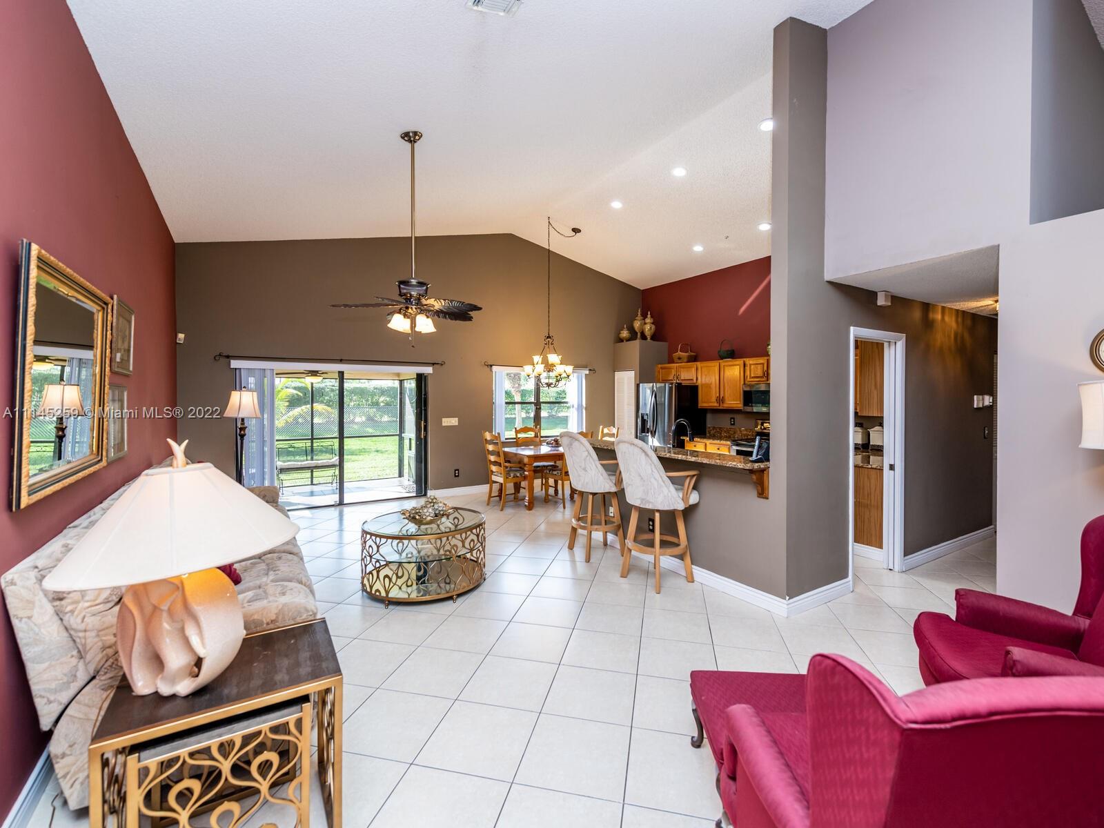 Single owner home in prized Forest Ridge community with majestic live oak community entrance, access to natural preserve for strolls, bike riding and dog walks ready for new family. Roof 2012, keyed hurricane impact shutters. Hurricane Impact front door and arched window. Eat-in kitchen with granite countertops and bar seating. Vaulted ceilings throughout. Bedrooms carpeted. Master bedroom with two walk in closets has double sink vanity. Second bathroom has double sink vanity and shower/bath. Oversized tile throughout sunny, south facing living areas. Enclosed patio with small pet gate. Large fenced backyard. A-rated Davie school district. Short walk to Silver Ridge Elementary. Separate indoor laundry. Brick paver walkway/alcove and driveway. All appliance warranties on hand.