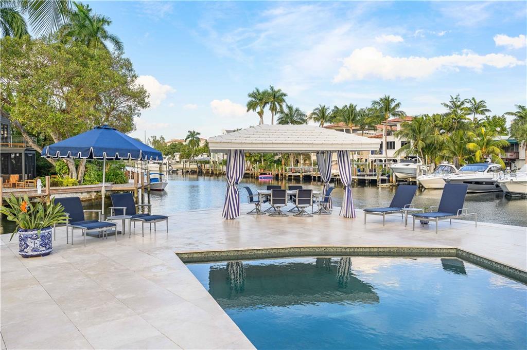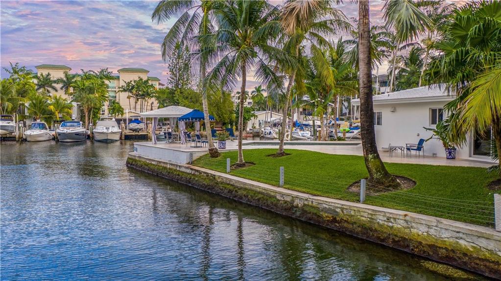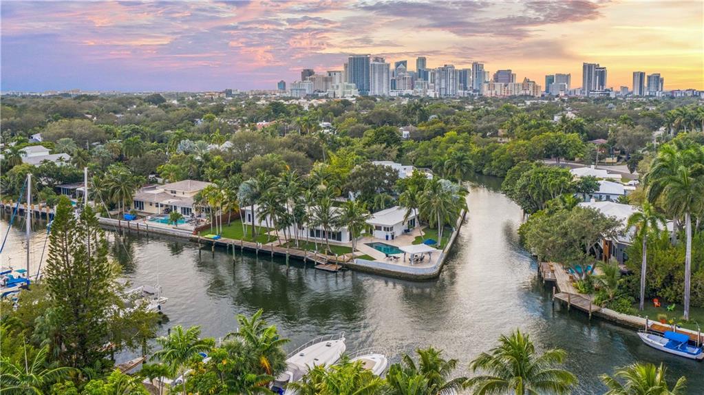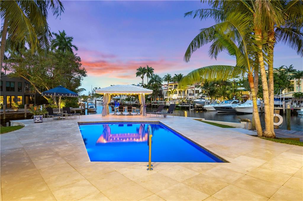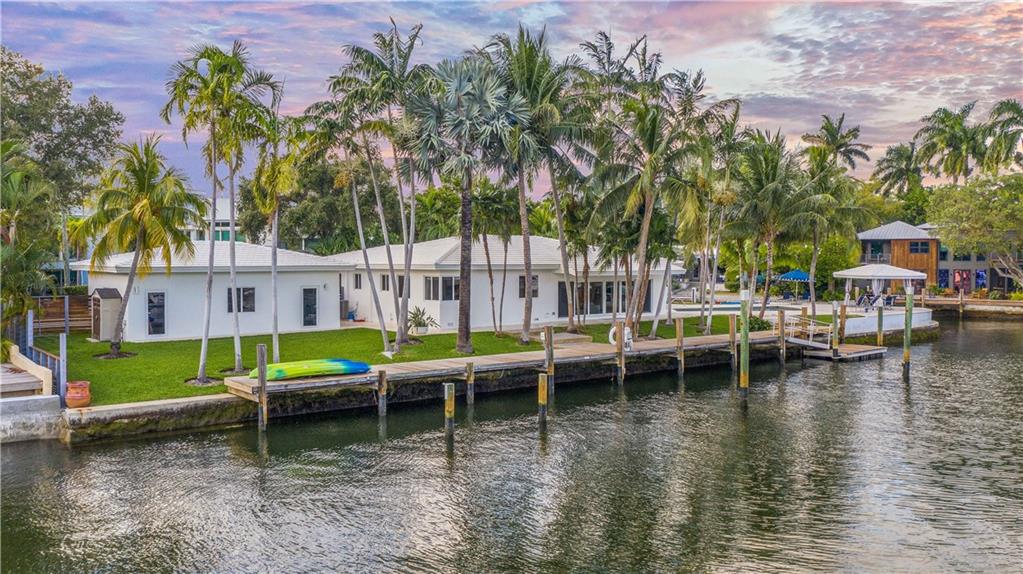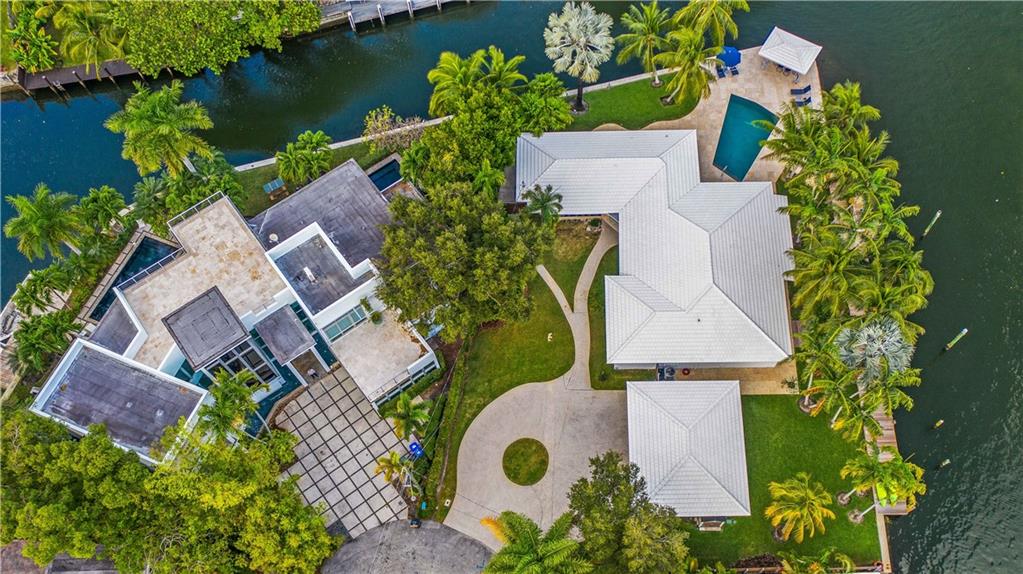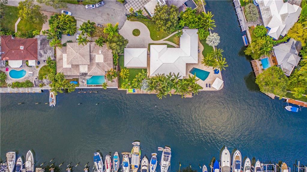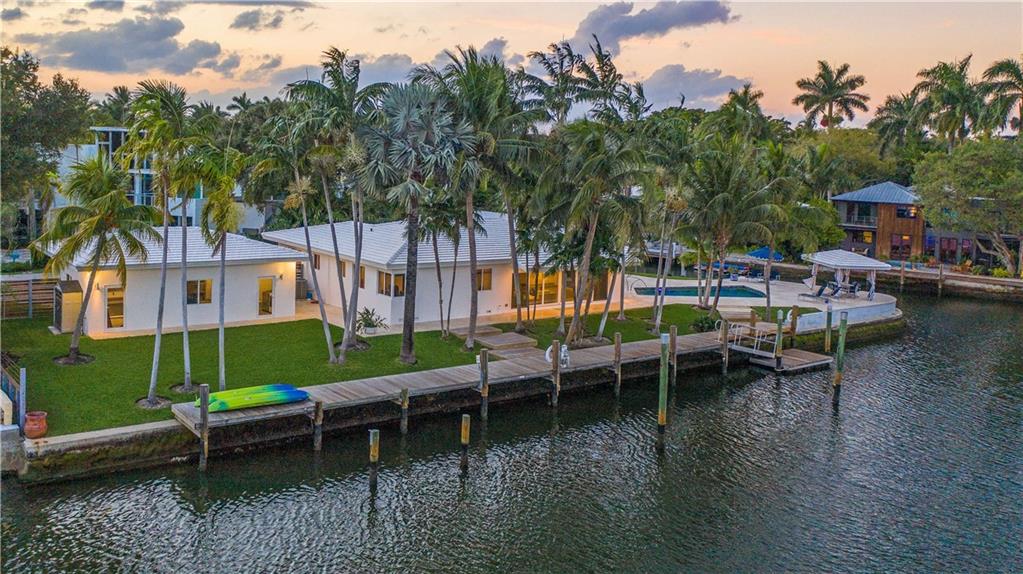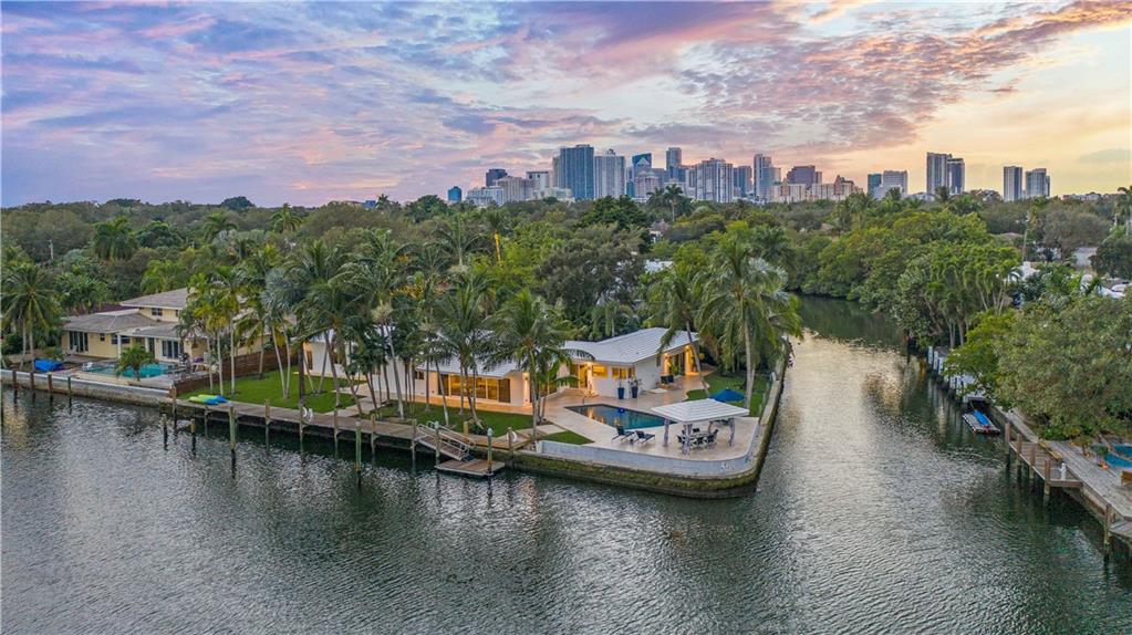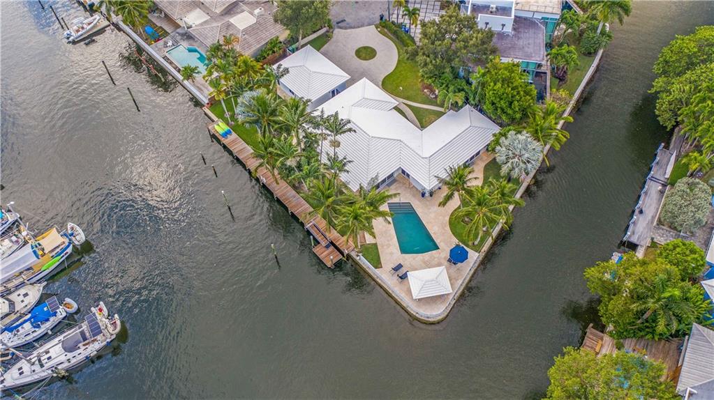 Park-like North Gordon's premier point property encompasses over 16,000 square feet & no-fixed-bridge water front of over 240 feet with 162 feet along the wide, deep Karen Canal. A recent multi-level ipe dock also has a float platform. Sleek Mid-Century architecture is updated for the 21st Century including re-built roof, newer electrical and plumbing systems and all impact-rated windows and doors. The sunken living room has volume ceilings. Walls of sliding glass merge outdoor and indoor living featuring water views from all public areas. Travertine patios surround the re-done, heated pool and water facing gazebo. In front, a crescent drive leads to an oversized three car garage with additional storage and laundry room with a dog wash. Very walkable to parks and Las Olas dining.