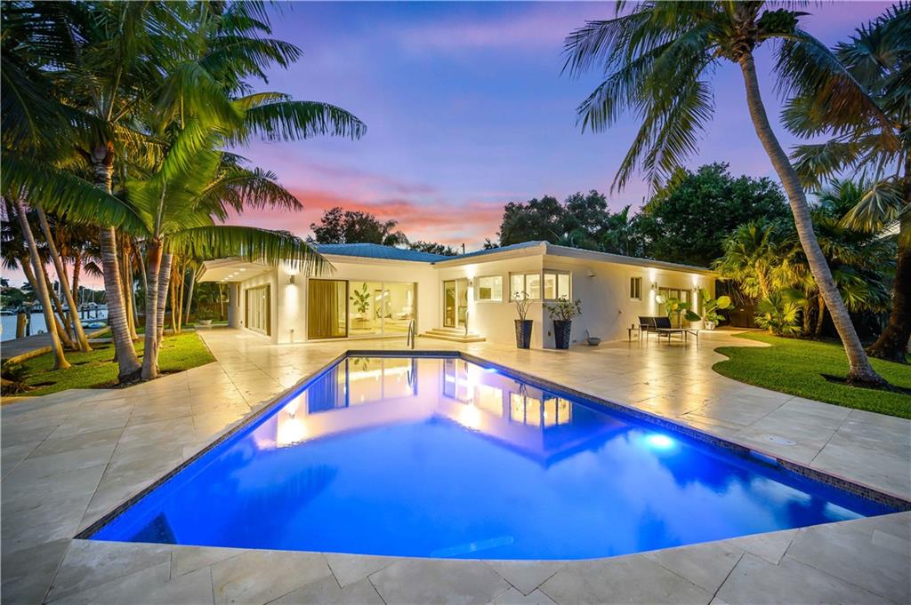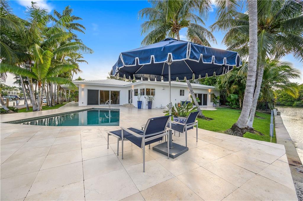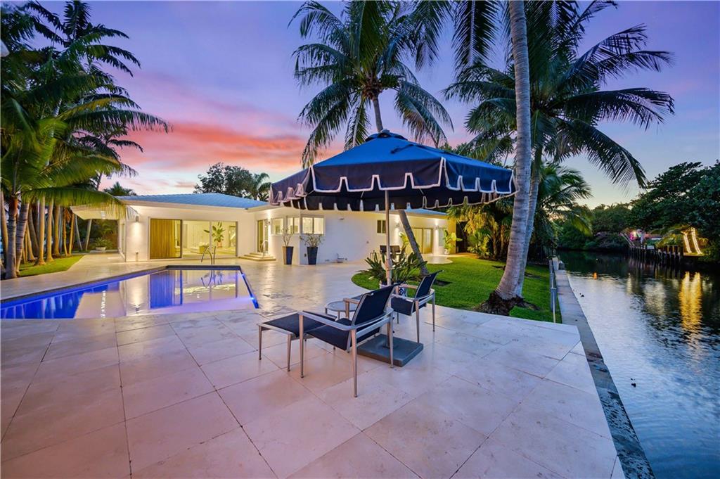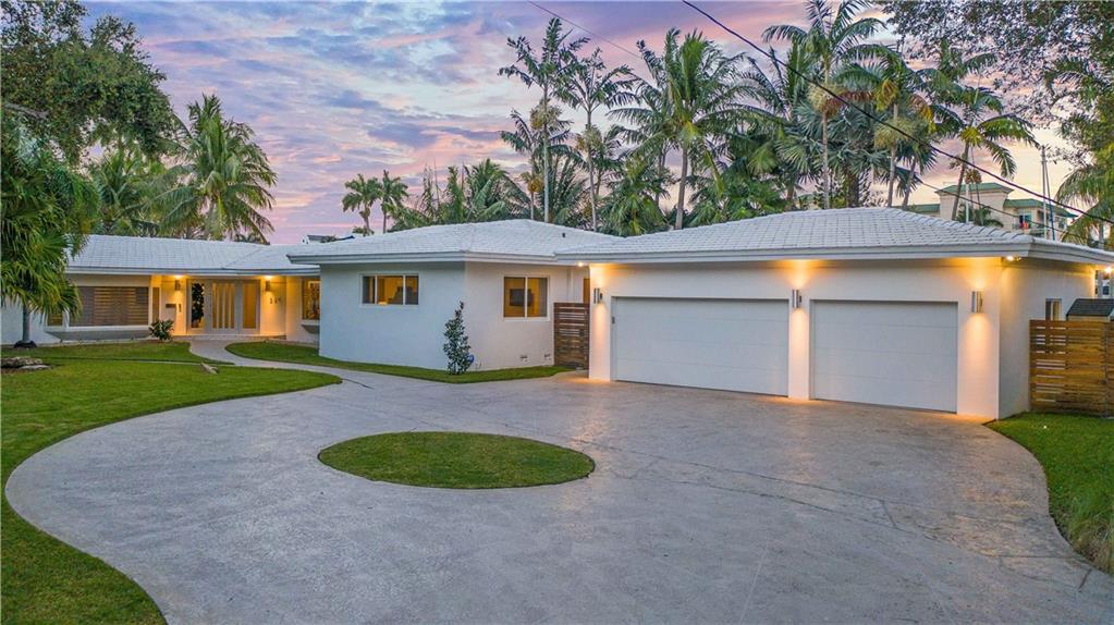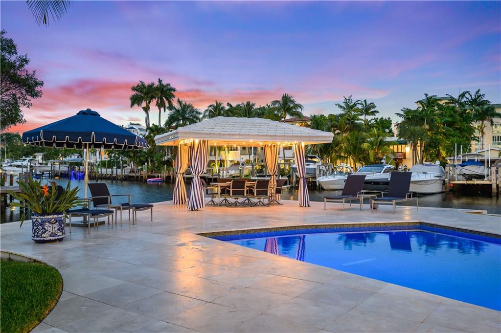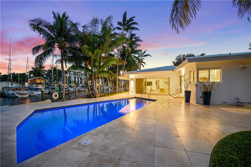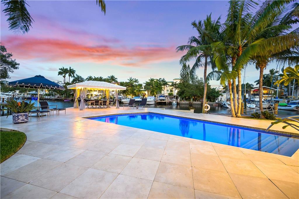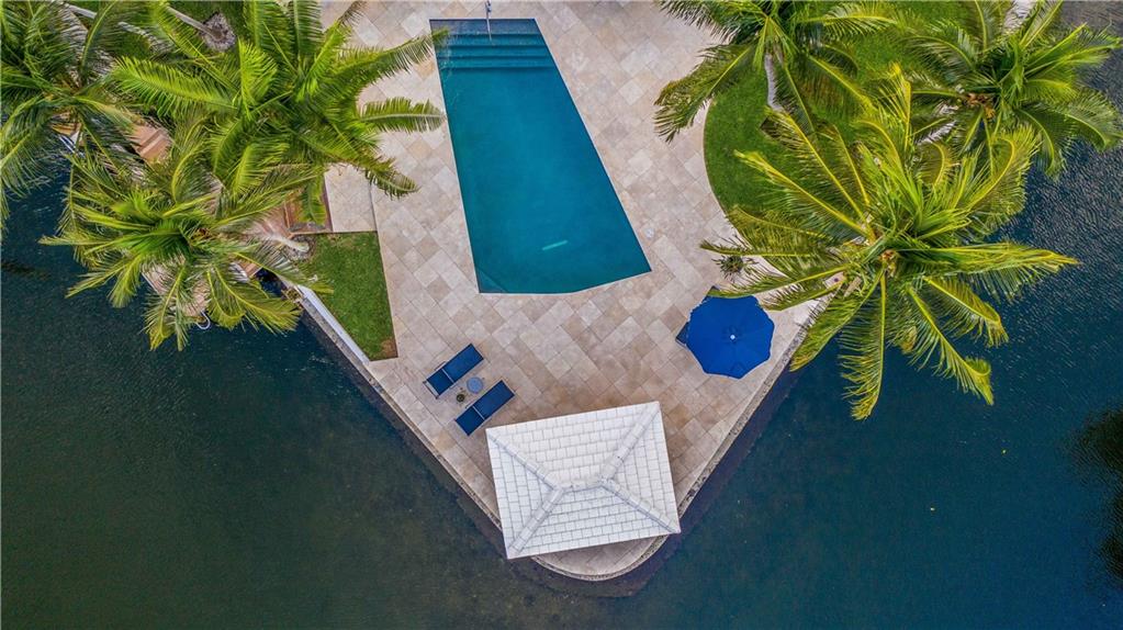 Park-like North Gordon's premier point property encompasses over 16,000 square feet & no-fixed-bridge water front of over 240 feet with 162 feet along the wide, deep Karen Canal. A recent multi-level ipe dock also has a float platform. Sleek Mid-Century architecture is updated for the 21st Century including re-built roof, newer electrical and plumbing systems and all impact-rated windows and doors. The sunken living room has volume ceilings. Walls of sliding glass merge outdoor and indoor living featuring water views from all public areas. Travertine patios surround the re-done, heated pool and water facing gazebo. In front, a crescent drive leads to an oversized three car garage with additional storage and laundry room with a dog wash. Very walkable to parks and Las Olas dining.