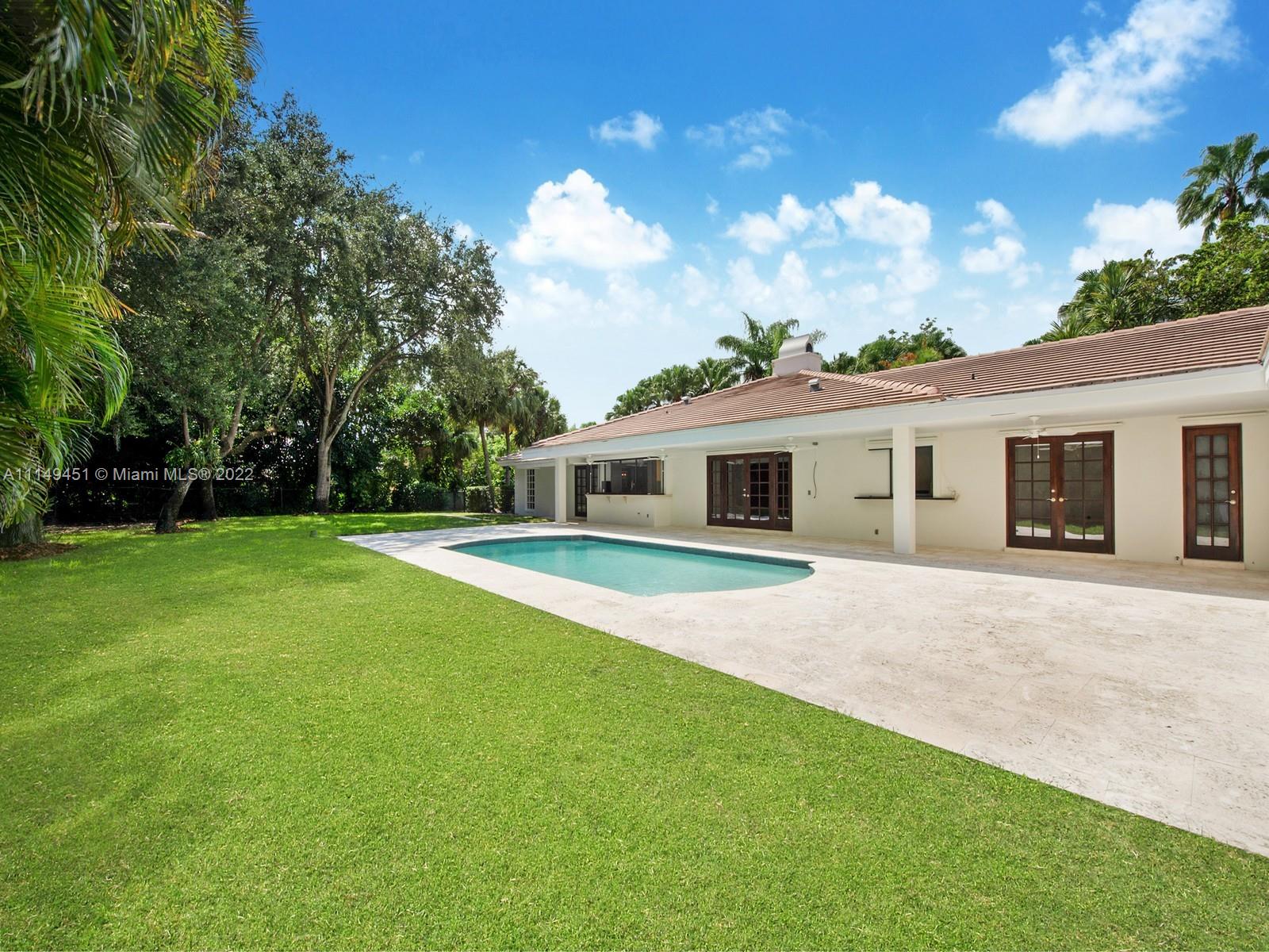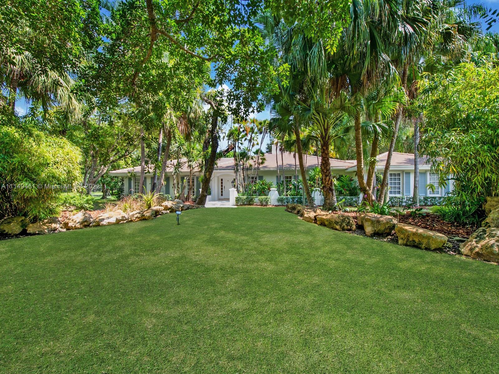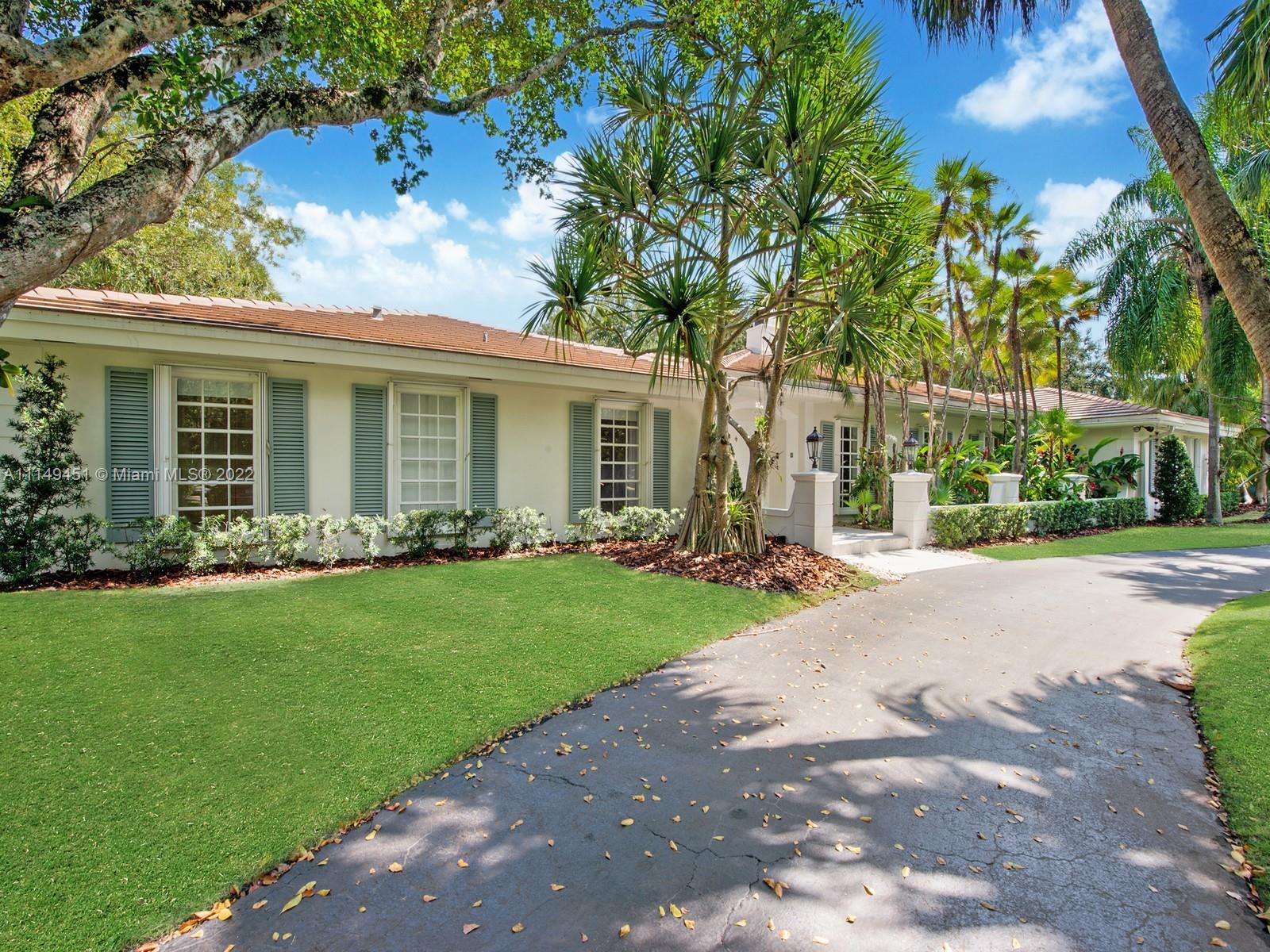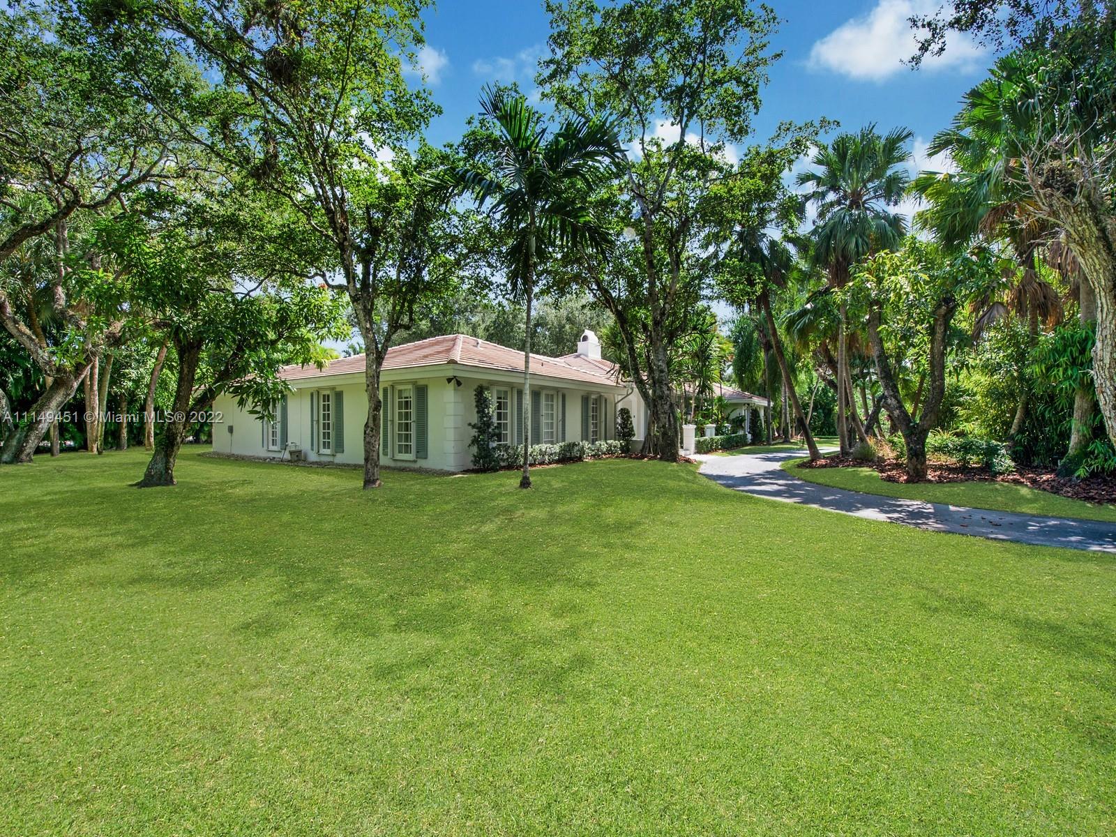This beautiful single-story renovated home on historic Old Cutler Road in South Gables is within minutes to top-rated schools, Matheson Hammock Park & Marina, and Fairchild Tropical Botanic Garden. It has eye-catching curb appeal with lush tropical landscaping including multiple fruit trees and mature oaks, and is ideally situated on a large corner lot on a cul-de-sac side street. In addition to its sought-after location, this lovely home has 5 bedrooms with 4 bathrooms including a cabana bath, grand foyer entrance, double-sided fireplace shared by the formal living and family room, formal dining room with architectural details, family room with built-ins and wet bar with seating, spacious kitchen with ample storage and counter space, island seating, and breakfast area.