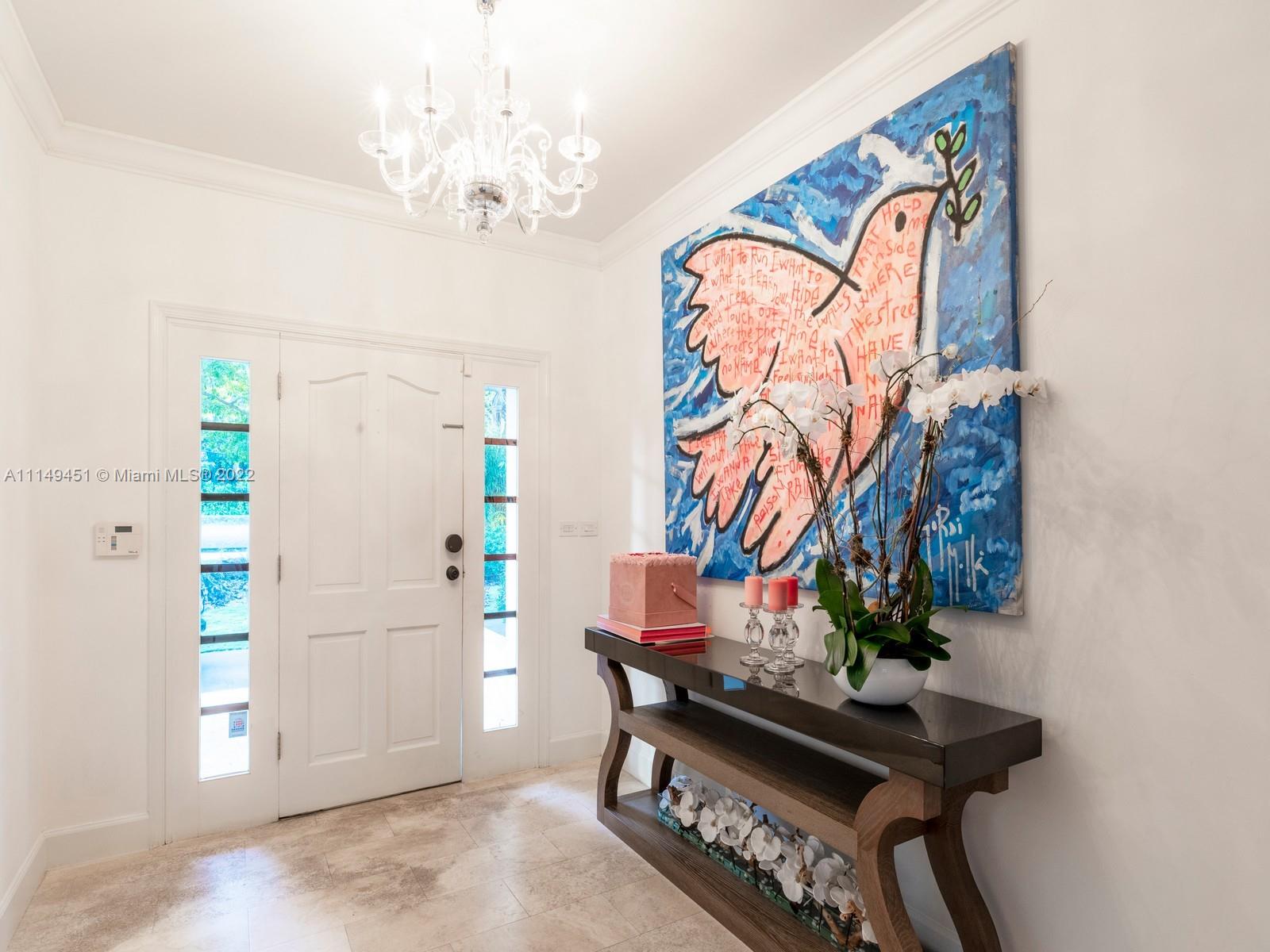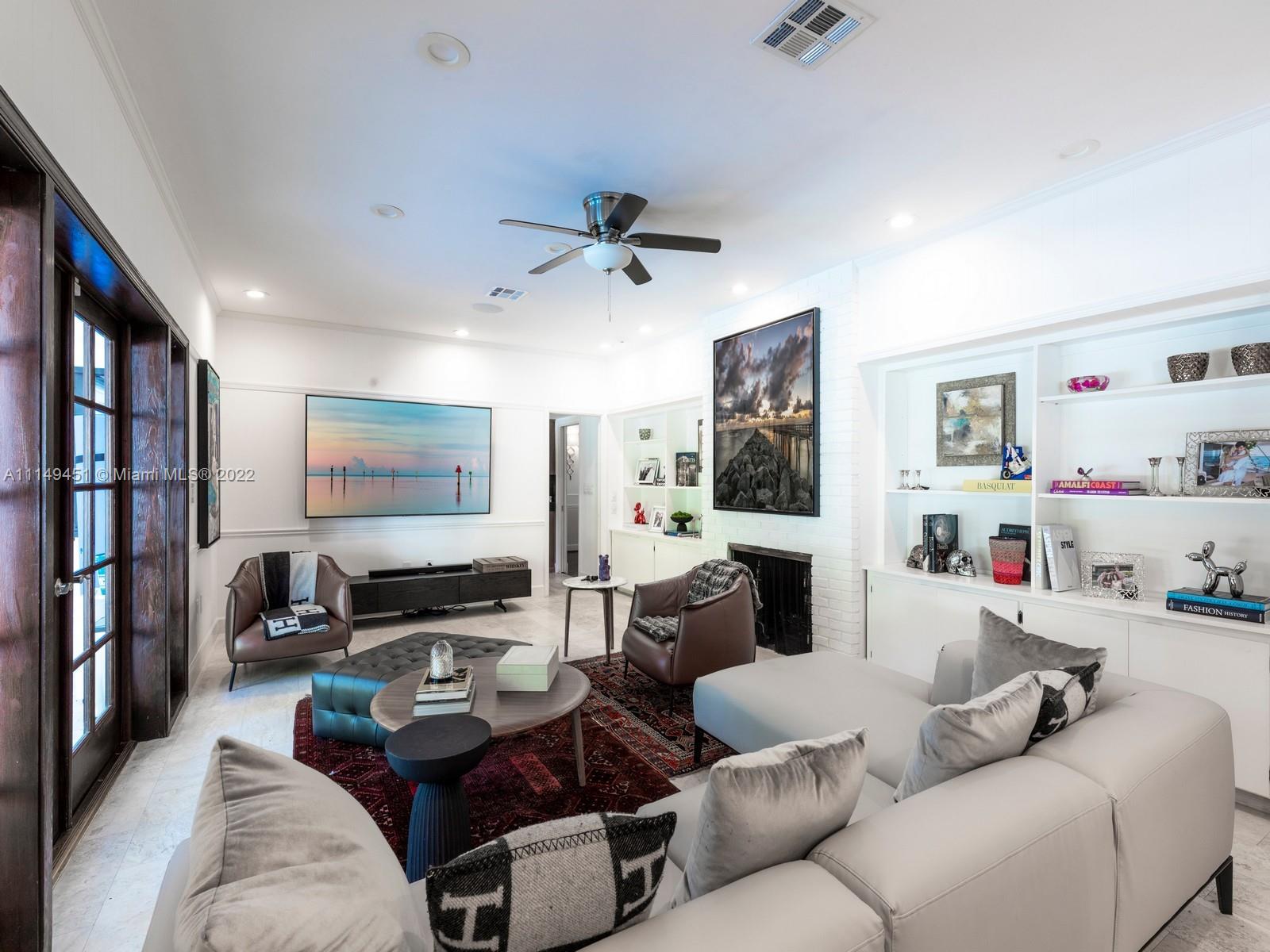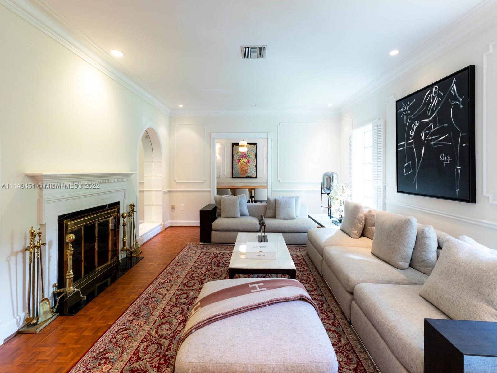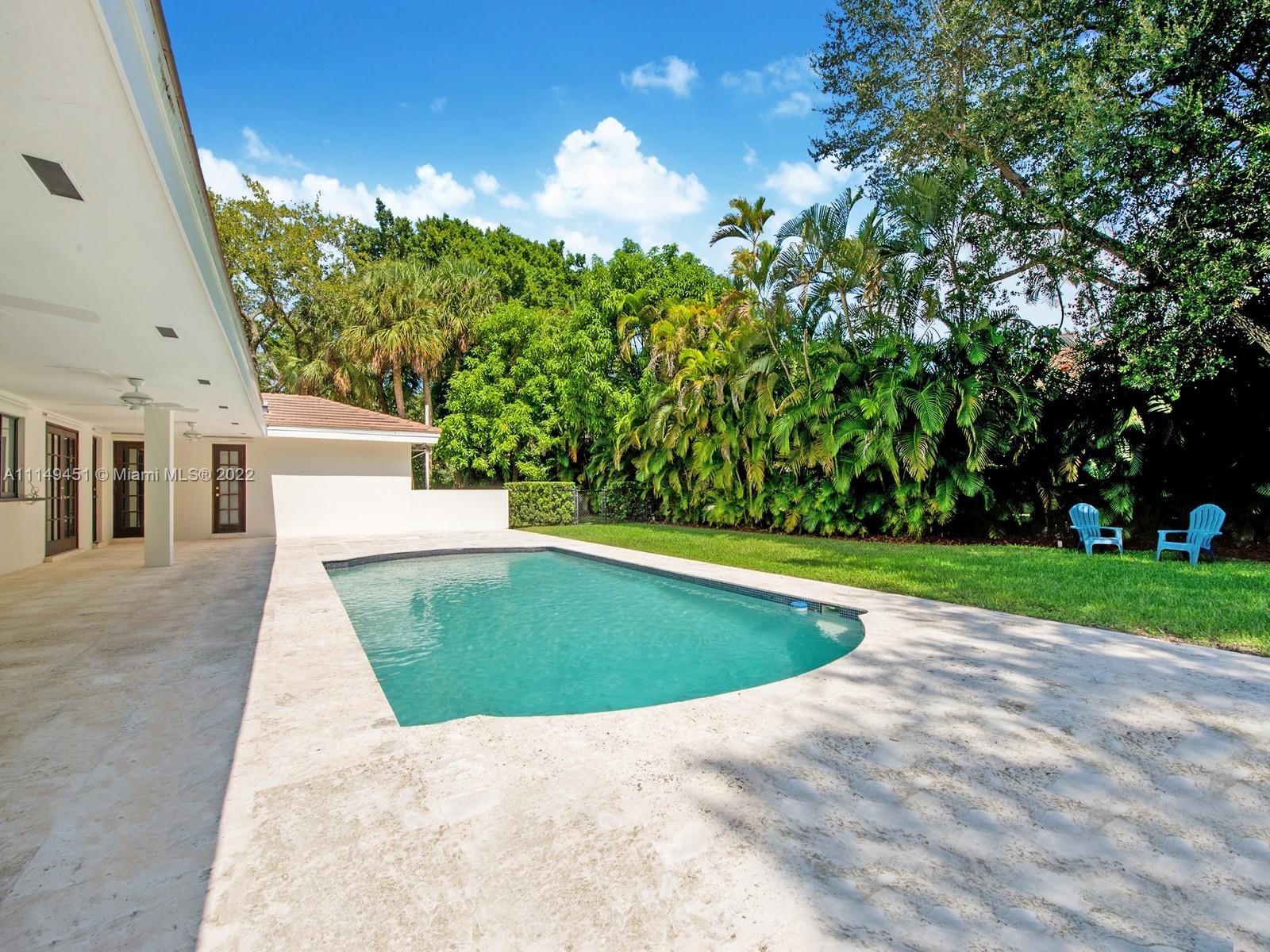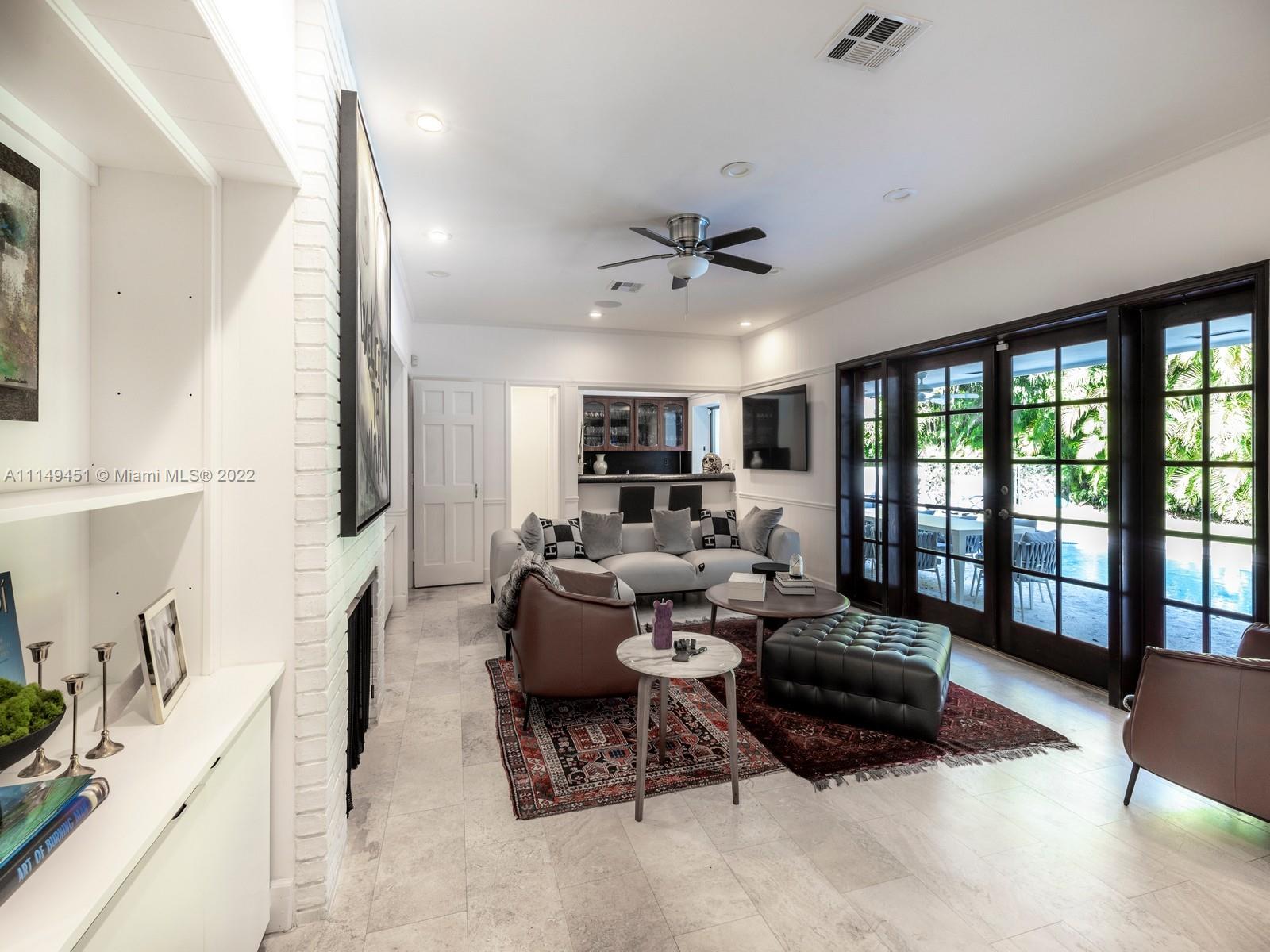 This beautiful single-story renovated home on historic Old Cutler Road in South Gables is within minutes to top-rated schools, Matheson Hammock Park & Marina, and Fairchild Tropical Botanic Garden. It has eye-catching curb appeal with lush tropical landscaping including multiple fruit trees and mature oaks, and is ideally situated on a large corner lot on a cul-de-sac side street. In addition to its sought-after location, this lovely home has 5 bedrooms with 4 bathrooms including a cabana bath, grand foyer entrance, double-sided fireplace shared by the formal living and family room, formal dining room with architectural details, family room with built-ins and wet bar with seating, spacious kitchen with ample storage and counter space, island seating, and breakfast area.