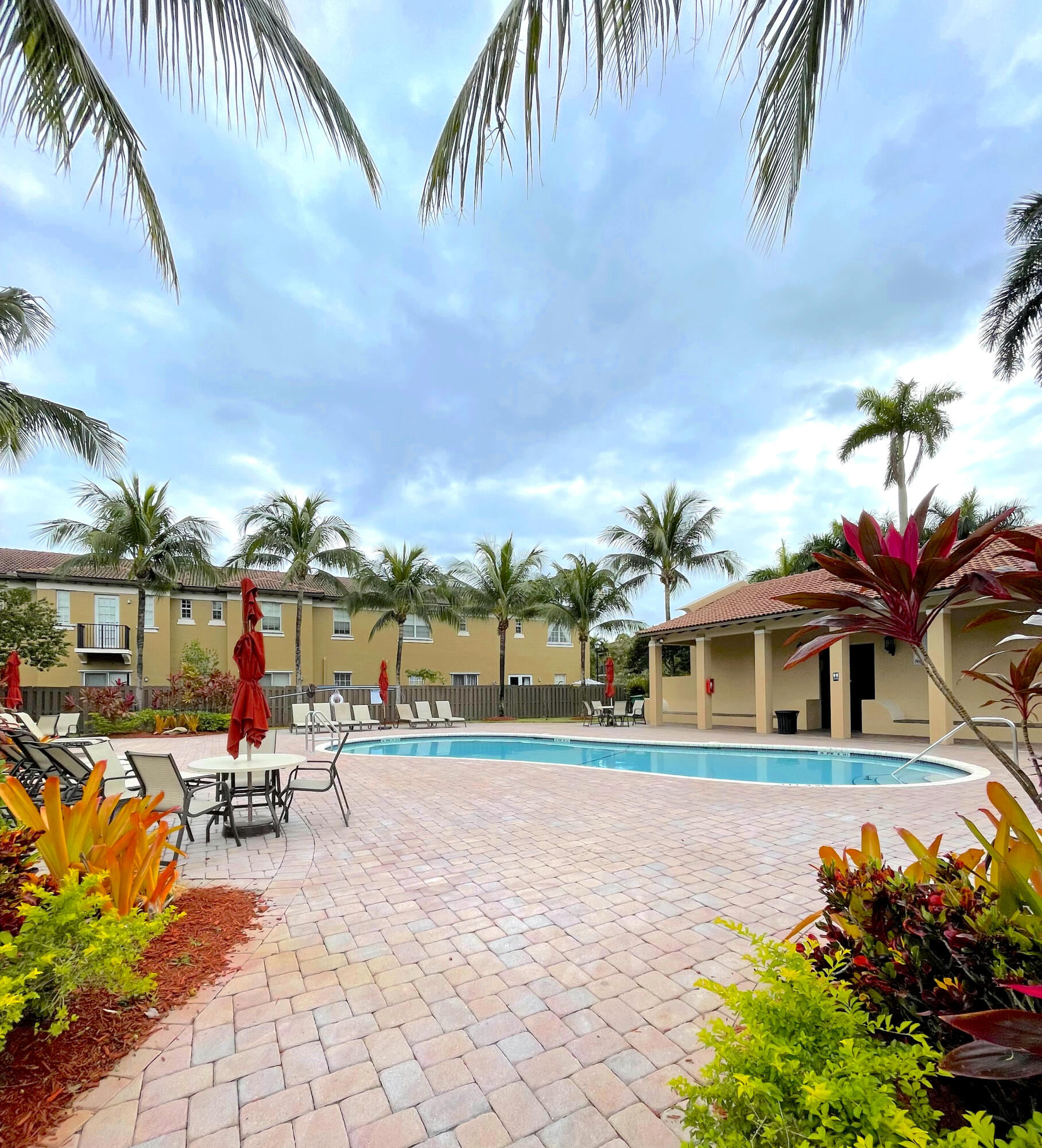 This beautiful townhome community was just repainted in 2021, as well as the main interior of this home. The 3-bed-2.5-bath home has no carpeting- only tile & laminate wood flooring throughout. Granite countertops, 2 large walk-in master closets, master double sinks with a large soaking tub and a walk-out balcony are special features in this townhome. It also has a 1 car garage, driveway space for 1 and additional guest parking. The HOA fee includes front exterior landscaping, pool service, common area maintenance, basic cable and alarm system. Cimarron amenities include the community pool and playground and is also zoned for A-rated Schools in Davie.