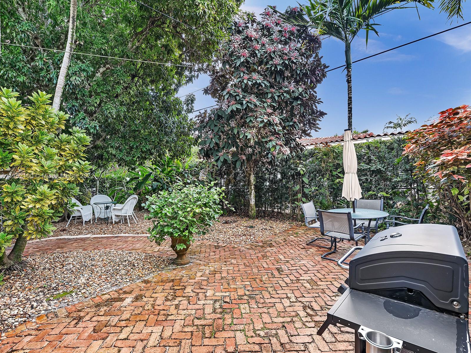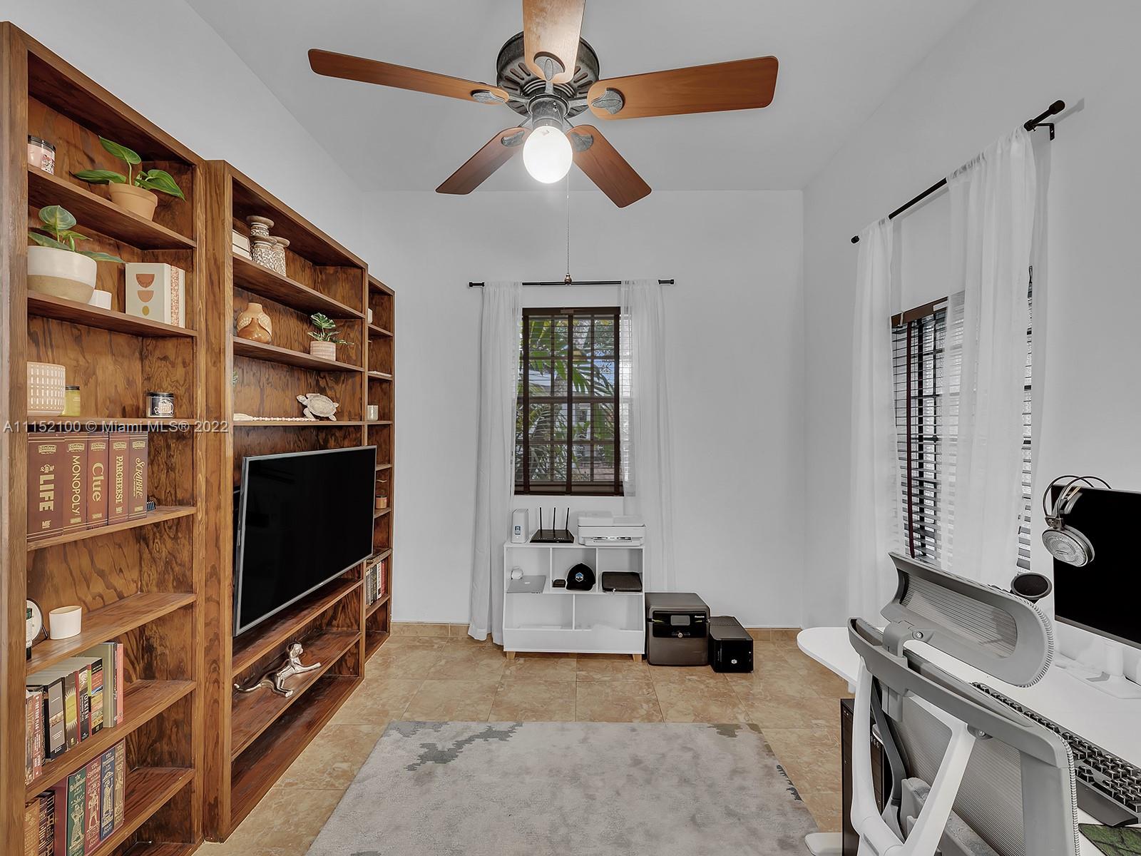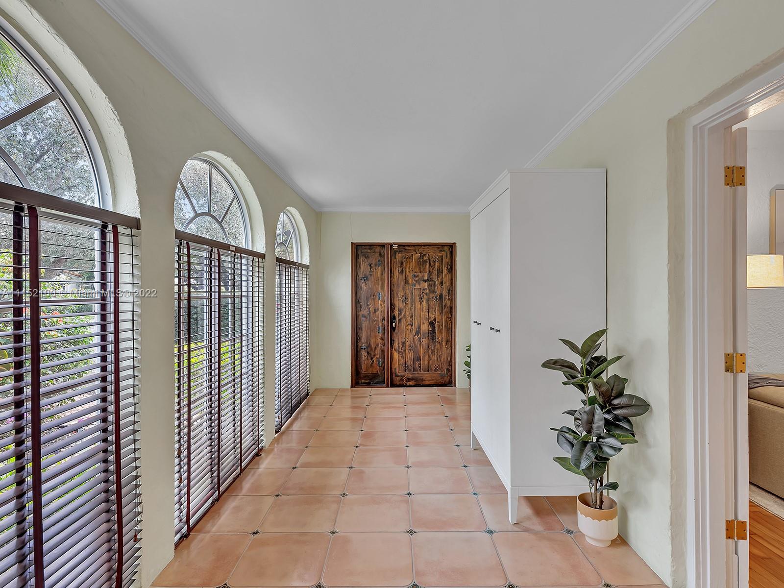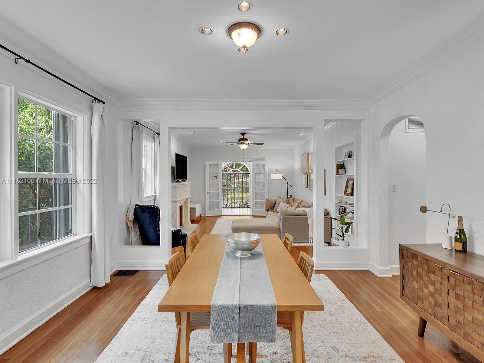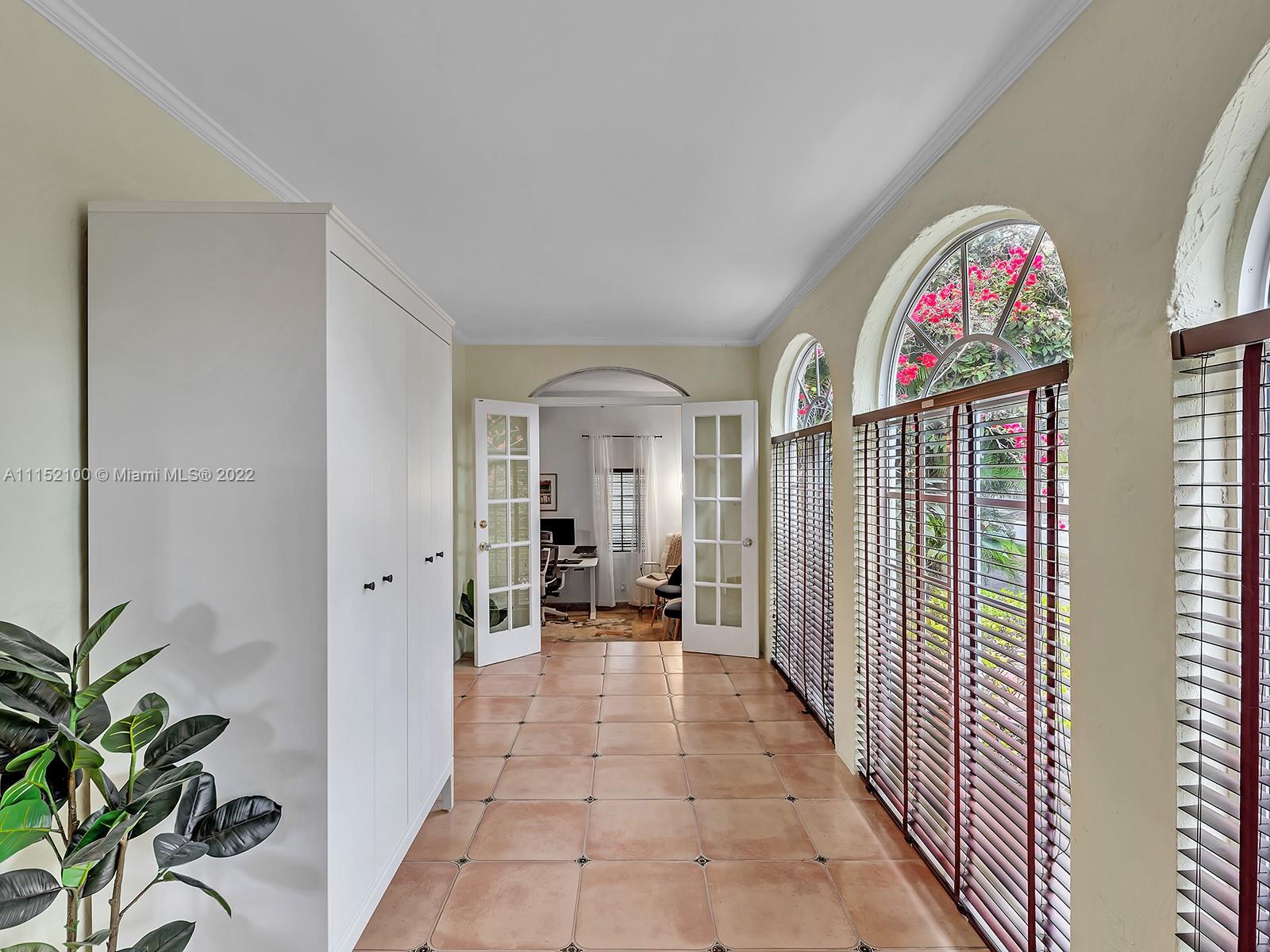 Enjoy this perfectly maintained Old Spanish in North Gables , exuding grace & comfort. Upon entering , walk into a sunroom, with walls of windows . This large lite & brite home has two bedrooms / One Bath home with a separate den/office and features a wood burning fireplace, hardwood floors, high ceilings, tankless water heater, closet built ins & a charming brick garden with a generous back yard . All windows are either impact or have shutters. Short drive to Downtown Coral Gables, Venetian Pool , Biltmore Hotel , Restaurants and shopping as well as the airport .