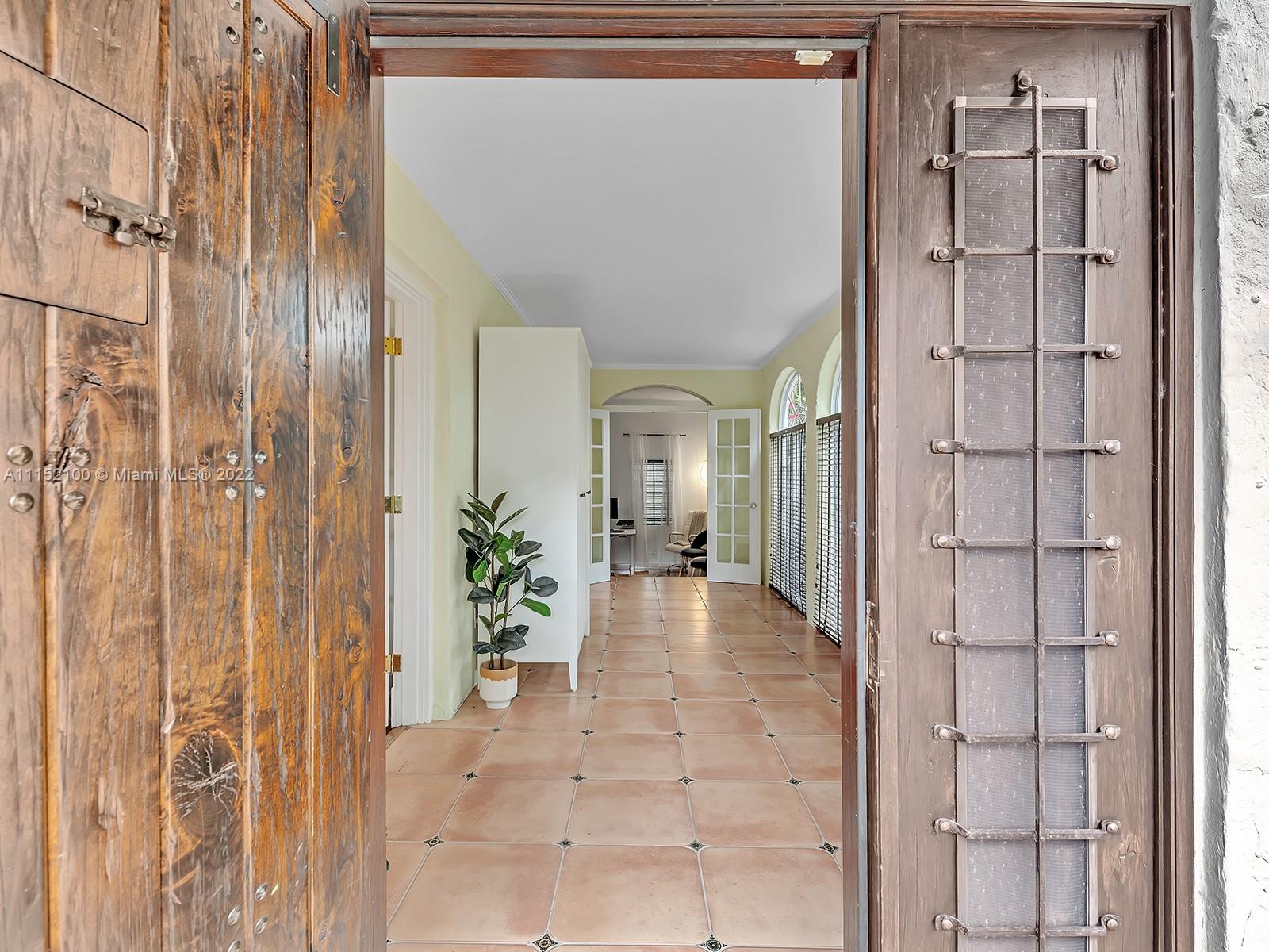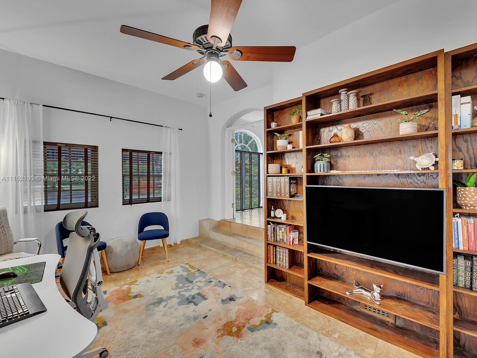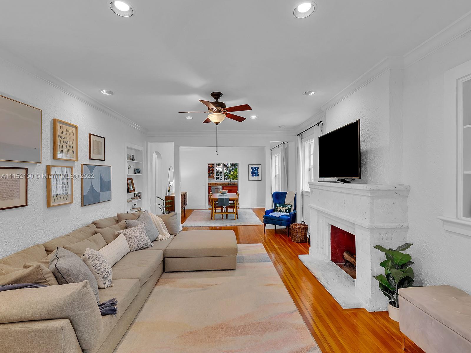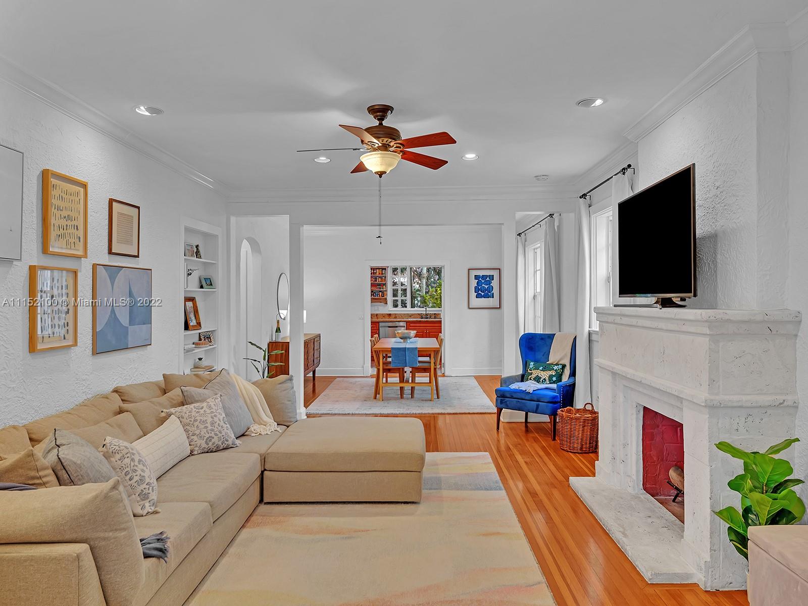 Enjoy this perfectly maintained Old Spanish in North Gables , exuding grace & comfort. Upon entering , walk into a sunroom, with walls of windows . This large lite & brite home has two bedrooms / One Bath home with a separate den/office and features a wood burning fireplace, hardwood floors, high ceilings, tankless water heater, closet built ins & a charming brick garden with a generous back yard . All windows are either impact or have shutters. Short drive to Downtown Coral Gables, Venetian Pool , Biltmore Hotel , Restaurants and shopping as well as the airport .