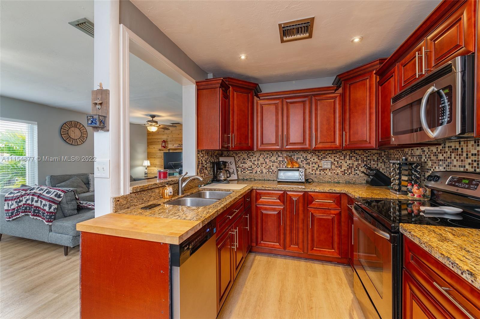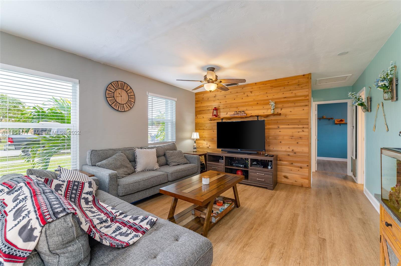 Beautiful 3/1 converted to a 2/1 to create a larger living room space/family area. New closet doors in bedrooms. Roof is 1 year old, accordion shutters throughout home and AC is 2 years old. Kitchen includes granite countertops with mosaic tile backsplash and stainless-steel appliances. Bathroom just remodeled this year, with brand new tile shower. Home was freshly painted 3 years ago, laminate flooring throughout. Large fenced in backyard with enough room to park vehicle or boat on either side. Stone walkway leading to large deck perfect for outdoor seating and BBQ. Full size washer/dryer in laundry room. This home also features security camera surveillance system for the next buyer.