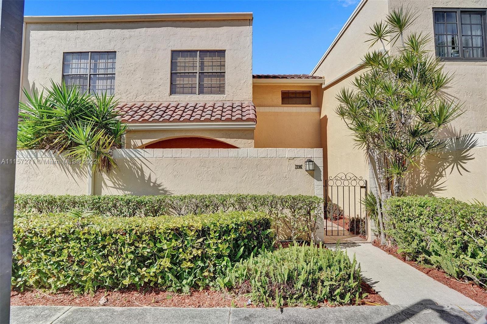 New on market, two-story townhome with large front and back private patios, spacious in-door living space is located in popular guard-gated Mariner Village on the Aventura Waterways marina. The kitchen has stainless steel appliances, modern lighting, granite countertops and opens to front patio. Larger than tax rolls living room per owner opens to large back patio. Flooring is tile downstairs, carpet upstairs. Spacious main bedroom has high ceilings, walk-in closet. Second bedroom upstairs has its own full bath. Guest bath downstairs. Washer/dryer downstairs. High speed Internet, cable with DVR, premium movie channels, and water all included. Walk to dining, parks, shops, houses of worship. Near Aventura Mall, Gulfstream Park. A-rated schools. Pet welcome. Dog park nearby. Okay to lease.