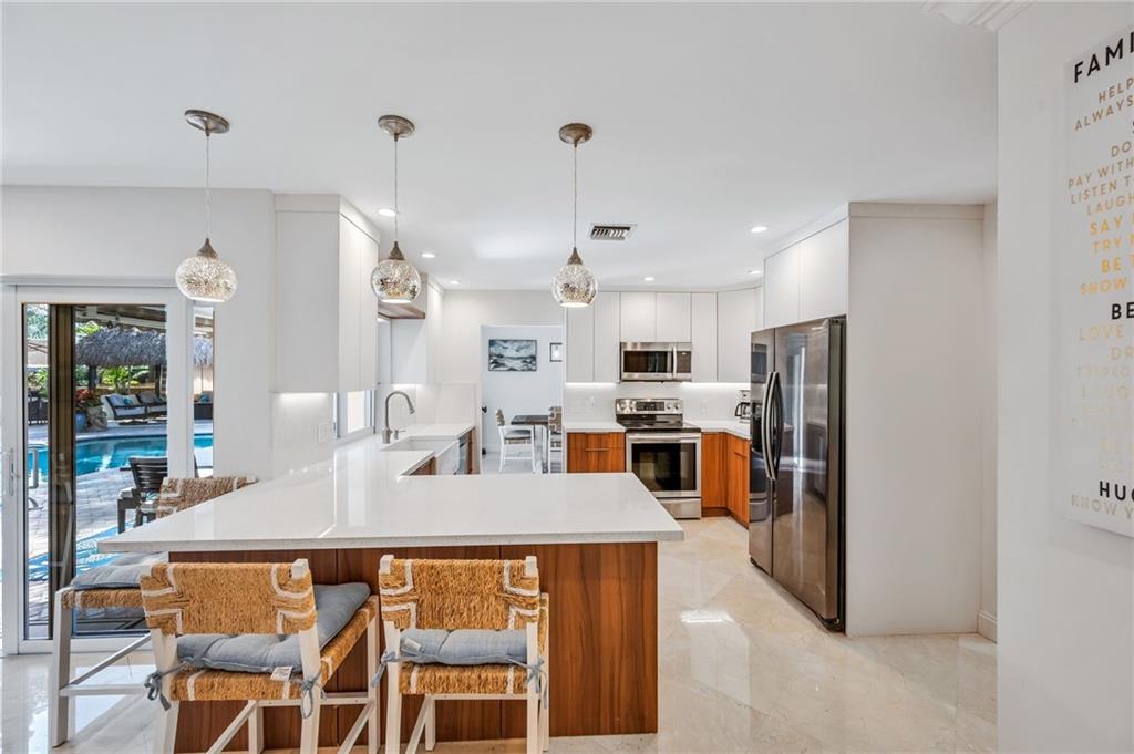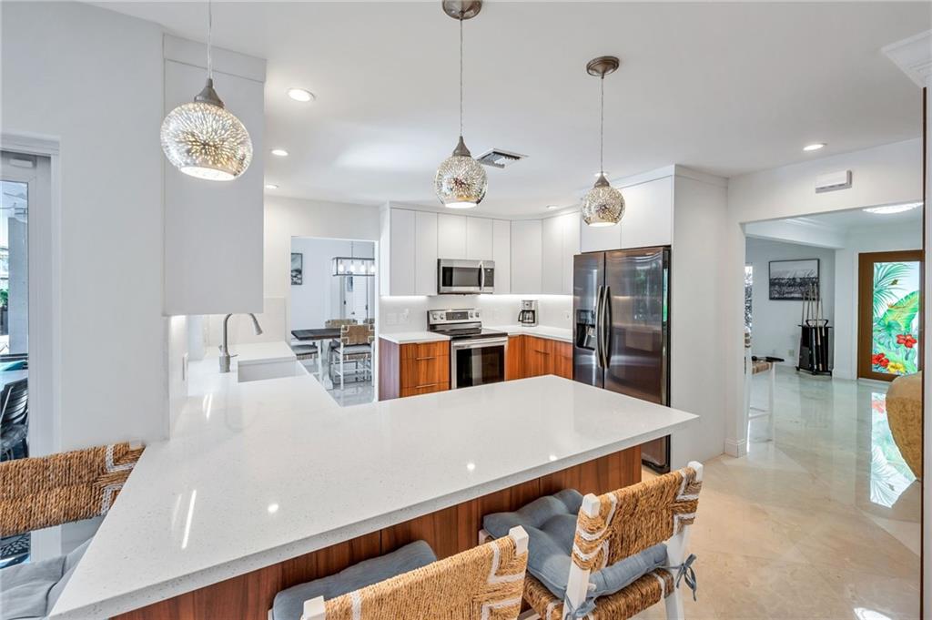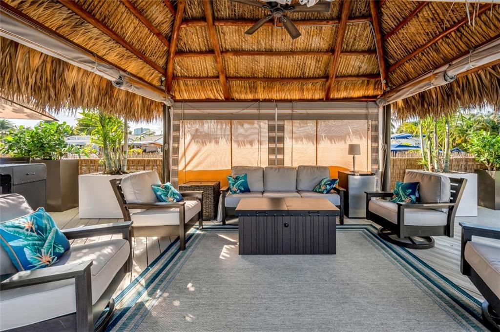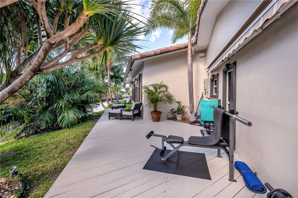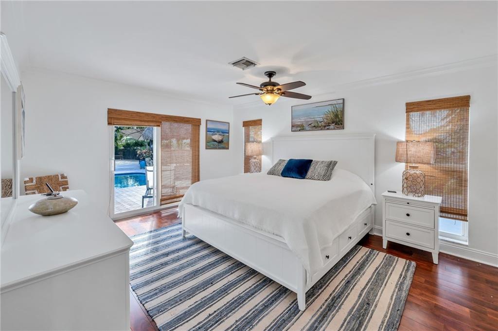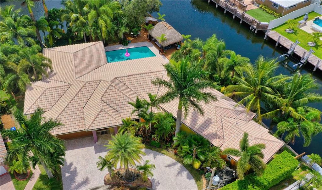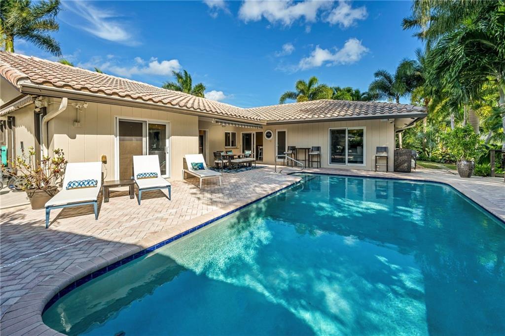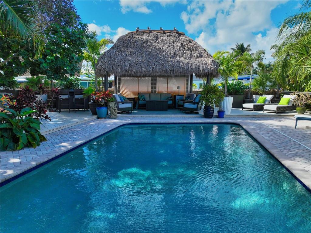 Spectacular, Lush, One of a Kind Waterfront Estate property w/ Tropical expansive decks surrounding Pool and poolside Tiki Hut, short walk to beautiful Beaches, Restaurants and LBTS Town Square. Contemporary style w/ 4 lg bedrooms /3 lovely baths, triple split plan. 2 amazing Master Suites: #1 = 1000sqft w/ 2 huge California walk-ins / Royal Master Bath, #2 = Large, en-suite w/ Pool view. Polished Marble and Wood Floors throughout the home. Stylish Kitchen w/ panoramic property views, open to Spacious Family Room. Whole house Generac w/warranty. Impact Windows / Doors, Custom Front Door, Garage impact door, new Level 2 Charging Station. Point lot, 240 ft of waterfront, 55 ft dock w/ electric & water, a Boater's Dream! Located on a cul-de-sac in The Landings, ULTIMATE Privacy, A RARE FIND!