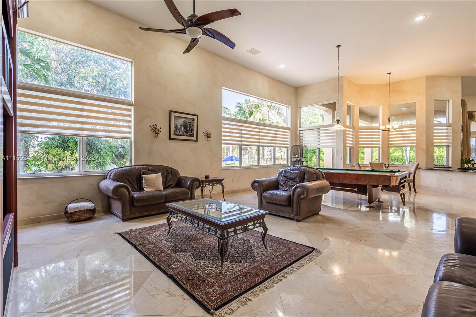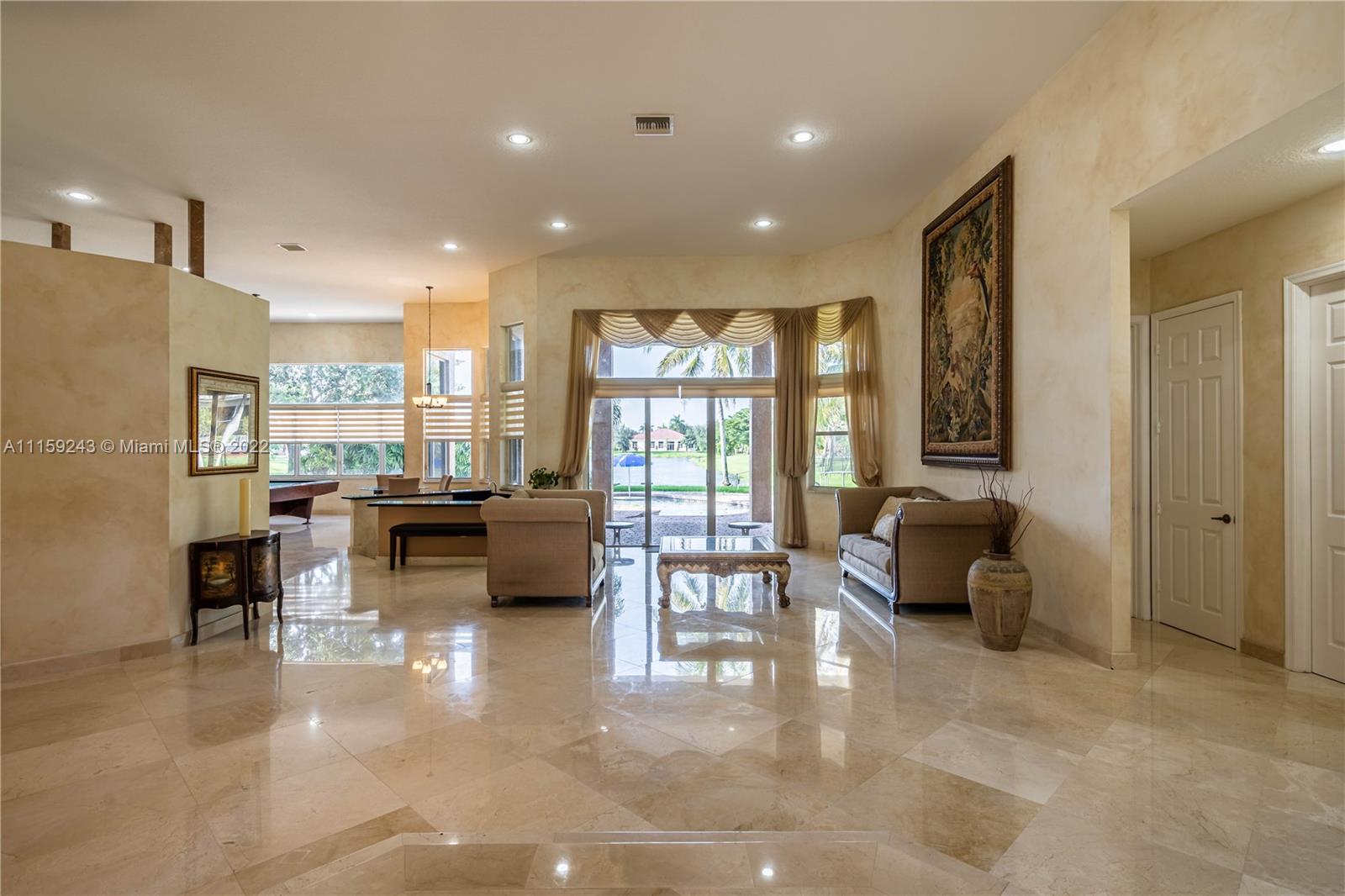 YOUR BEAUTIFUL HOME AWAITS! Spectacular 4/4 (plus 5th room for office/den) with a backyard that boasts an amazing beach entry pool, with a waterfall and massive lake. This lushly landscaped home has privacy in the front of the house, (there is a hill separating the street from Orange Drive) and the back, because of the long lake. Upon entering this home, it showcases soaring ceilings and natural lighting with impressive views of the pool and lake and Stunning Crema Marfil Marble throughout, except the bedrooms. Pool is being completely redone. Home needs TLC and seller is motivated and flexible. Excellent schools. 24 hour notice required.