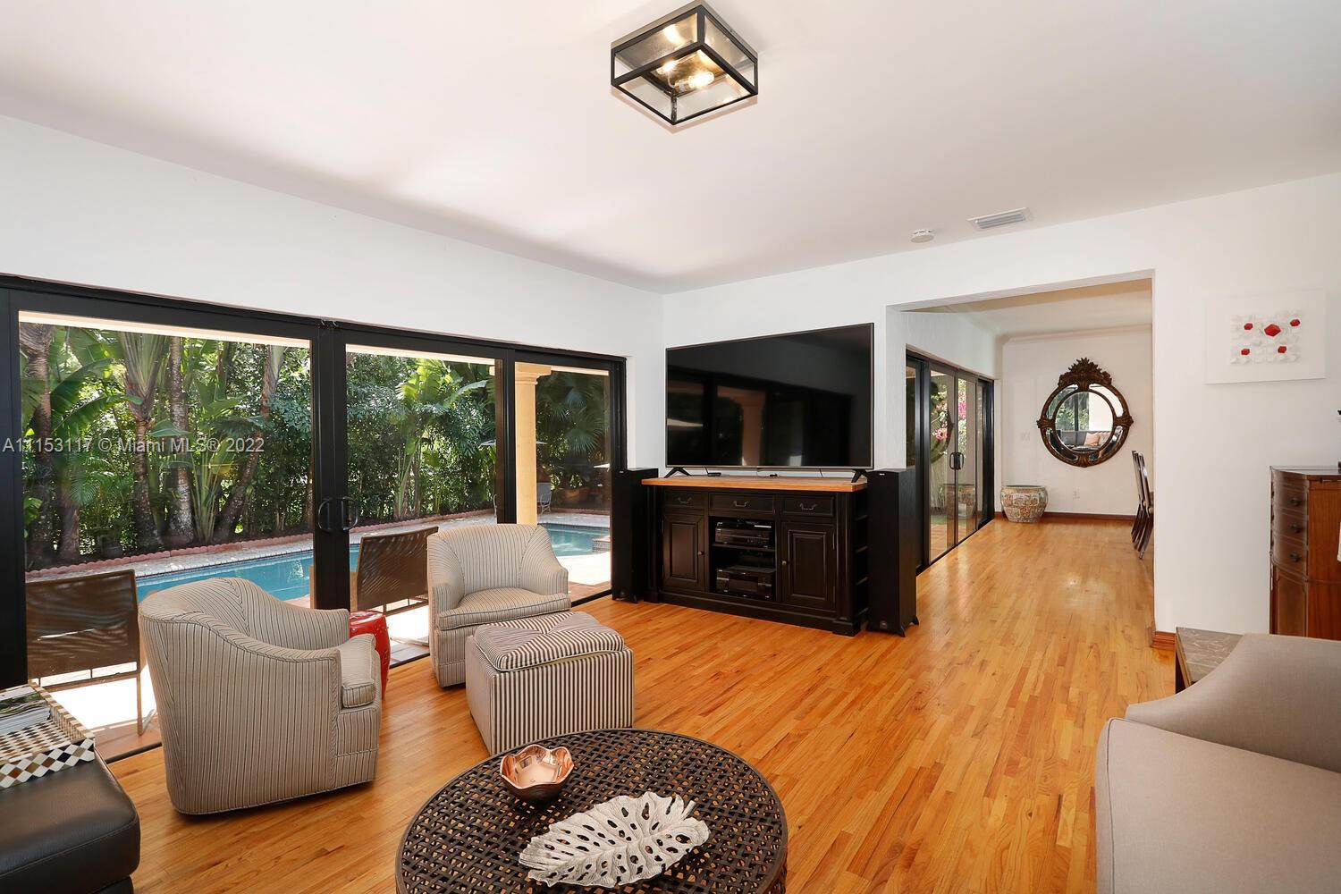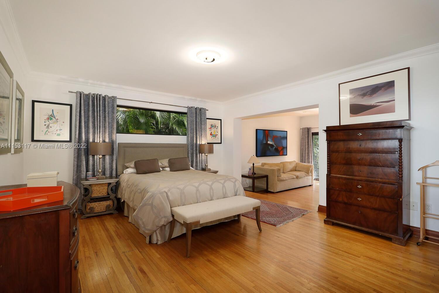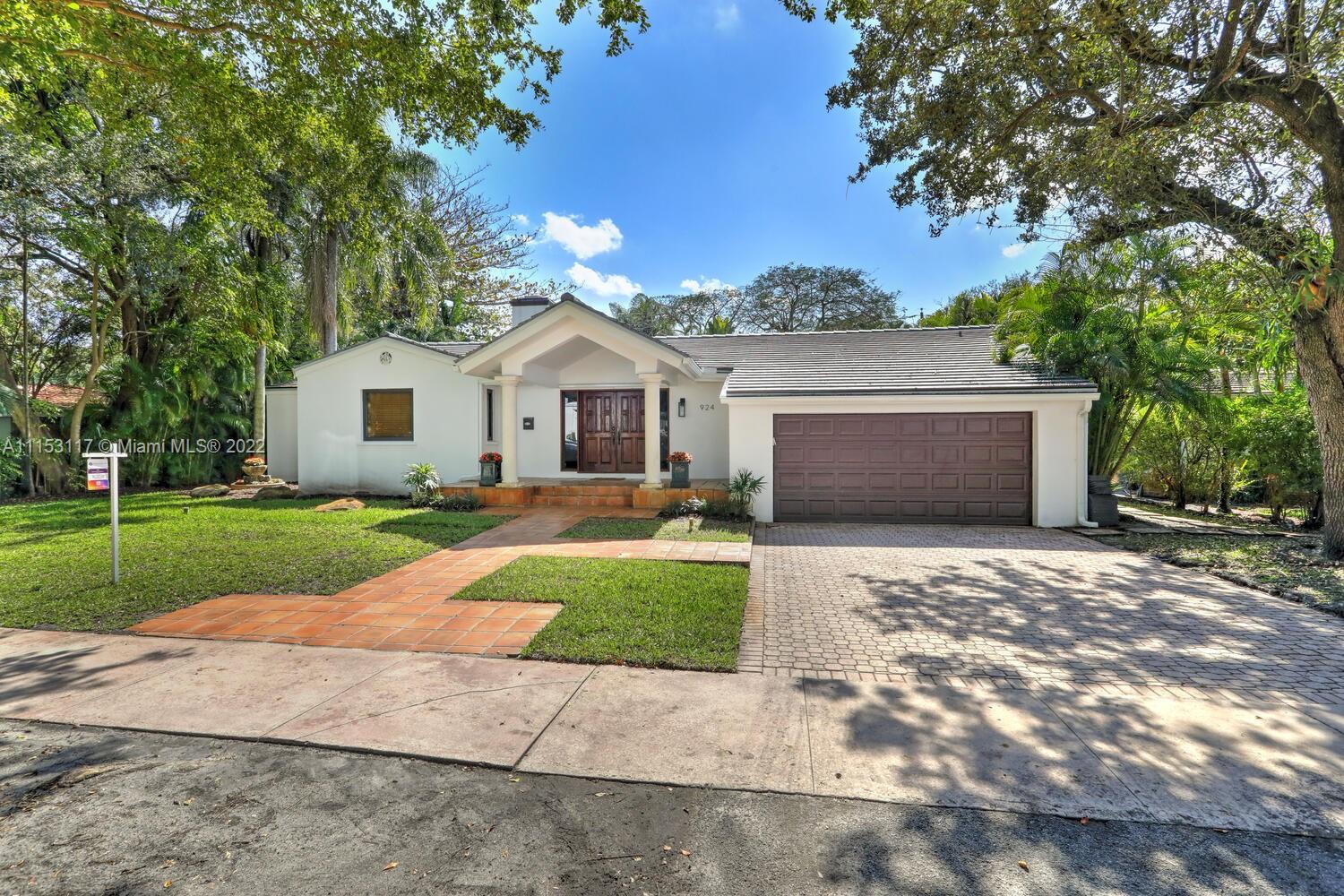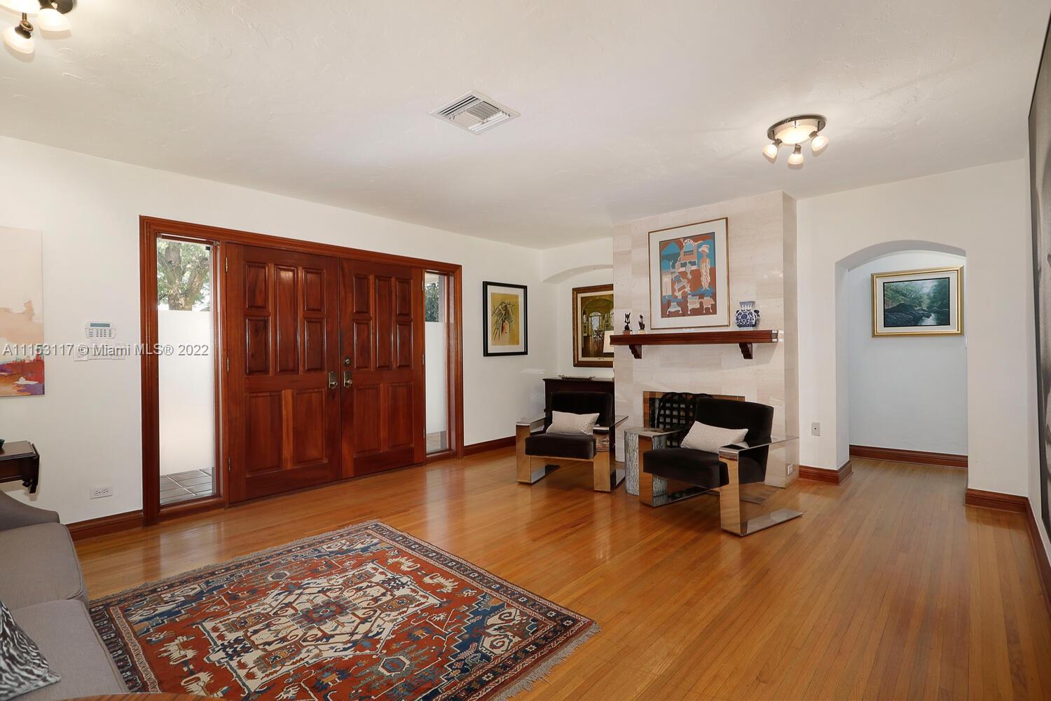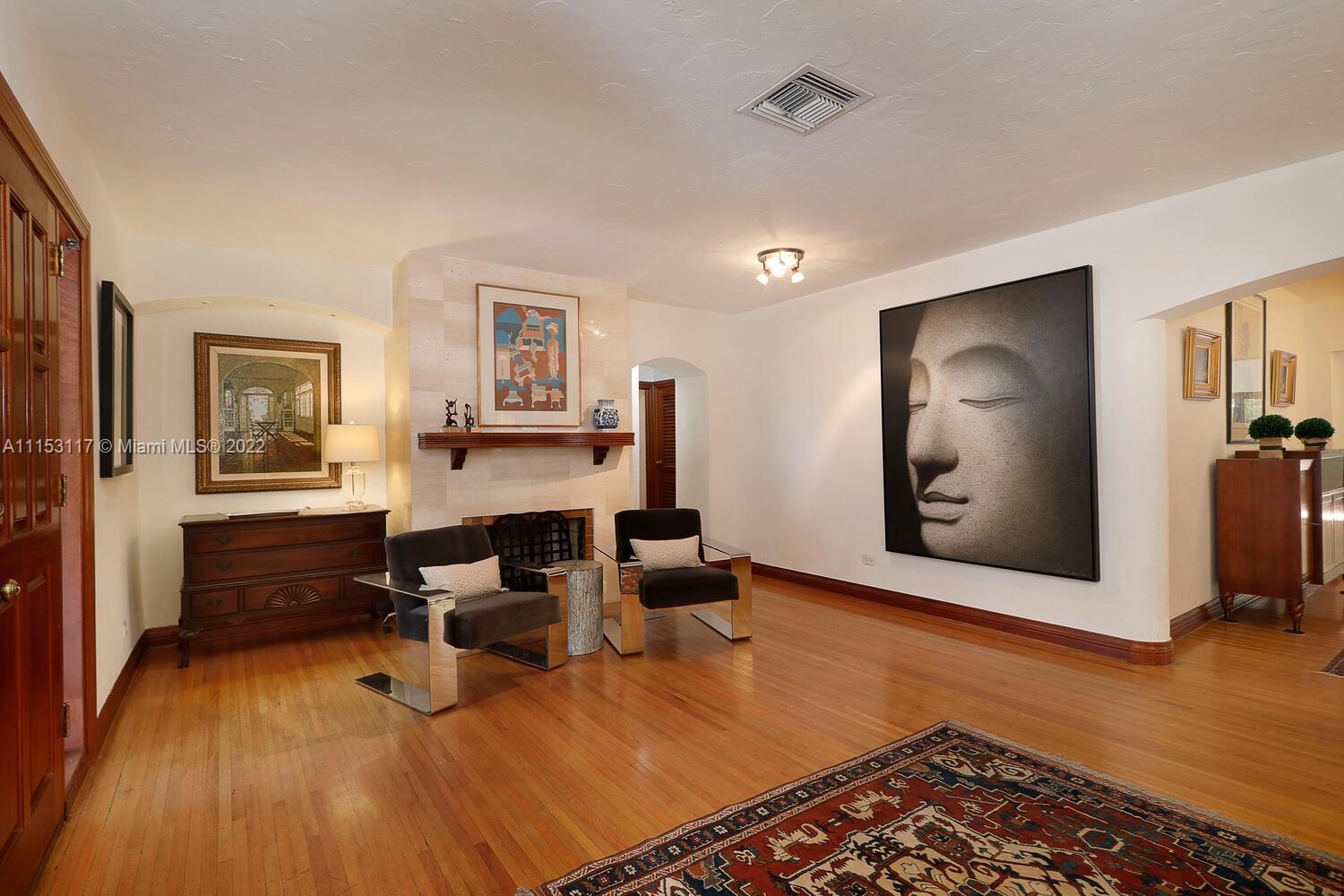 A 4 bedroom 4 bathroom Coral Gables home with pool and 2 car garage has an oversized 13,000 sqft. lot. The spacious kitchen has stainless steel appliances, cooking island and large pantry. The home features hardwood floors, working fireplace, large entertaining terrace overlooking the pool, sauna, and master bedroom sitting area. One bedroom is split from the rest and is ideal for a guestroom, housekeeper, or office. TWO BONUS SPACES one used as a small gym the other as an office. NEW (2021): roof, impact windows & sliding glass doors, sprinkler system, and alarm system. The home is ideally located on a quiet tree lined street a few blocks away from the Venetian Pool and Biltmore Hotel & Golf Course and minutes drive to Granada Golf Course and the Shops at Merrick Park.