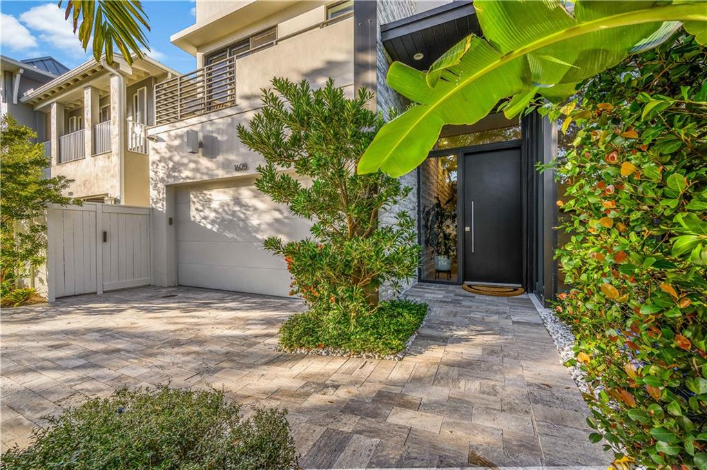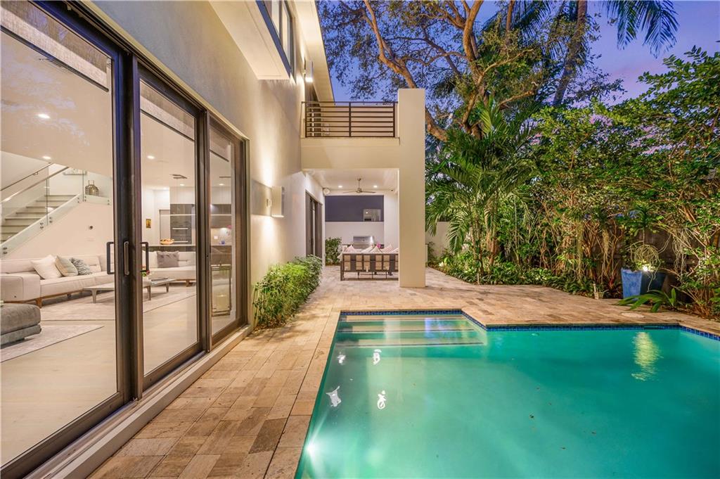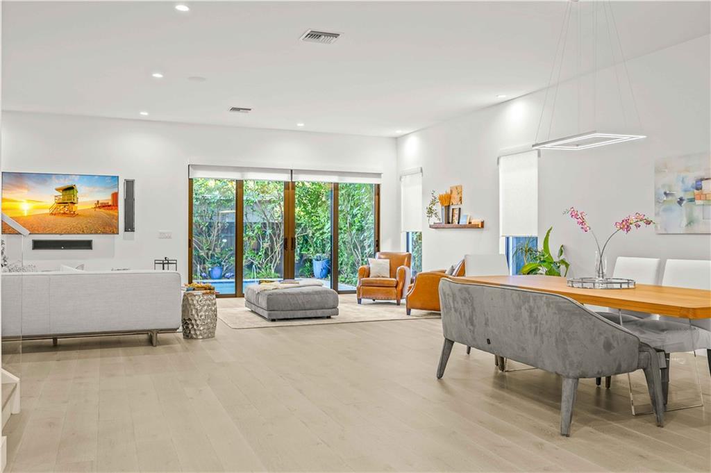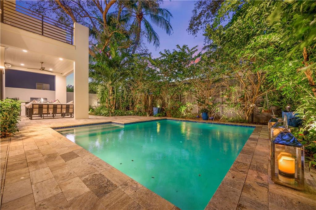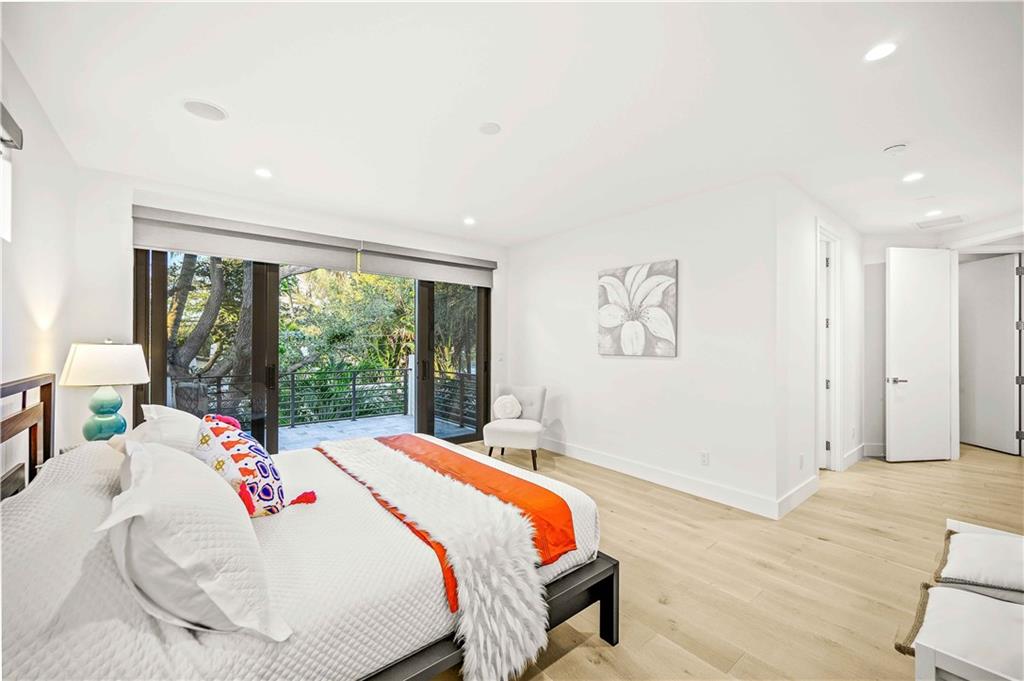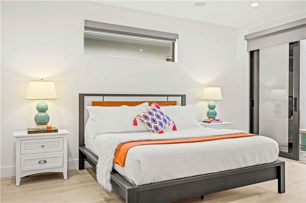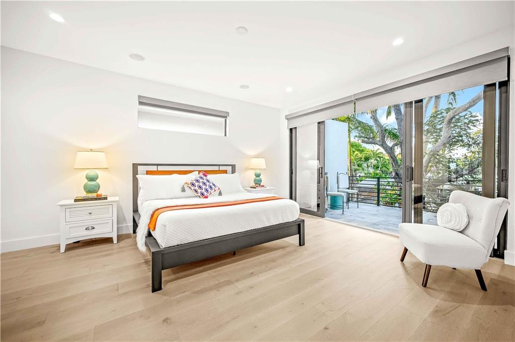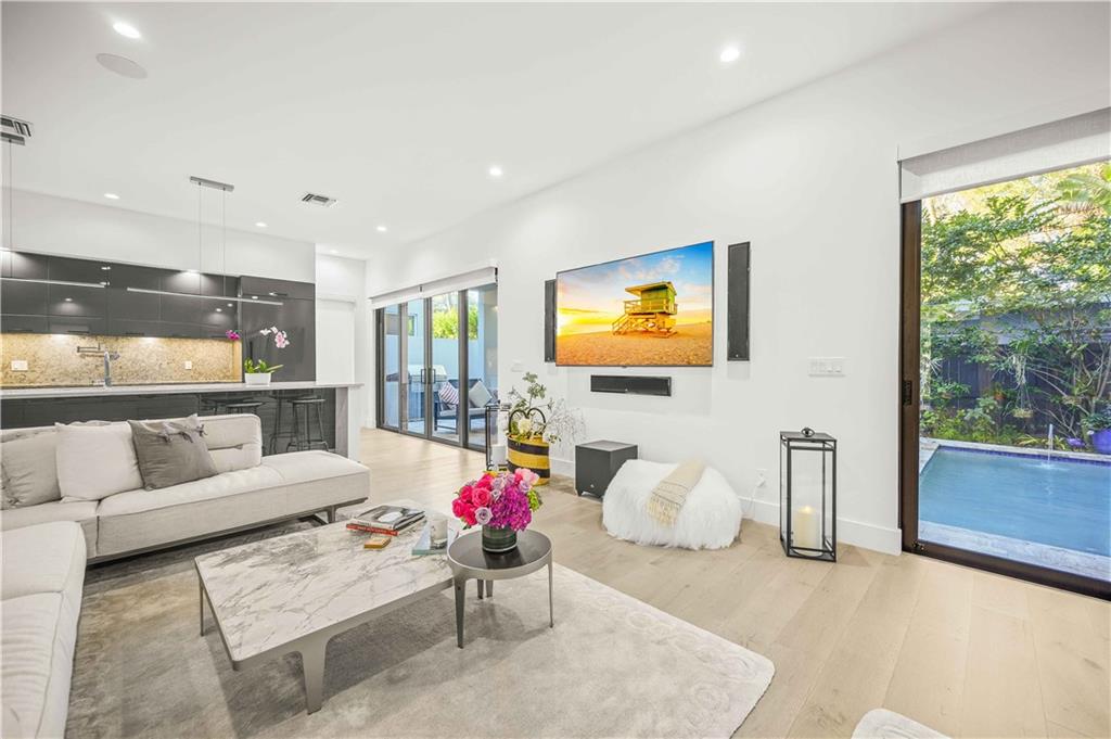 This is a modern, sophisticated single family residence built new in 2019. Features include high ceilings, walls of sliding glass, four bedrooms and a home office, a roofed patio, a pool surrounded by fenced gardens and mature landscaping. Generously proportioned guest rooms have large closets. Most have balcony access. The primary suite features a soaking tub, separate shower and two finished walk-in closets. The sleek kitchen allows seating and entertaining around a grand center island plus a wine chiller. Music, television, climate, security and window blinds are Smart Phone automated. An outdoor kitchen offers an additional serving area. This home is semi-attached by a garage storage room to the house next door with no common walls between living spaces.