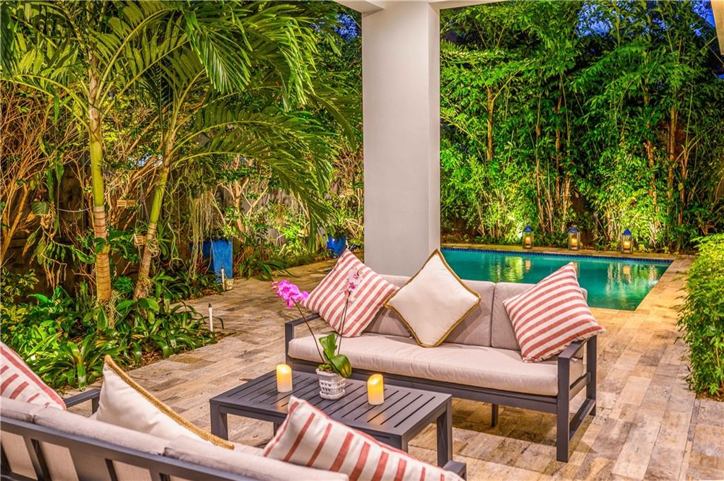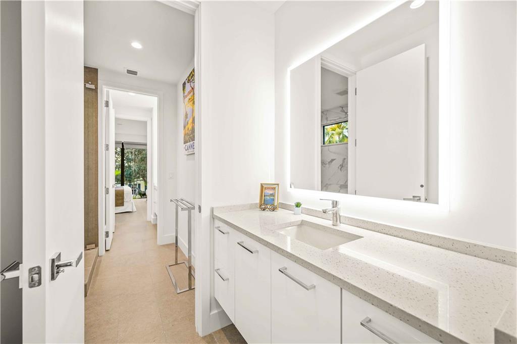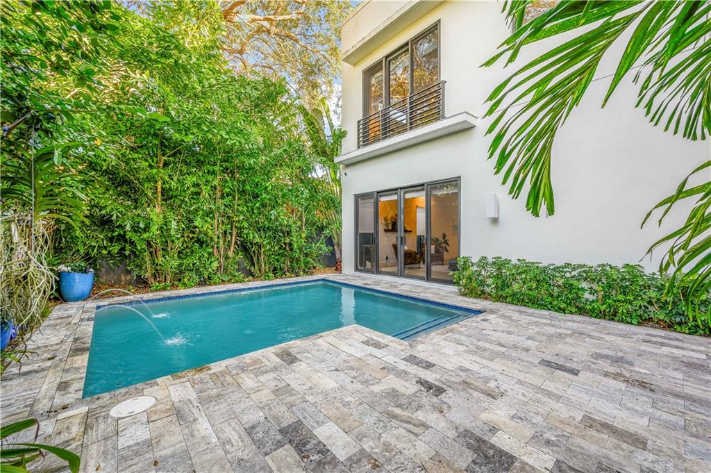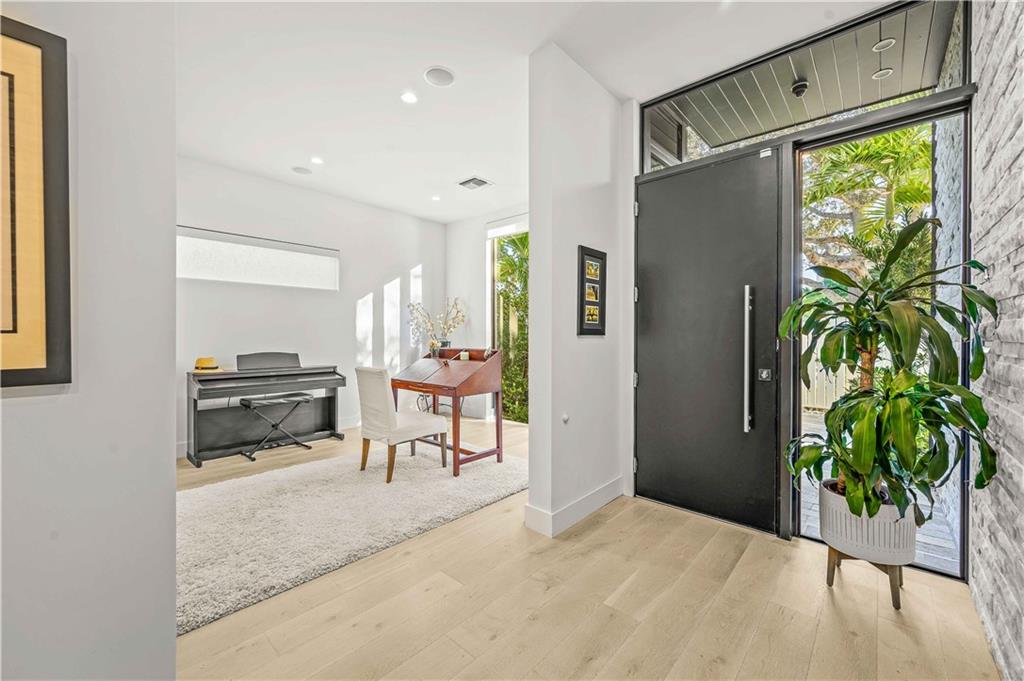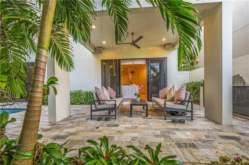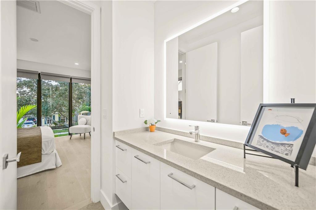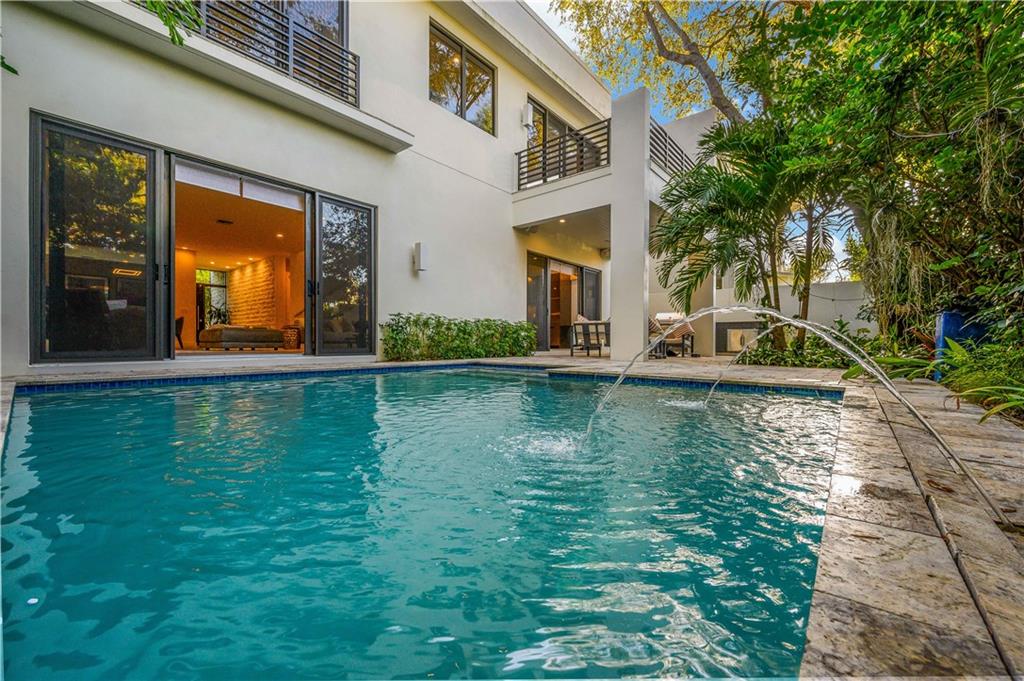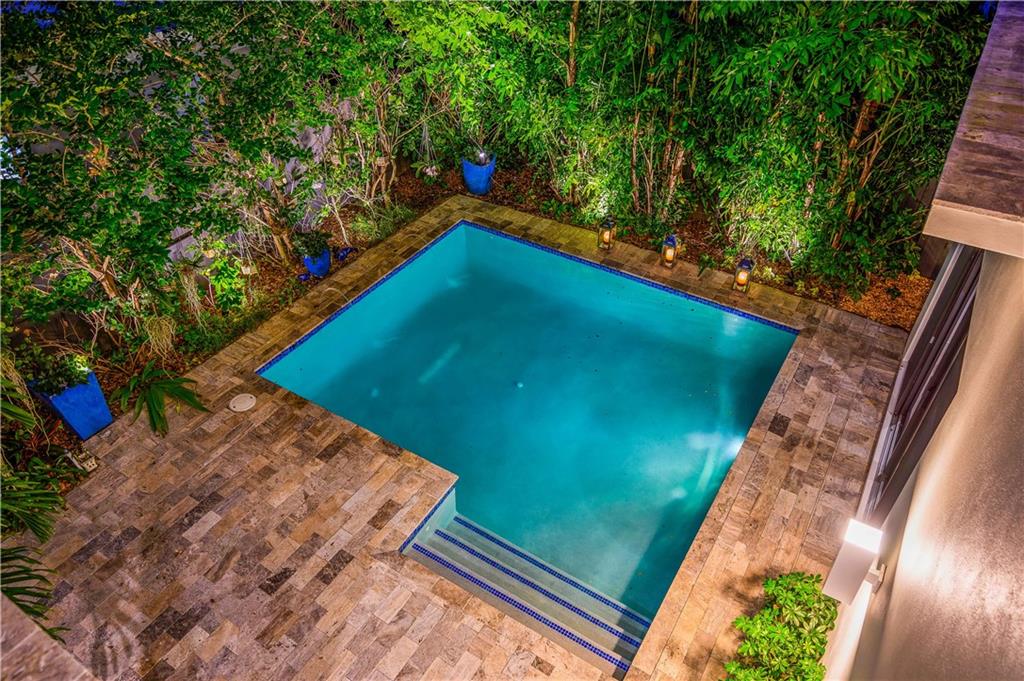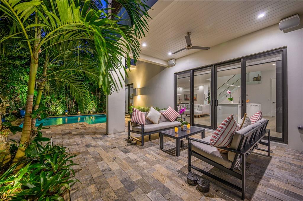 This is a modern, sophisticated single family residence built new in 2019. Features include high ceilings, walls of sliding glass, four bedrooms and a home office, a roofed patio, a pool surrounded by fenced gardens and mature landscaping. Generously proportioned guest rooms have large closets. Most have balcony access. The primary suite features a soaking tub, separate shower and two finished walk-in closets. The sleek kitchen allows seating and entertaining around a grand center island plus a wine chiller. Music, television, climate, security and window blinds are Smart Phone automated. An outdoor kitchen offers an additional serving area. This home is semi-attached by a garage storage room to the house next door with no common walls between living spaces.