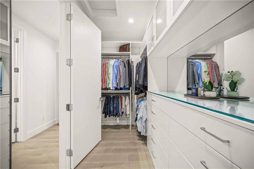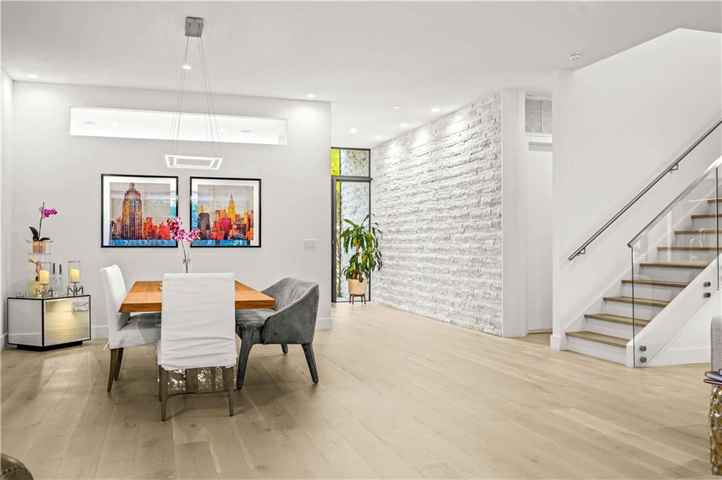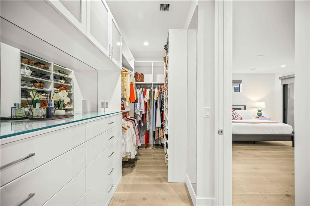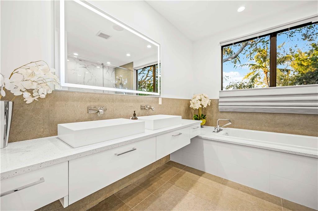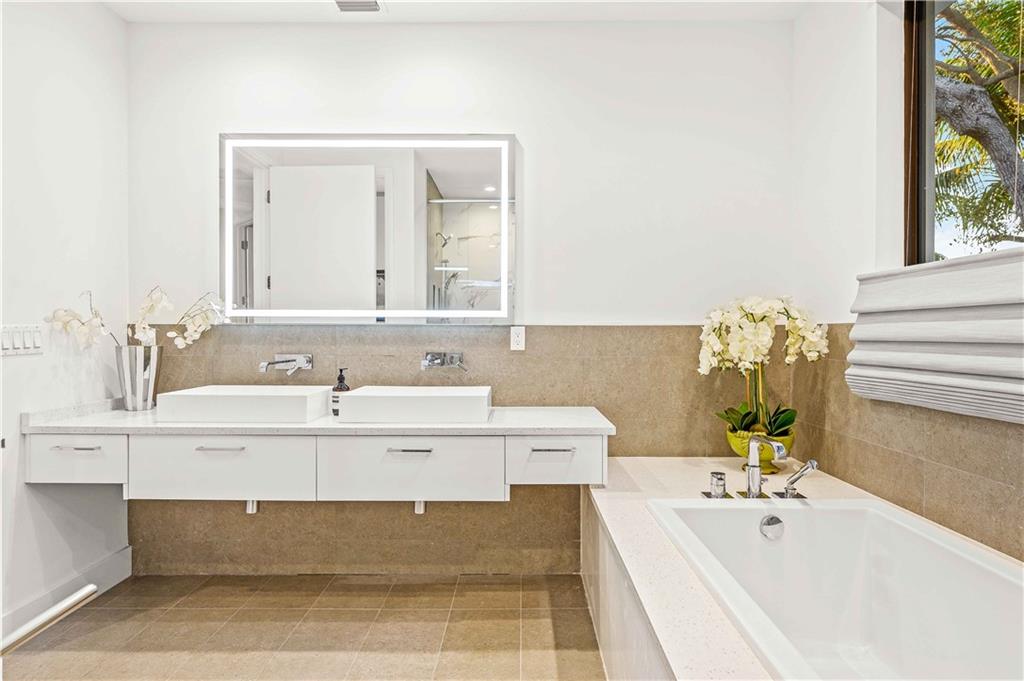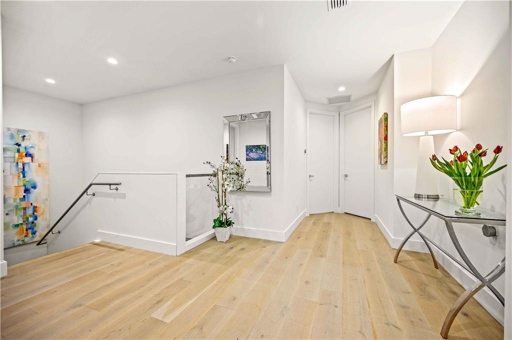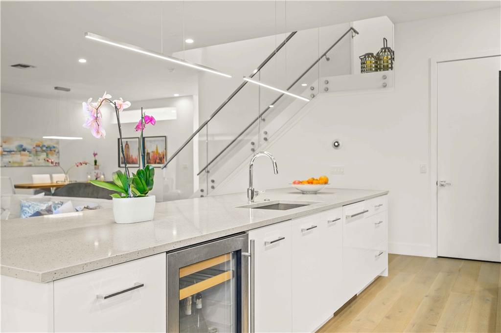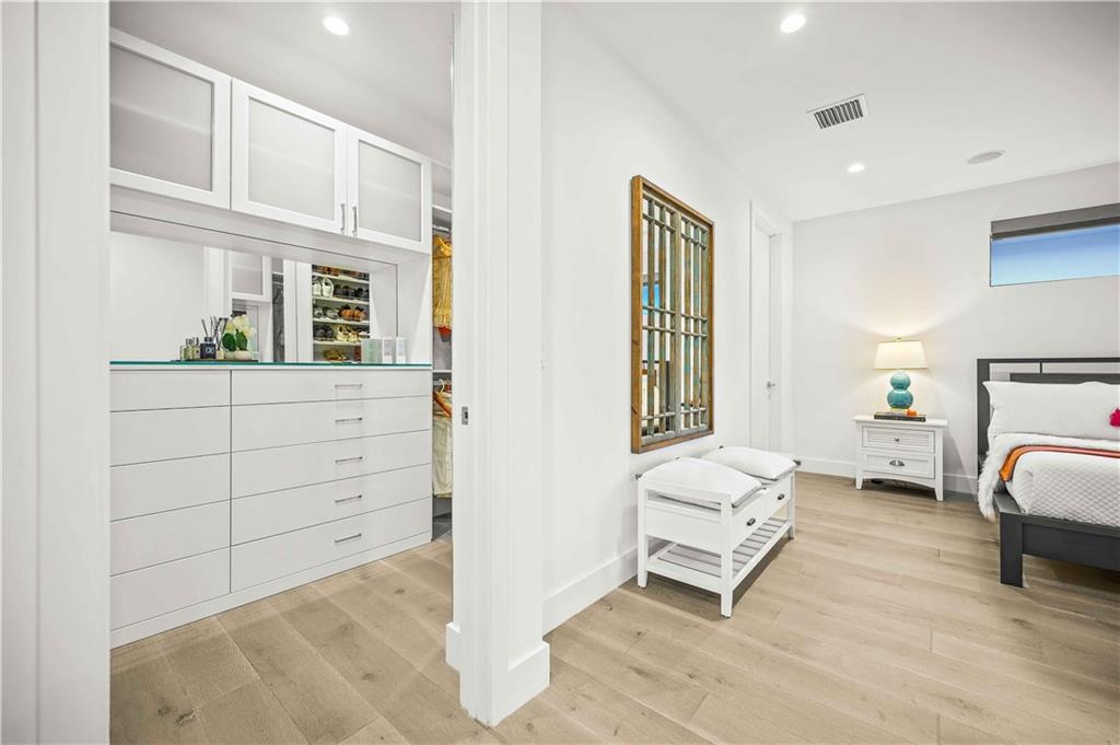 This is a modern, sophisticated single family residence built new in 2019. Features include high ceilings, walls of sliding glass, four bedrooms and a home office, a roofed patio, a pool surrounded by fenced gardens and mature landscaping. Generously proportioned guest rooms have large closets. Most have balcony access. The primary suite features a soaking tub, separate shower and two finished walk-in closets. The sleek kitchen allows seating and entertaining around a grand center island plus a wine chiller. Music, television, climate, security and window blinds are Smart Phone automated. An outdoor kitchen offers an additional serving area. This home is semi-attached by a garage storage room to the house next door with no common walls between living spaces.