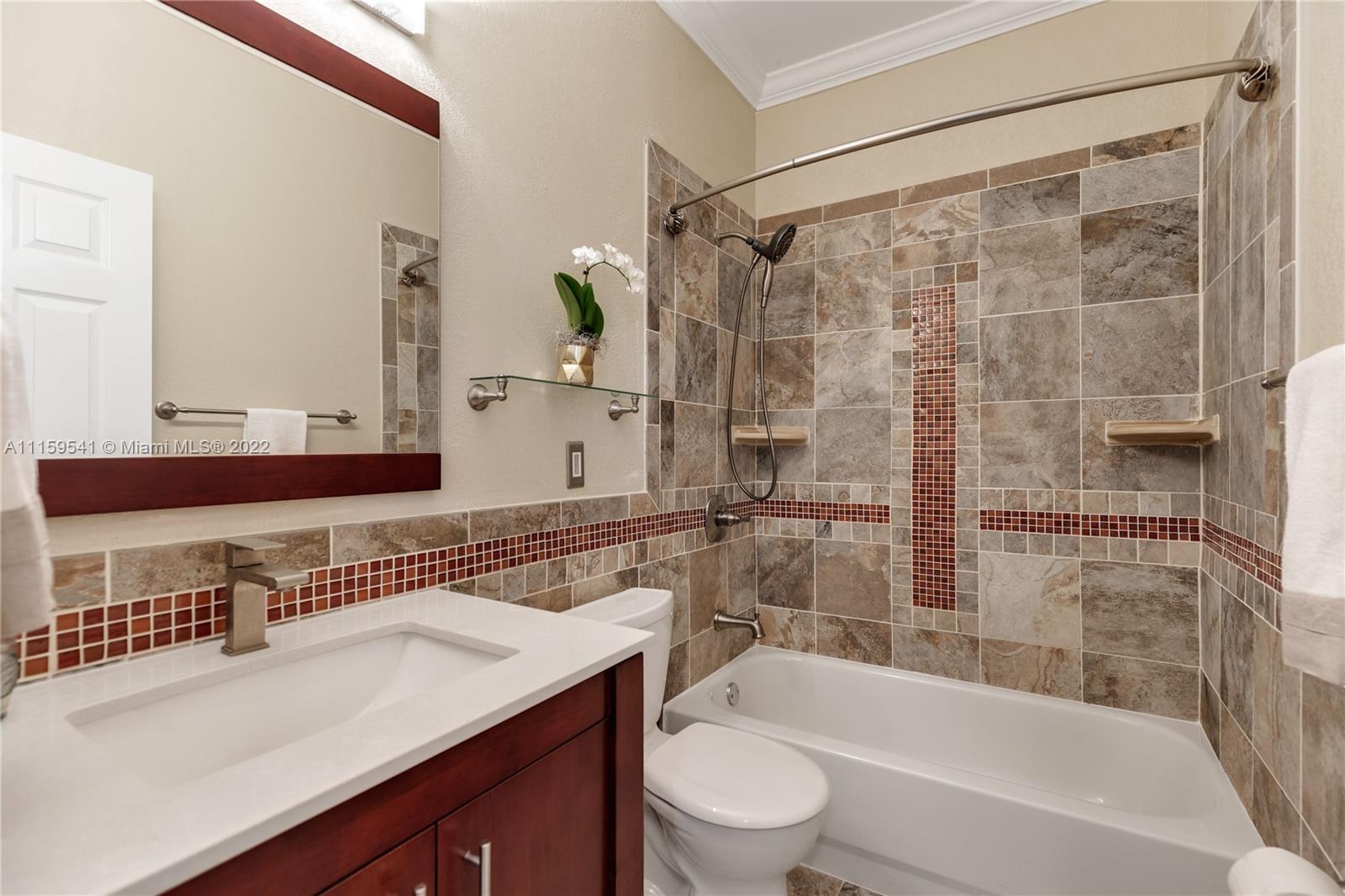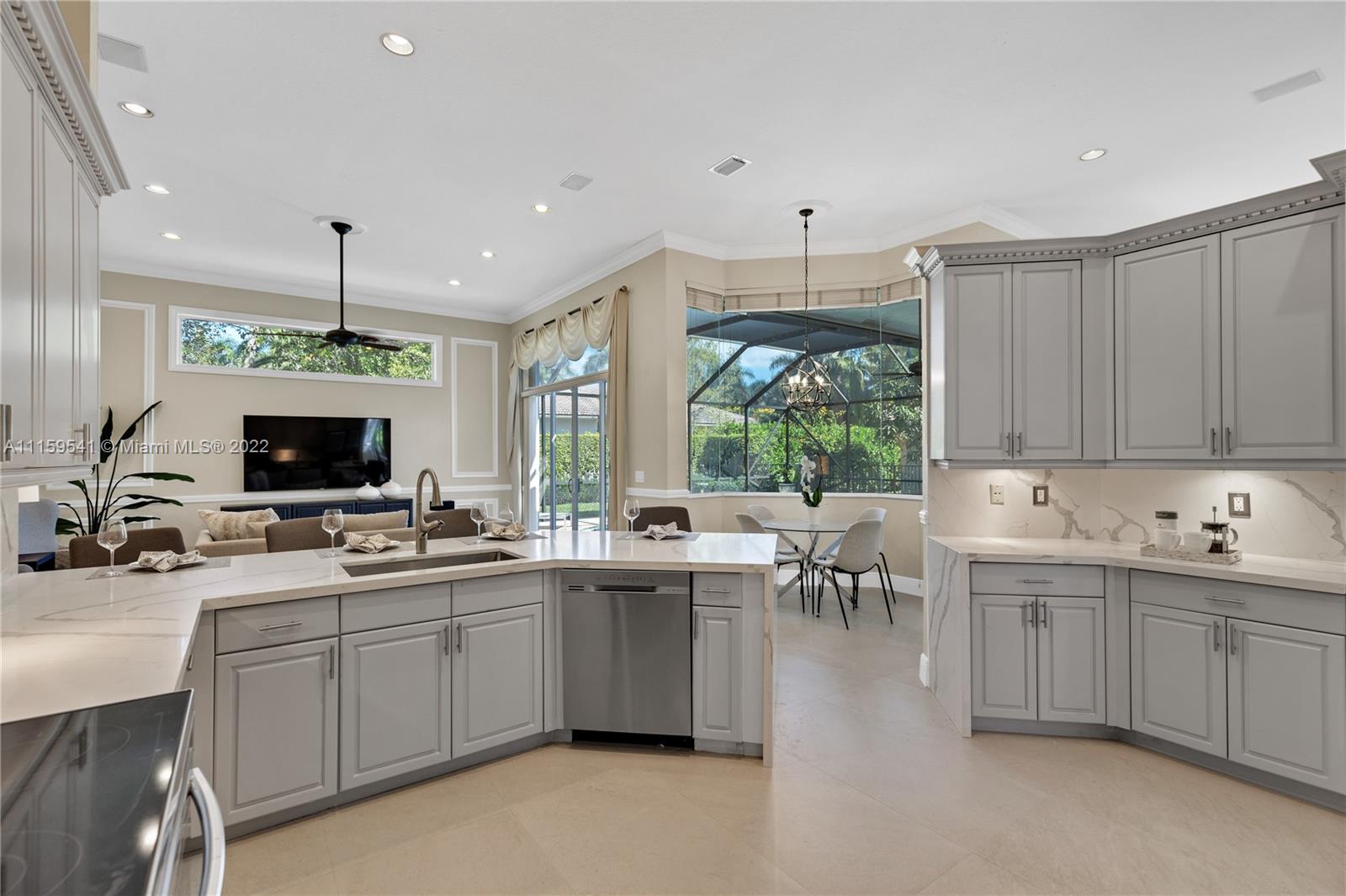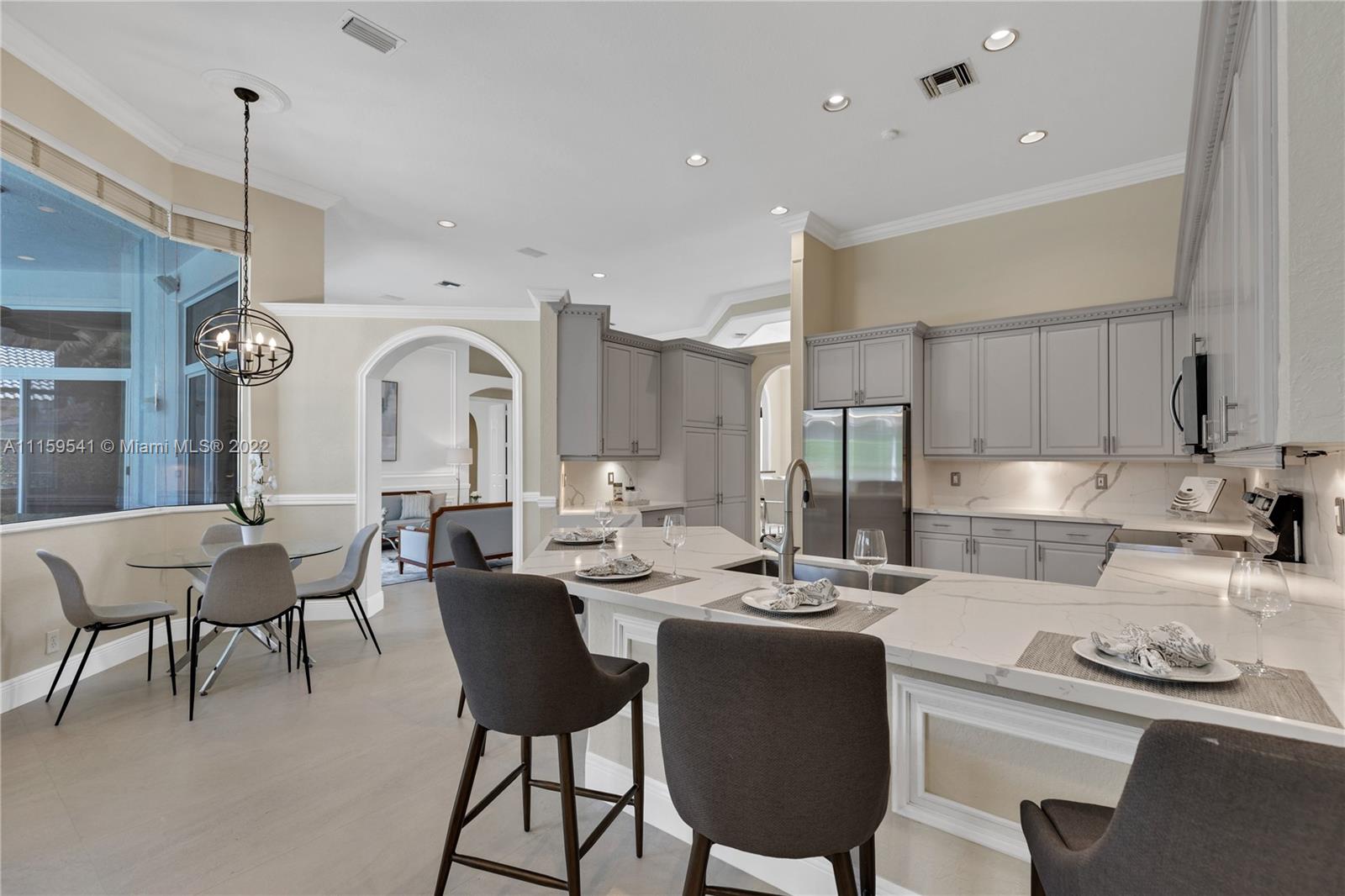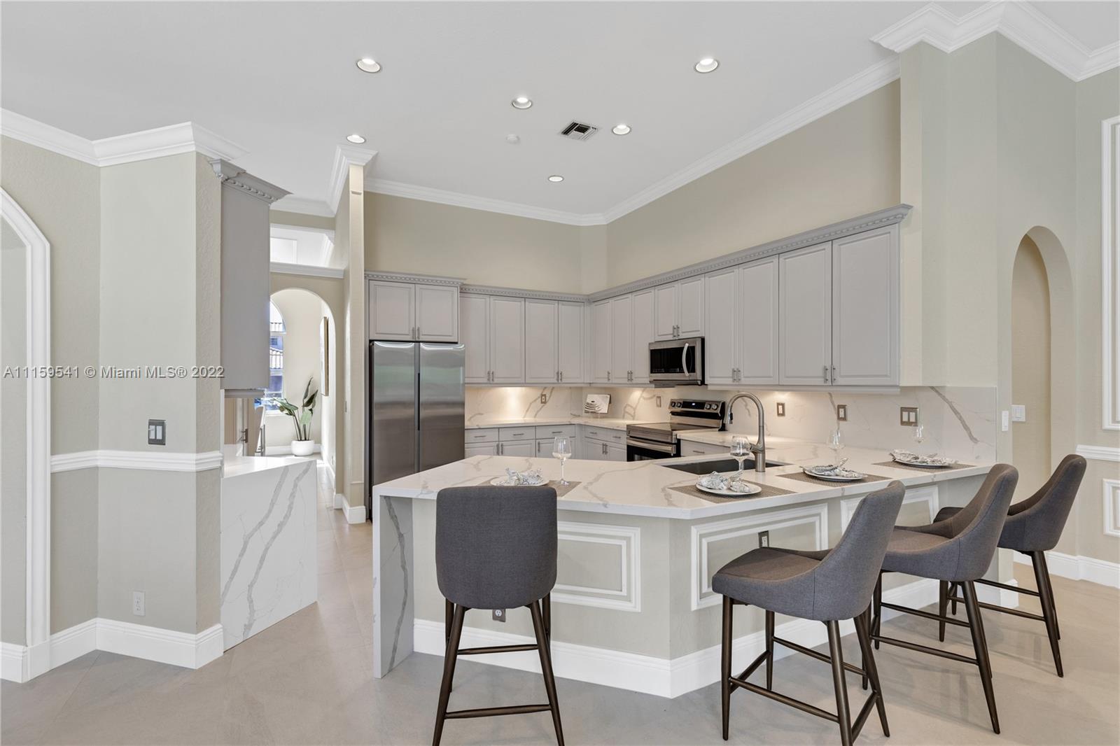 Spectacular one story contemporary home located in the prestigious gated community of Weston Hills Country Club. This home features a split floor plan with volume ceilings with 5 bedrooms, 4 1/2 baths plus an office/den and a 3 car garage. Brand New roof completed in 2021, Impact windows in main doors and accordion hurricane shutters throughout. Masterfully renovated kitchen with quartz counter tops and brand new appliances. Oversized master bedroom with sitting area with a spa-like master bath. Fully fenced private backyard with pool and large screen patio that offers that secluded and tranquil retreat that buyers crave today. New european porcelain floors throughout, engineered wood floors in all bedrooms. Parks and Golf around the corner. A must see in Weston! A+ schools.