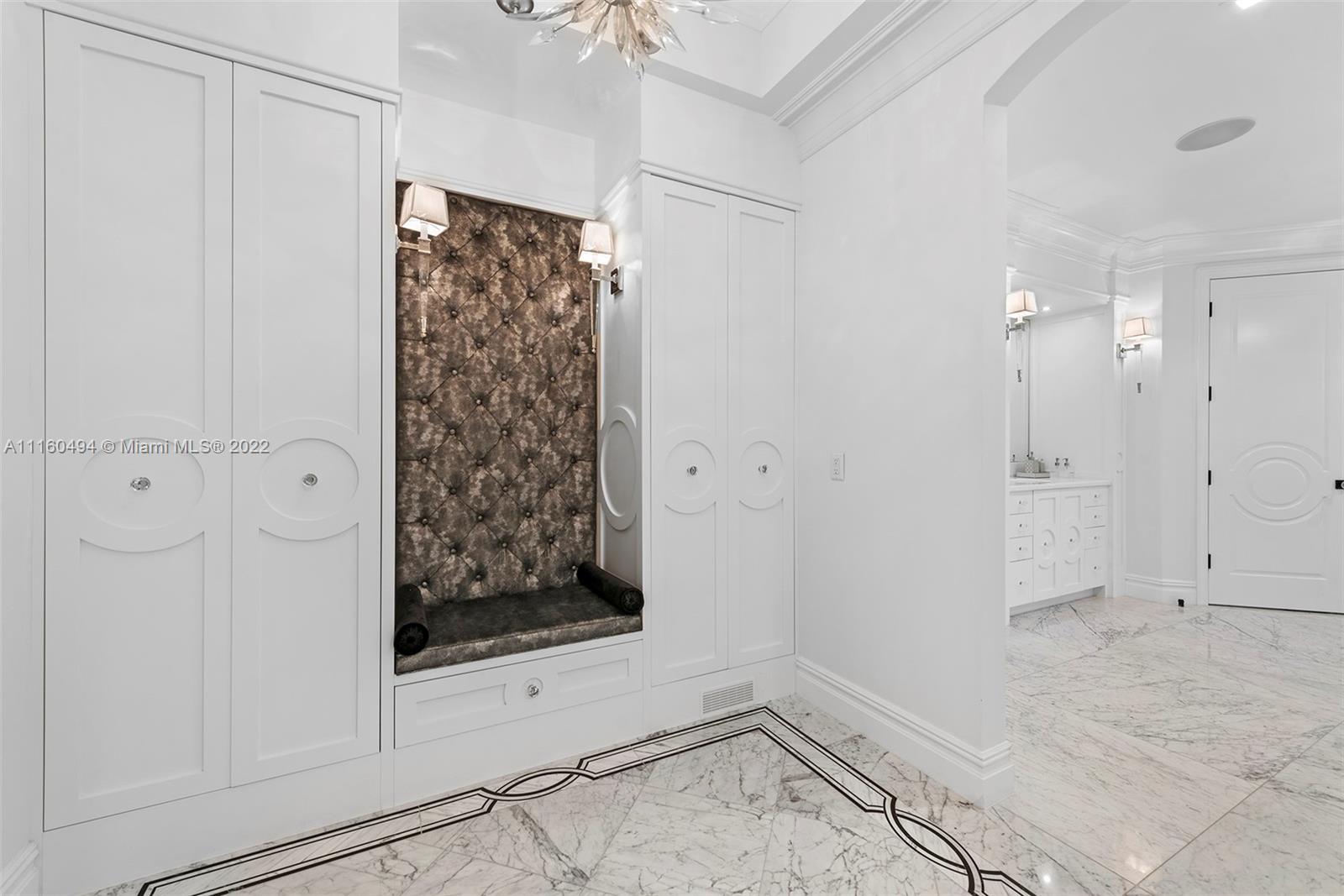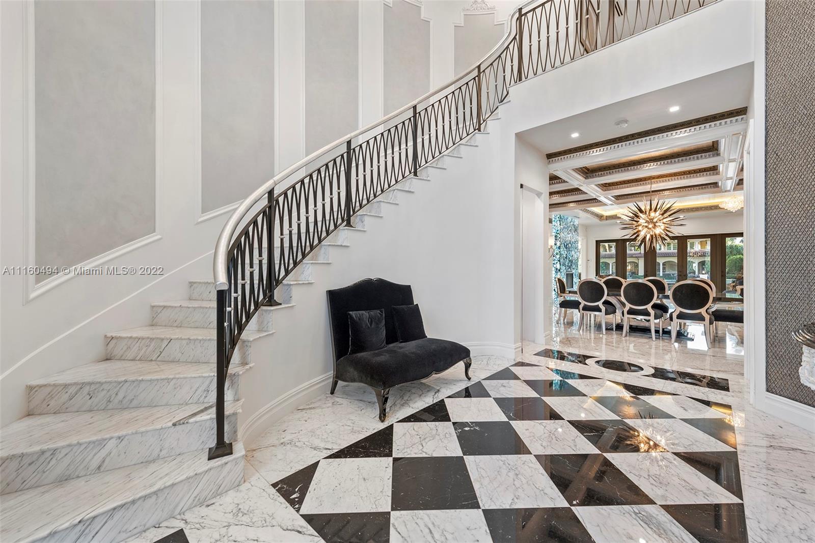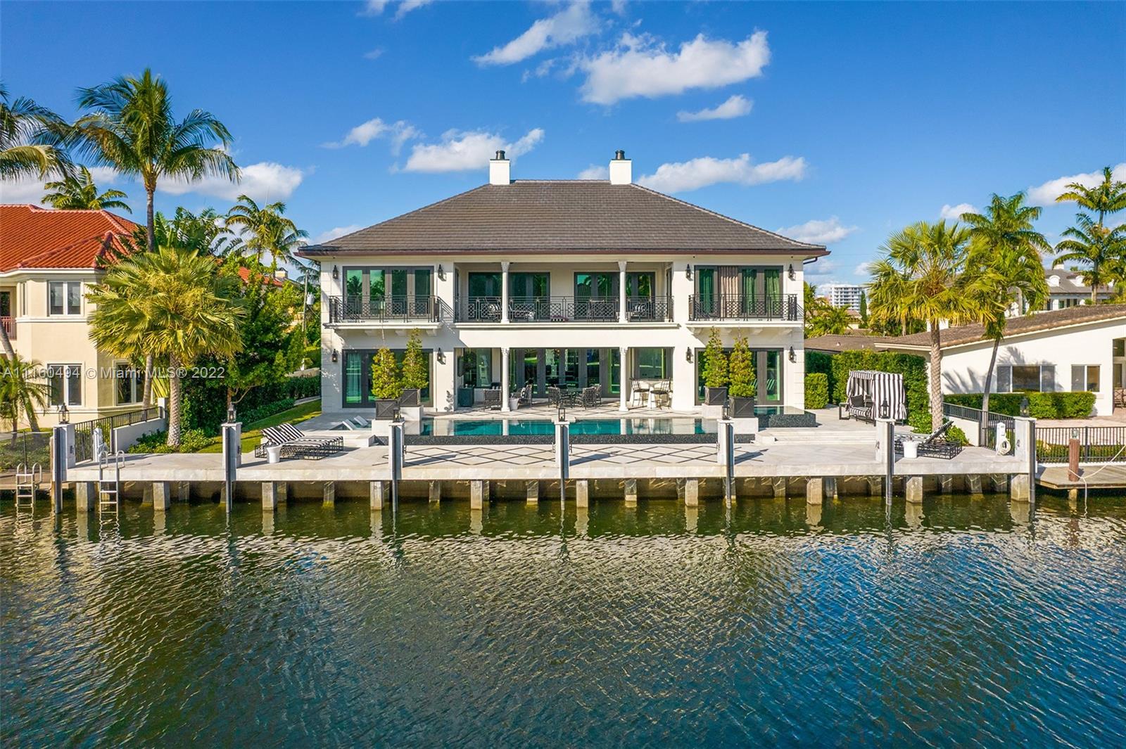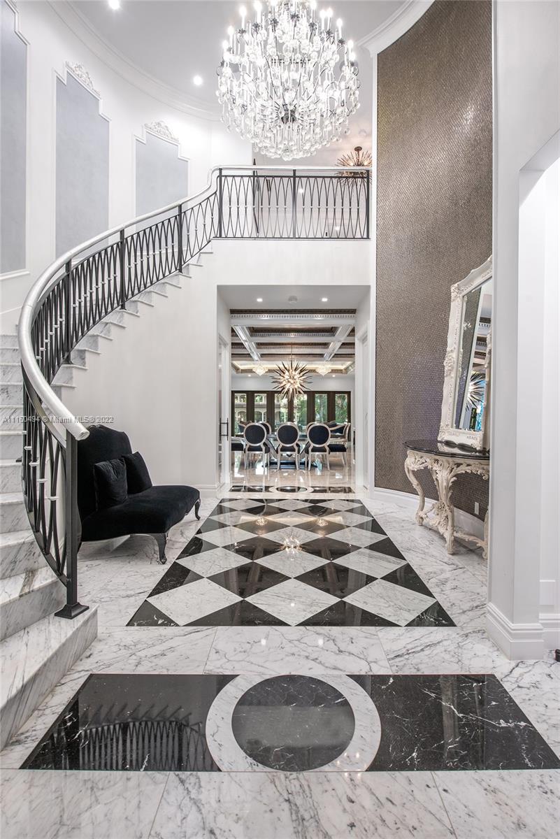 A custom, brand new one of a kind masterfully created waterfront mansion in the heart of Seven Isles, Ft. Lauderdale, the yacht capital of the world. No expenses spared in this timelessly designed home featuring a grand double height entryway, a thoughtful floorplan, oversized rooms, and a grand master chefs kitchen with double Nero Portoro marble islands with rare gold lining. Amenities include a quartzite bar rivaling your best local commercial bar, a movie theatre fit for royalty, a snow marble backyard and 90 ft boat dock, and a breathtaking infinity tiled pool and jacuzzi making this oasis complete. The principle quarters open up by double doors spanning the whole width of the home to a private foyer with a warm large bedroom, and two massive walk in closets. Offered turnkey furnished
