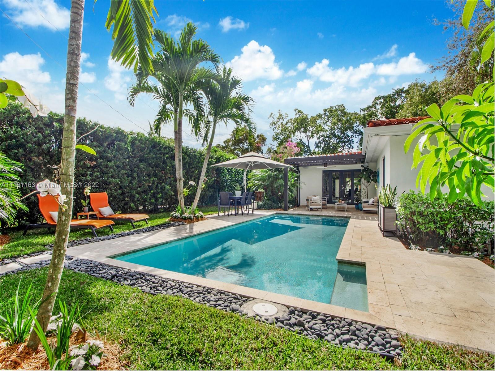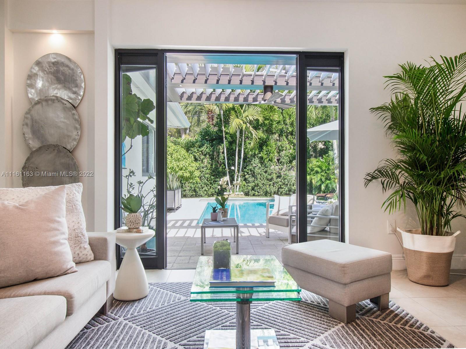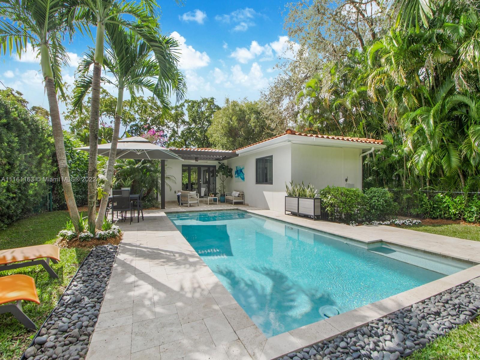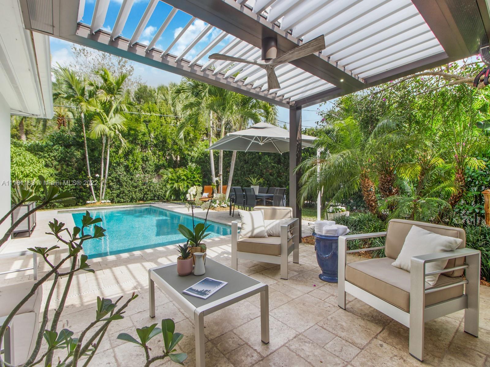 Nested in the heart of Coral Gables, walking distance to Miracle mile, the Biltmore or Venetian pool w/close access to top schools, this exquisite, bright completely remodeled open floor plan home offers panoramic view to an expansive Aqualink salted smart pool surrounded by abundant tropical foliage giving you total privacy. Entertain any time of the year under the motorized Equinox Louvers Pergola, Enjoy a private outdoor shower or savor a delicious juicy mango from the king of the garden while listening to music anywhere. Organize family cooking events in the large open kitchen w/abundant storage. Feel secure in this hurricane proof home equipped w/impact windows & doors, alarm & Schlage Home system control access and propane generator. Space to build addtl bed/ba