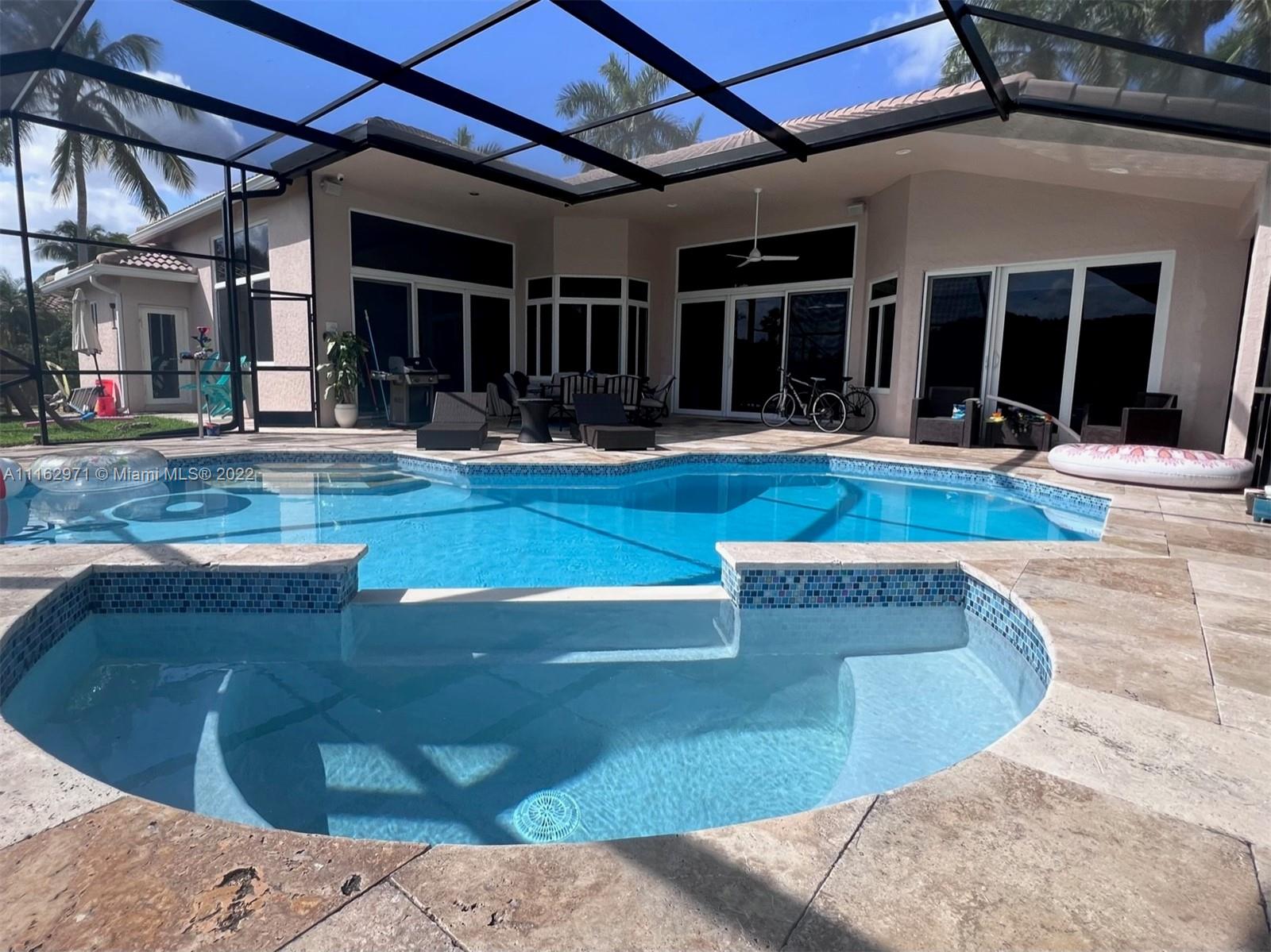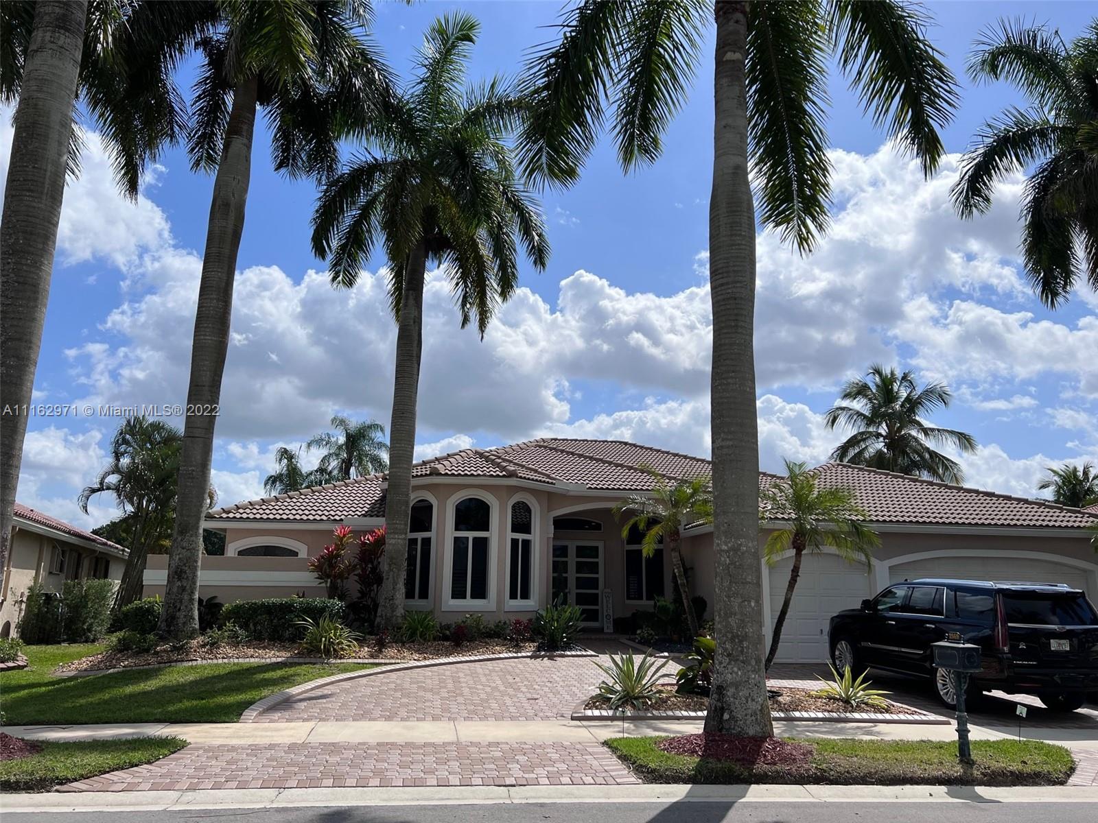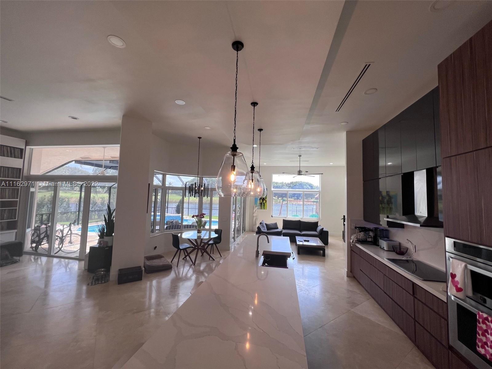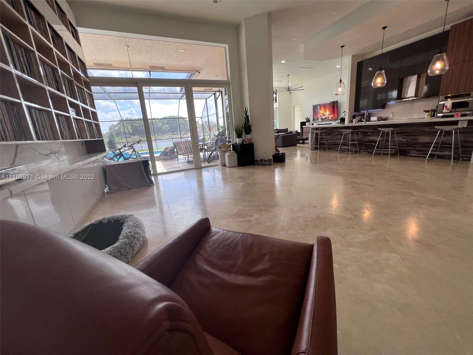 Exceptionally modern 5-3 One-story home with a 3 car garage, screened pool with fabulous lake and golf course view in exclusive gated Weston Hills CC. 12-15 feet volume ceilings, custom wood kitchen cabinets, stainless steel appliances, Calcutta countertops, and marble floors throughout. The 5th room is a den, which can be used as a small bedroom. Over-sized screened pool deck & heated diamond Brite pool, spa, and waterfall overlooking the lake and golf course.