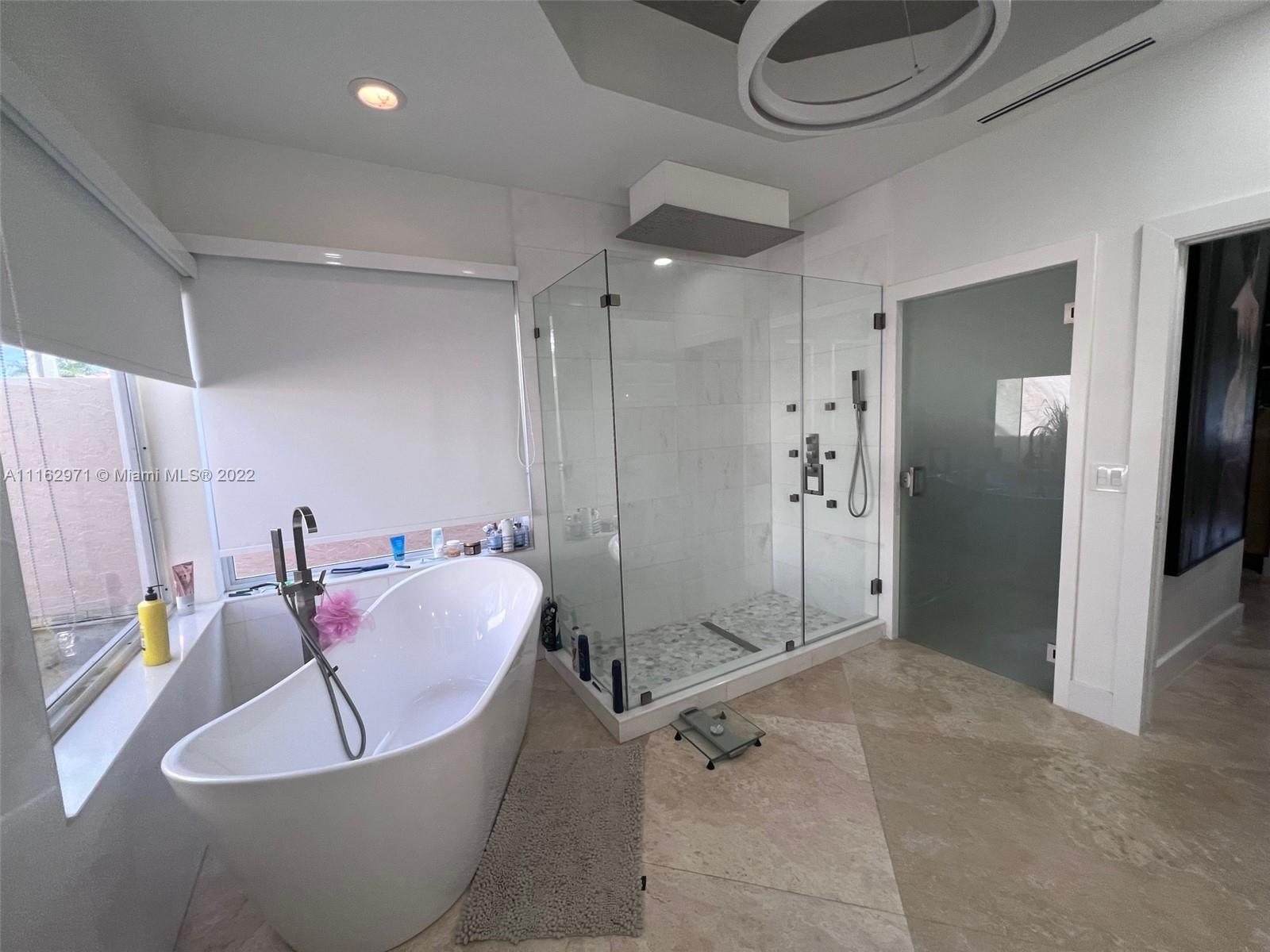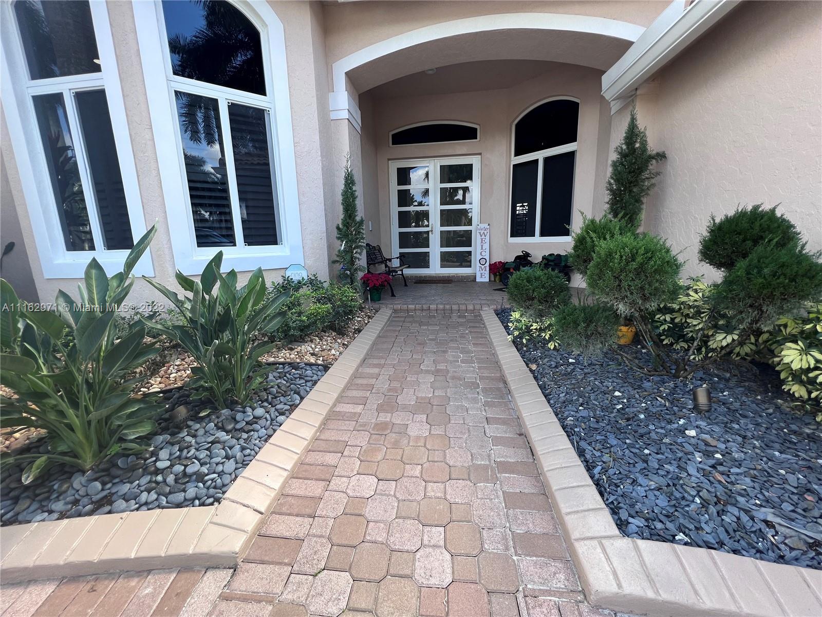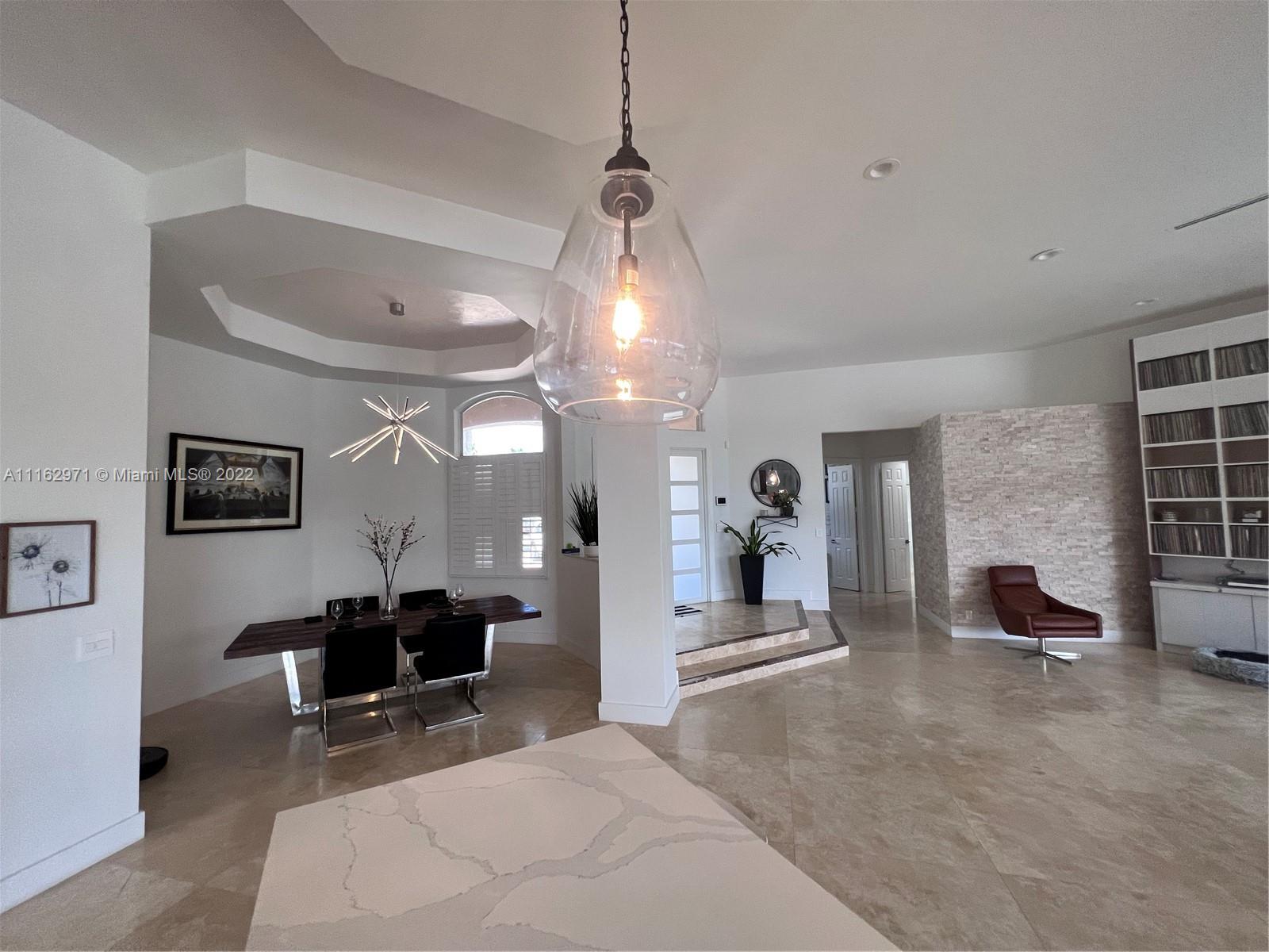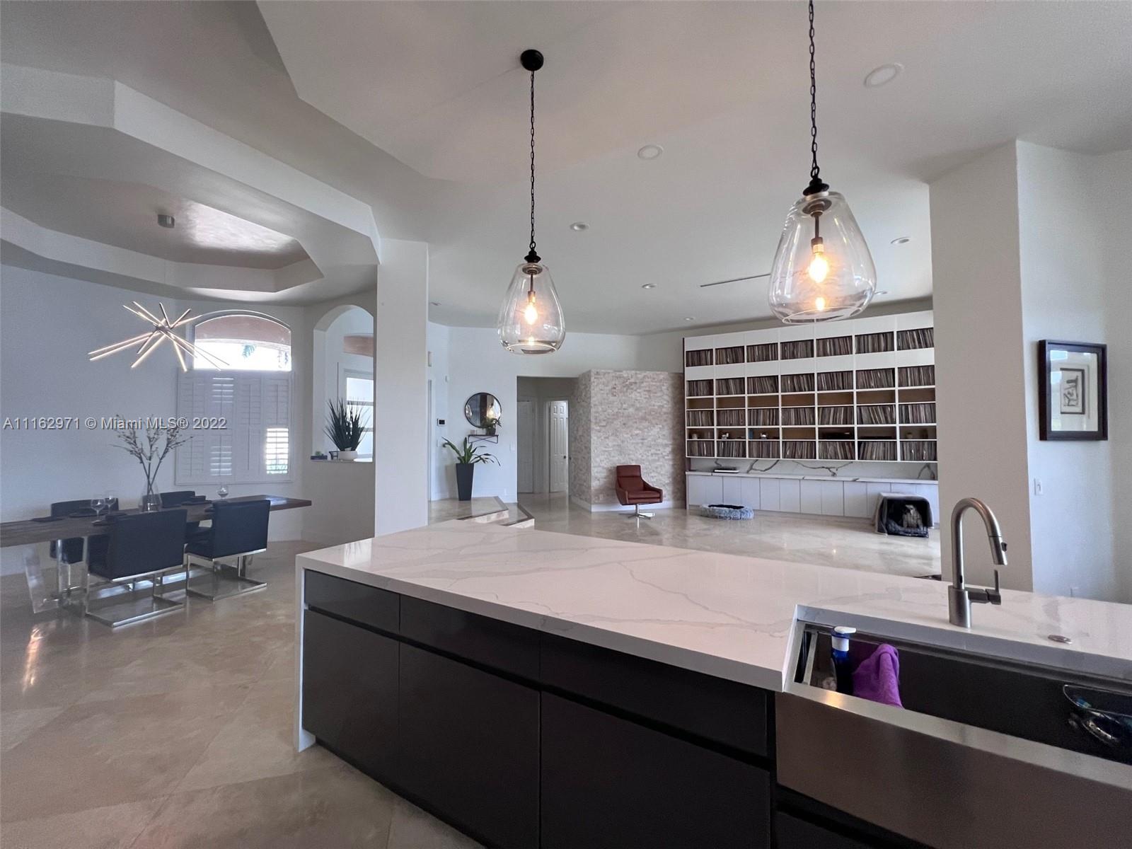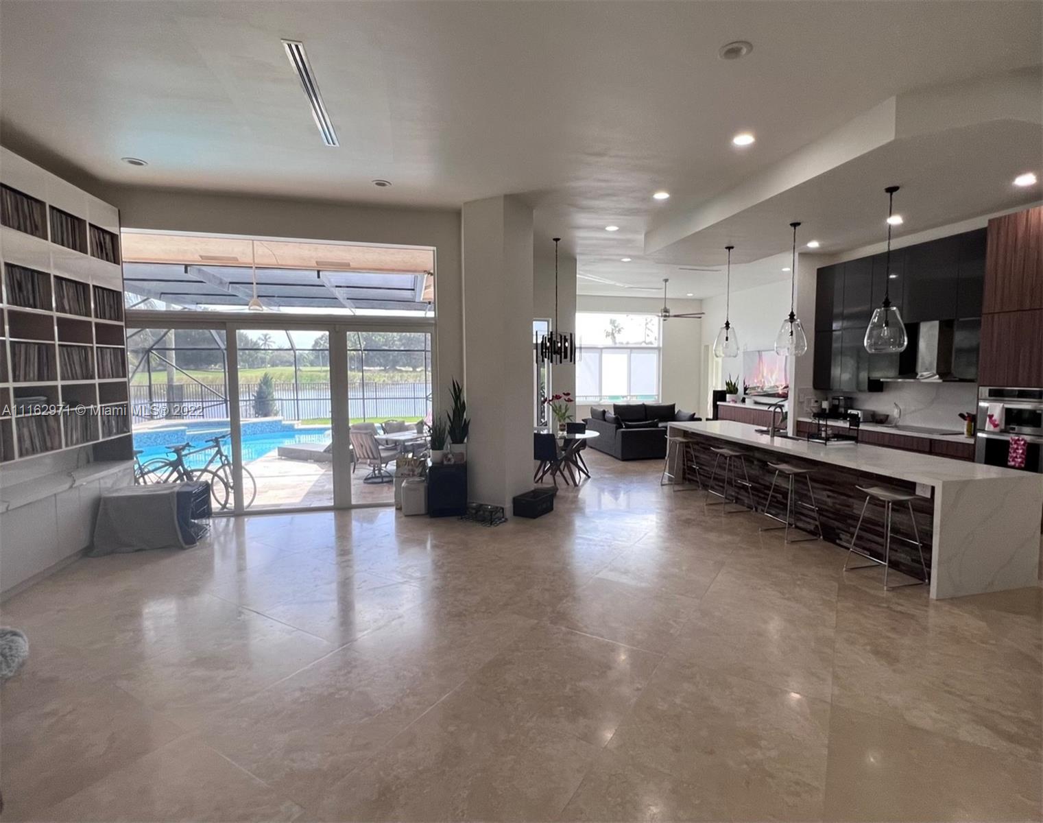 Exceptionally modern 5-3 One-story home with a 3 car garage, screened pool with fabulous lake and golf course view in exclusive gated Weston Hills CC. 12-15 feet volume ceilings, custom wood kitchen cabinets, stainless steel appliances, Calcutta countertops, and marble floors throughout. The 5th room is a den, which can be used as a small bedroom. Over-sized screened pool deck & heated diamond Brite pool, spa, and waterfall overlooking the lake and golf course.