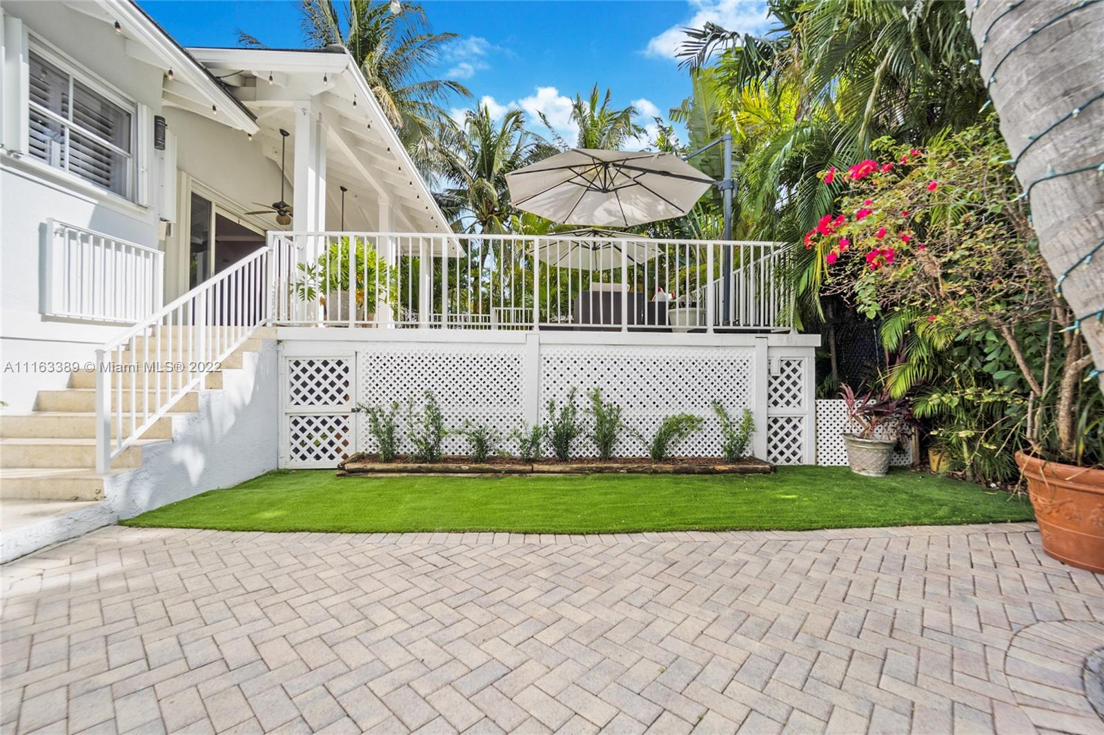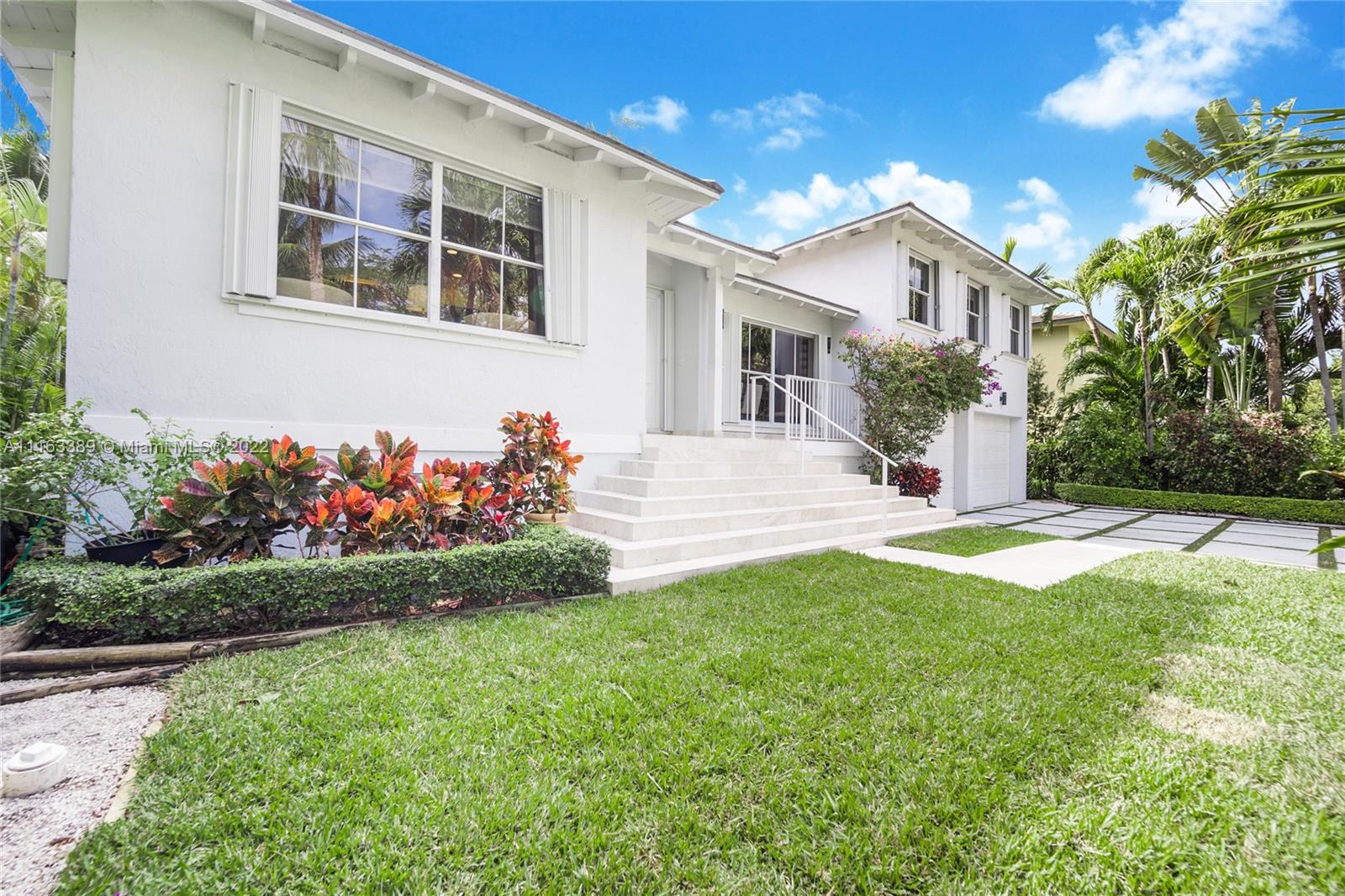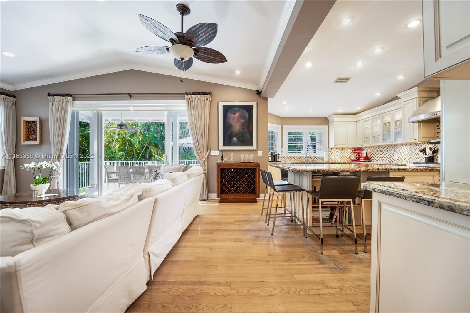 Beautiful elevated Key West style split level home located on the very desirable Myrtlewood Lane. Open layout with vaulted ceilings, combining spacious family room with large, beautiful kitchen equipped with high end appliances. Separate formal living room and dining room. 4 Bedrooms (fourth bedroom converted into an office) and 3 1/2 bath bathrooms. Double car garage converted into extra bedroom, full size bathroom and entertainment room. Family room opens to ample outside area with tiled sundeck and patio with Chicago brick pavers. New roof (2018). Hurricane shutters. Hard wood floors. Full house generator. Great house for entertaining. Beach Club membership. Seller will assign all interest in Grand Bay Club membership to buyer (pool, beach, etc.), subject to Club approval.