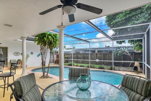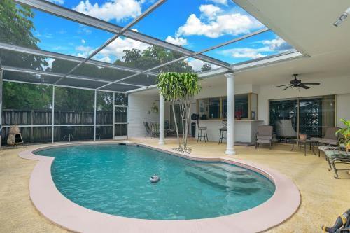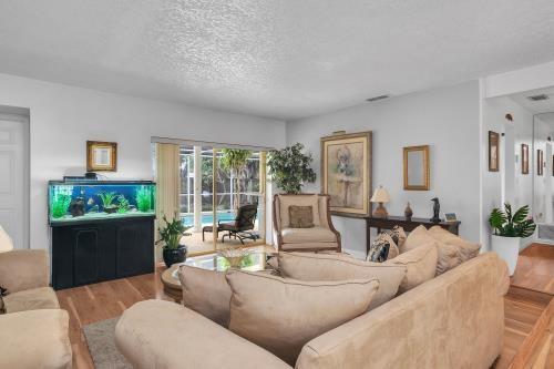 Beautiful 3 bedroom 2 bathroom single family, corner lot, screened in pool home located in Miramar. No HOA. Enter this split floor plan and be greeted with pool views. Step onto new wood flooring and step down into the living room leading you to the pool & screened in porch. Large glass doors & windows provide an abundance of natural light. Kitchen with eat-in dinning, kitchen countertop extends outdoors creating a poolside oasis. Fenced in backyard with shed. Expansive driveway. Covered front porch. Lush trees, landscaping & lots more! Conveniently located near to major highway, restaurants and entertainment. Professional photos coming soon.