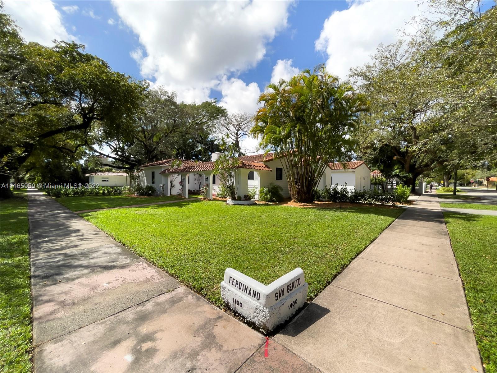 Nestled on a lush street, steps from Country Club Prado Park, 1104 Ferdinand has 3 bedrooms, 2.5 bathrooms, office, gym/storage, and a large double car garage. This home features PGT impact windows & doors, hardwood & Italian porcelain floors throughout alongside SS kitchen appliances. On the exterior, mature oak trees encompass the property. Oversized 15,000 SQFT lot may allow buyer to expand home or add a pool.
