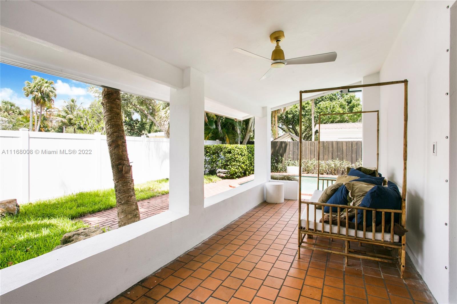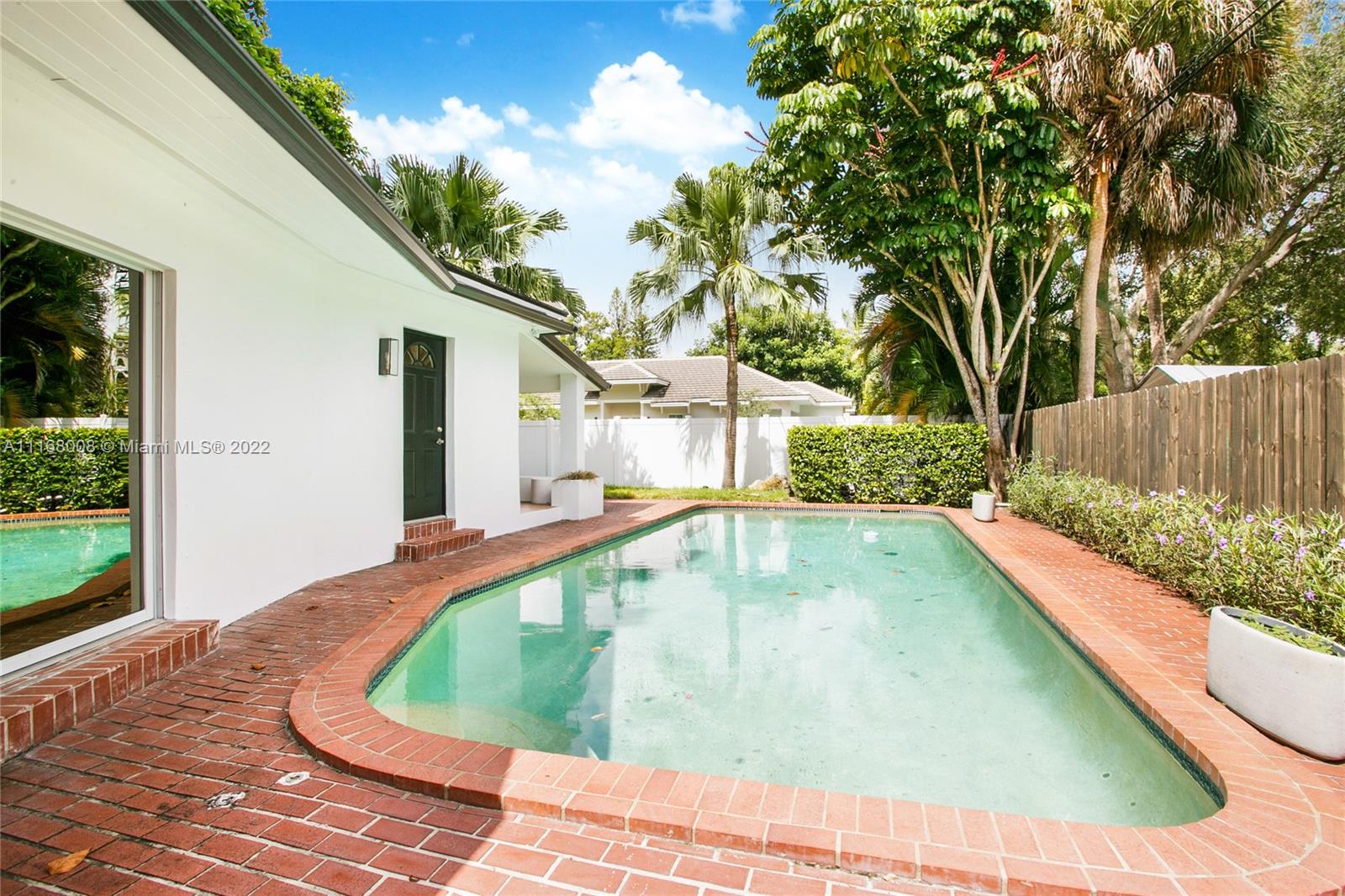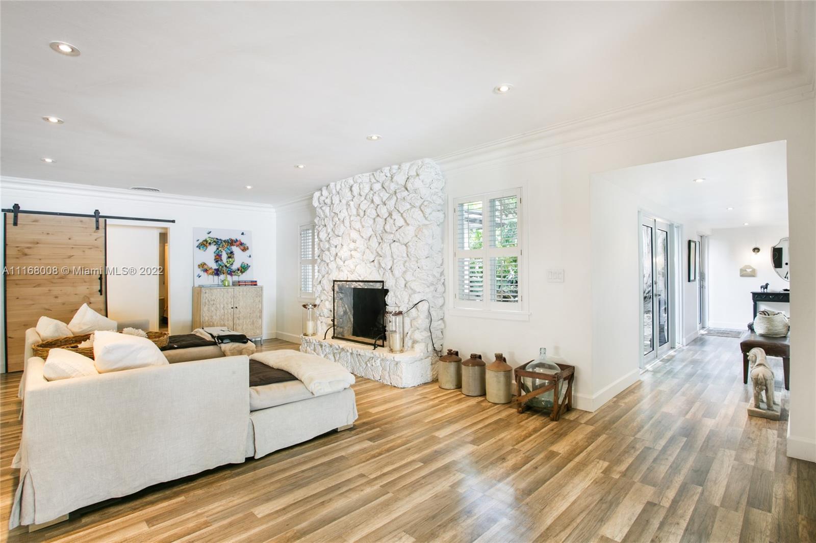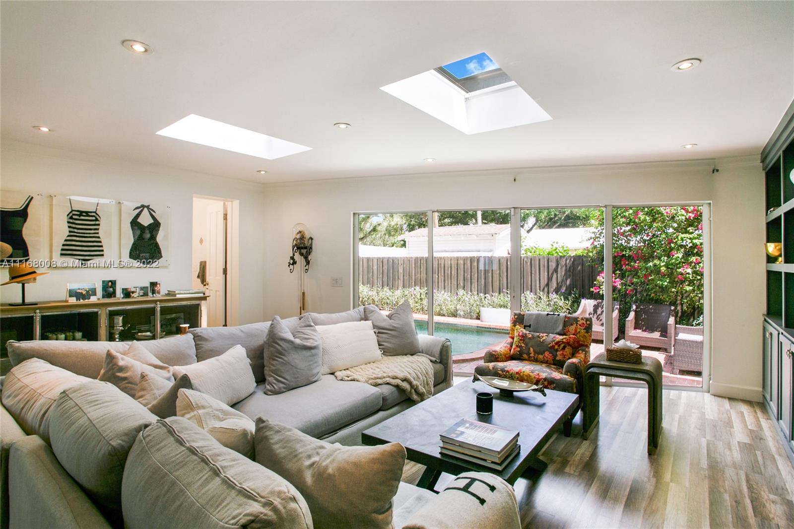 You will fall in love with this Interior designer's private home which is reminiscent of old South Florida living with modern character. Beautifully appointed residence with 4 bedrooms & 2.5 bathrooms amid a wonderful tropical setting. Spectacular banyan tree gracefully covers the double corner lot w/plenty of additional areas for outdoor seating. Entertainer's dream home includes Modern kitchen w/gas range & island, stunning coral rock fireplace in the living room, open floorplan w/adjacent dining & family room that overlooks tranquil pool area. Main bedroom has a generous size w/decorative fireplace & large walk-in closet. Main bathroom has dual sinks & shower. Guest bedrooms share bathroom w/tub, shower. Additional features: Impact windows, skylights, separate laundry room/storage room.