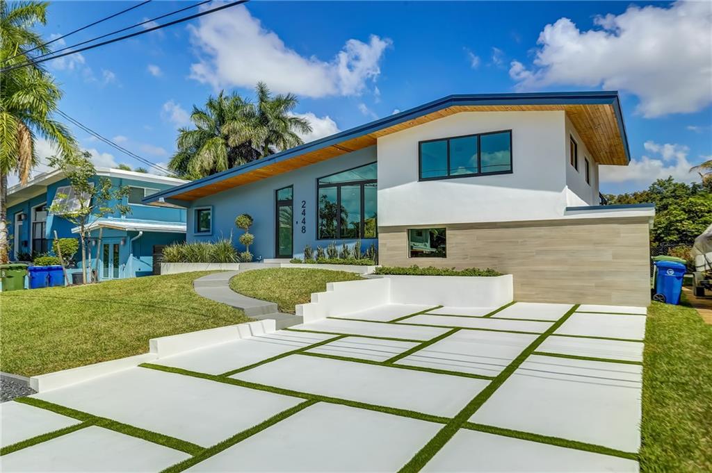 Midcentury modern home on 65’ water. High-end remodel! Four bedrooms and three baths with almost 2000 sq ft! New kitchen and baths. Modern wood panel kitchen and gourmet appliances. New 48”x 48” porcelain floors throughout. New pool with marble sun deck. New PGT low e impact windows and sliders. New 3 1/2 ton & 1 1/2 ton central ACs. New plumbing and electrical. New solid-core doors throughout. Master and guest bedroom each have terraces overlooking pool and canal. Nice dining area overlooking pool & water. Bosch washer & dryer. New 40ft dock with ocean access. Walk-in closets and organizers. New driveway and enough space for 6 cars. Custom lighting inside and along exterior of home.