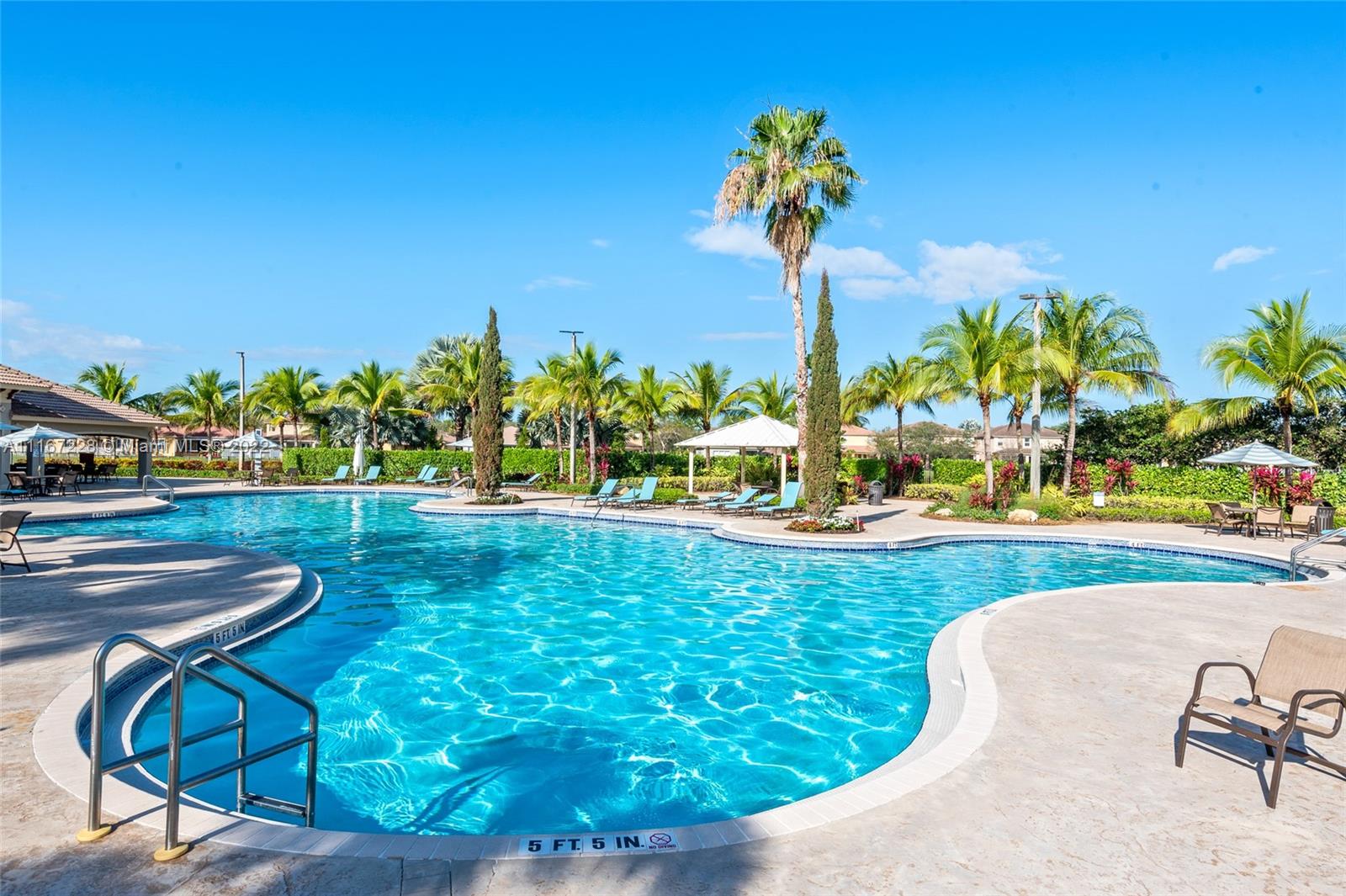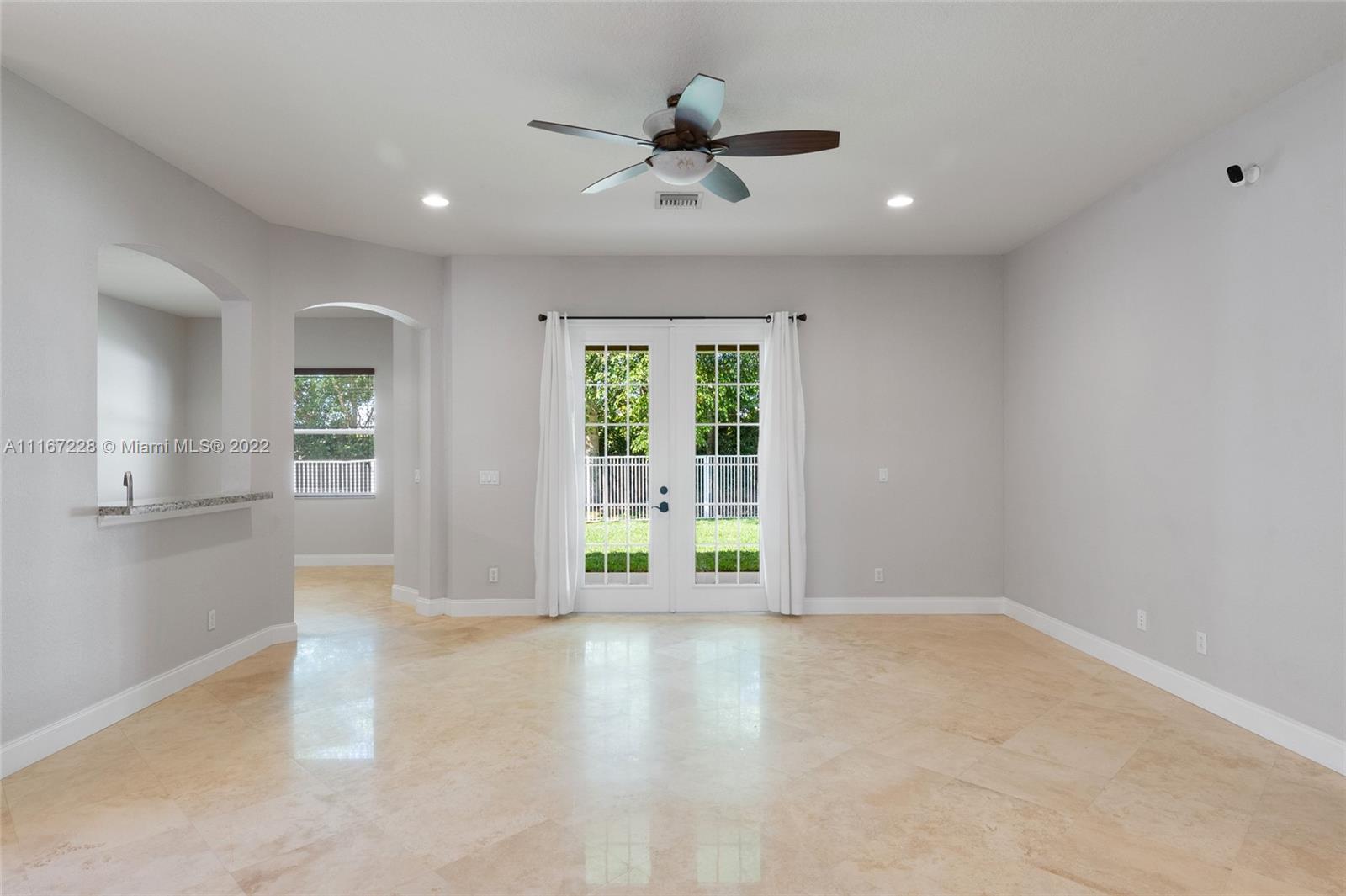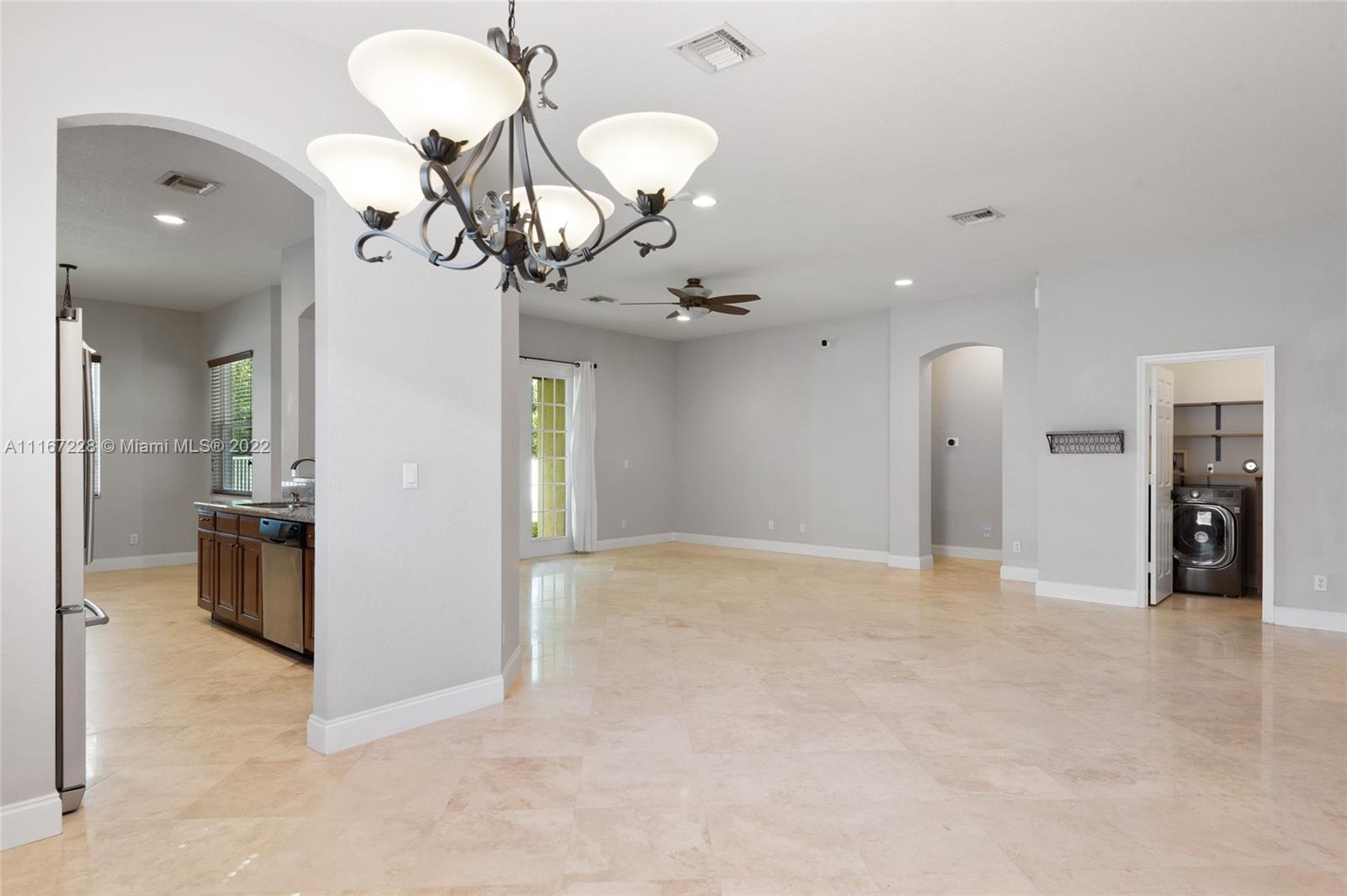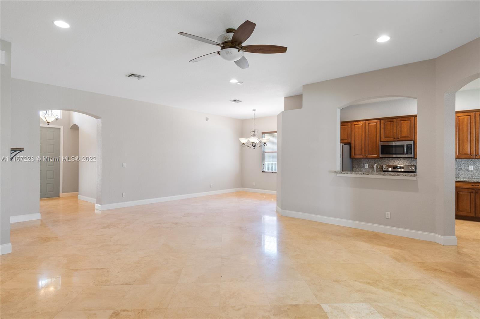 This beautiful home is situated on a private, oversized lot on a cul-de-sac with no neighbors behind and features 3 bedrooms (split floorplan), 2 bathrooms, a 2-car garage, foyer, formal living and dining, travertine & wood flooring, high ceilings, kitchen w/ 42-inch wood cabinetry, stainless-steel appliances, granite countertops & backsplash, and breakfast nook. The master suite features a walk-in closet & master bath w/ Roman tub & separate shower. Additional features include a new HVAC unit (04/2021), laundry room w/ tub, hurricane shutters, fully fenced yard w/ room for a pool, top A-Rated public schools and Resort Style amenities. HOA Fee of $260 monthly includes basic cable, internet, guard-gated entrance, clubhouse, fitness center, pools, playground, basketball & volleyball court.