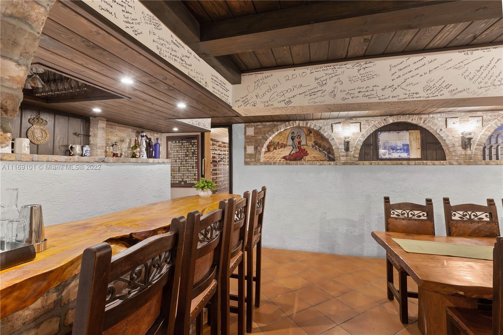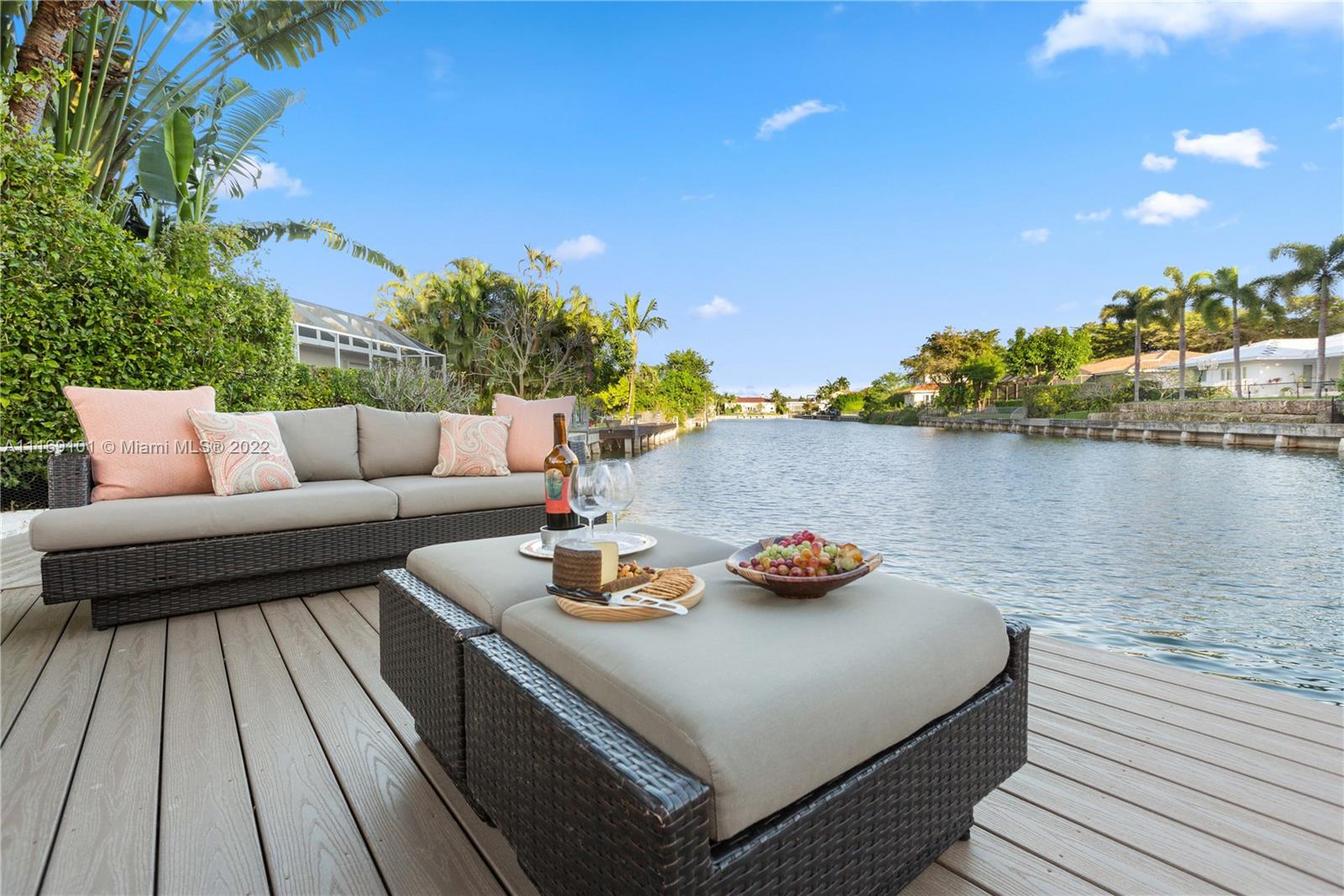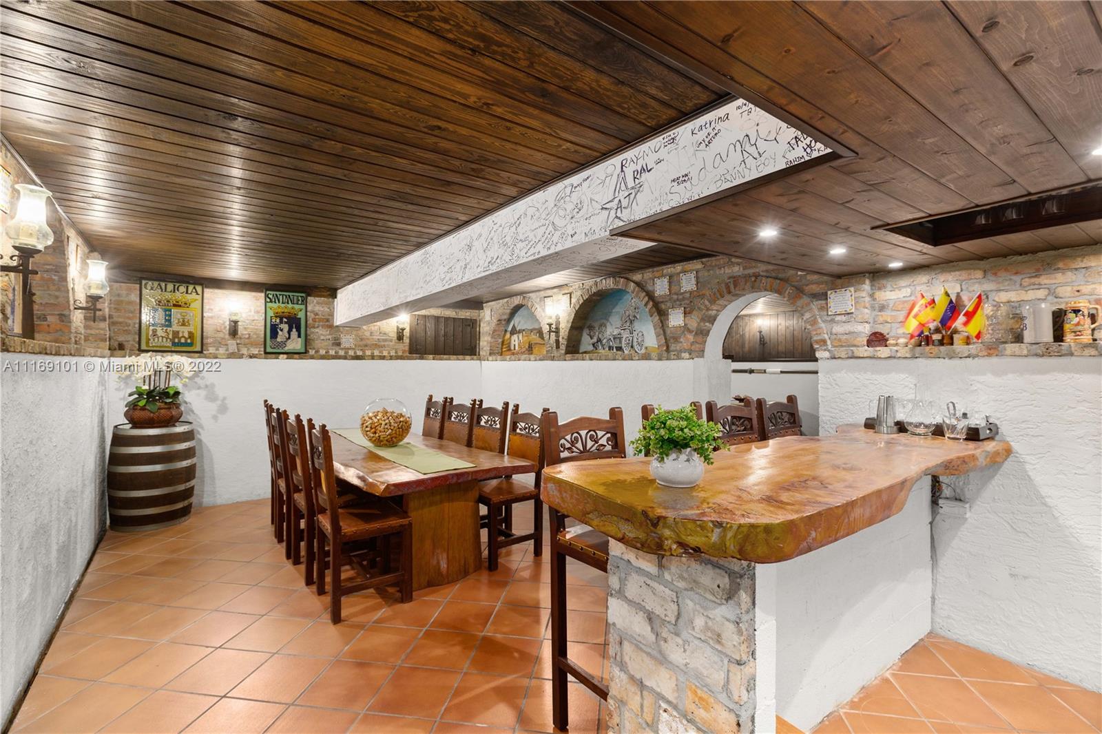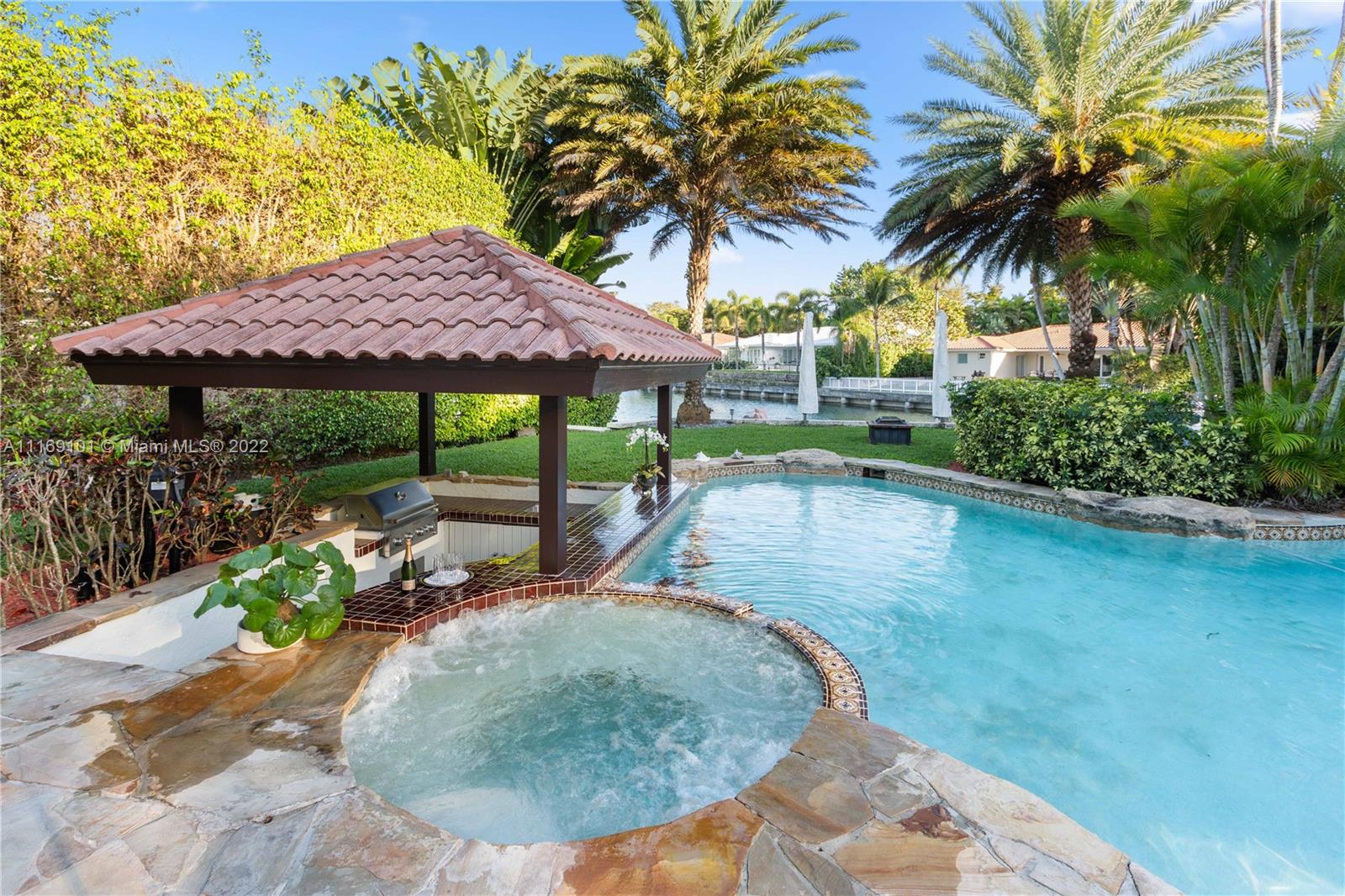 Spectacular 5-bed, 4-bath waterfront home in Gables By the Sea. This is an oasis of comfort with amazing pool, patio & summer kitchen. While there is no access to the bay, the serenity & beauty of the waterway are amazing especially while engorging the evening on the dock. This home is full of surprises, elevated to over 12-ft, it has a finished basement w/ a large traditional Spanish bar & dining room, that are perfect to catch a game or simply gather w/ friends while enjoying a glass from its temperature and humidity controlled 600-bottle wine cellar. 17k + sq ft lot, circular driveway, 2 car garage & Gym. This is a fabulous place to work at home or to come home to, after work. Priced to sell, the current owners enjoyed this home for 32 years and are ready to pass it on to a new family.