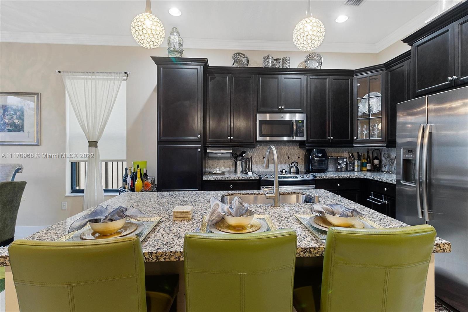 Step inside a spectacular 3 bedroom 2.5 bathroom home and be greeted with exacting standards, premium finishes, outdoor paved patio overlooking a well manicured lawn and garden. First floor porcelain tile throughout, open kitchen with large island, custom kitchen cabinetry with recessed lighting within, granite countertops, tiled backsplash, chandelier globe lighting adorning the kitchen and dining room area, along with stone finished accent wall in dining area. Window treatment and recessed lighting throughout home, approaching a wood landing staircase once upstairs, an oversized Master Bedroom suit w/wood flooring awaits you, shower/roman tub combo with stone backsplash and custom double vanity. 24hr gated community with amenities: salt water pool, gaming, gym, playground.