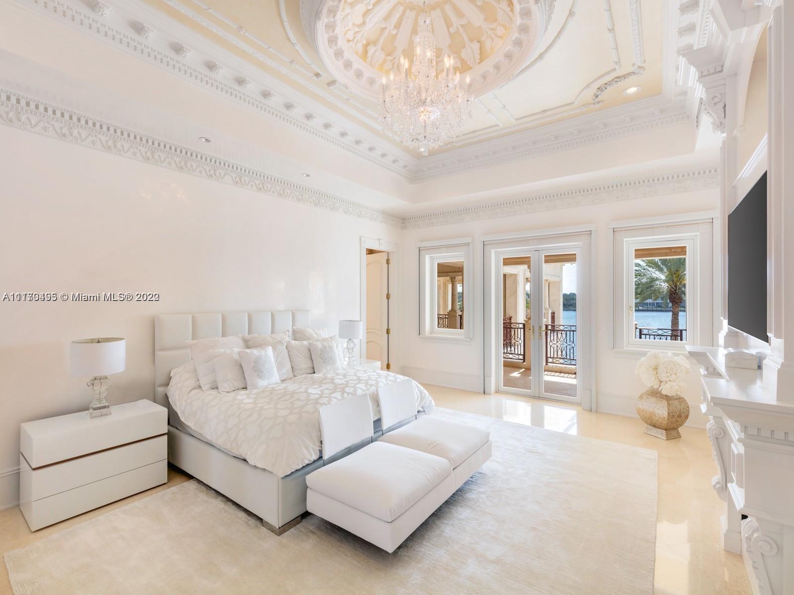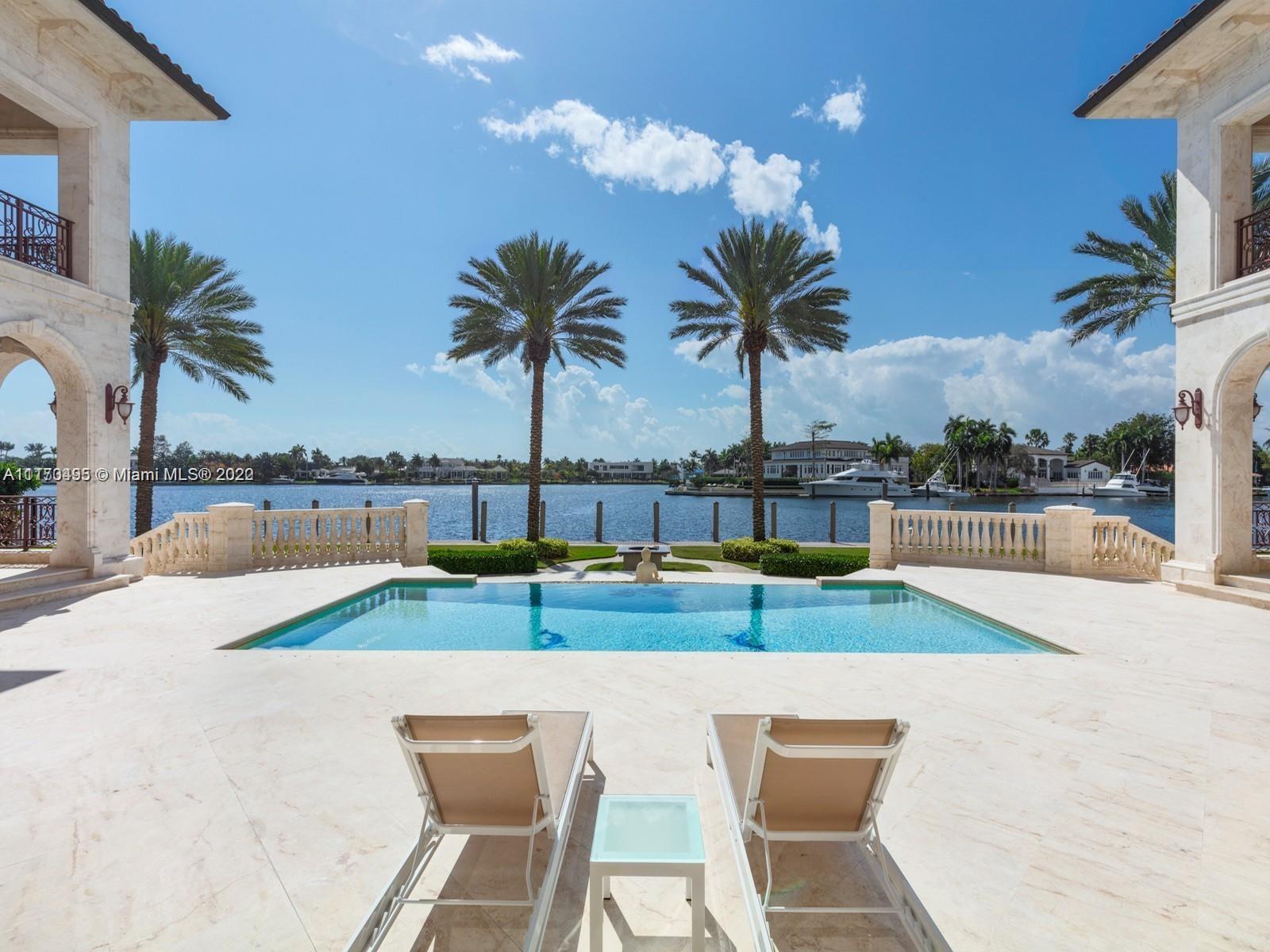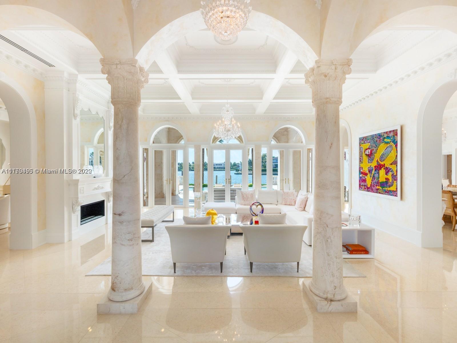 Neo-Classical Italian style villa on the widest lagoon in Gables Estates with 200 feet on the water and 140 foot dock. 8 bedrooms, 9 baths, 5 HB, library/office, gym, and 600 bottle custom wine cellar fill this 18,073 total SF palatial estate. Marble veneer walls, custom carved stone elements, & Venetian Plaster throughout. Over 4,000 SF of expansive covered terraces are ideal for entertaining. Large primary suite with his/her baths and walk in closets, custom crafted chefs kitchen open to the large family room and secondary office. Butler’s pantry and 2 bedroom staff quarter, this estate checks off all the boxes!