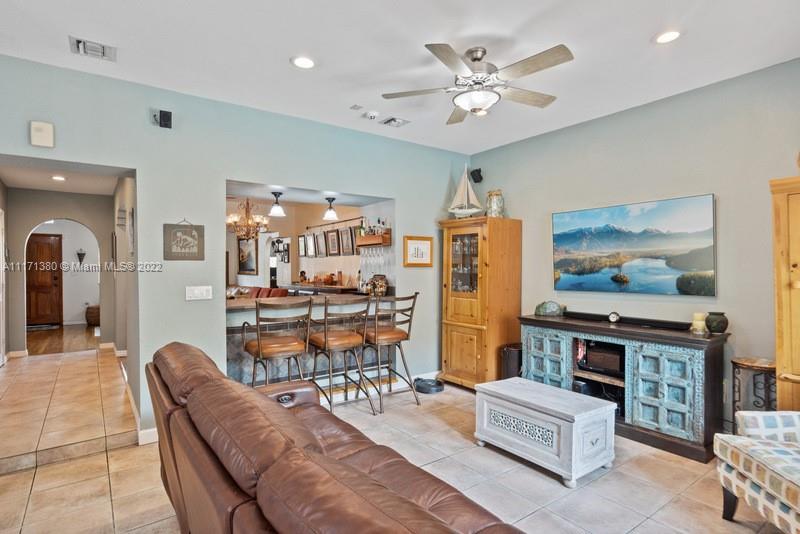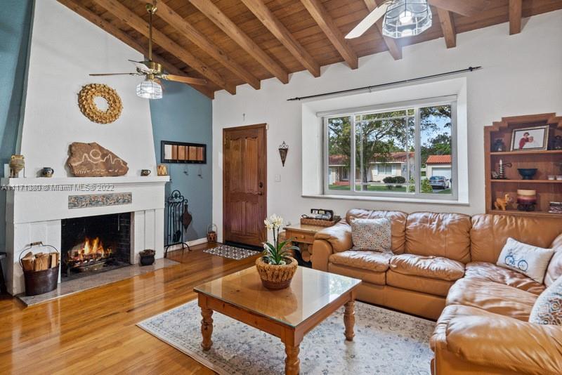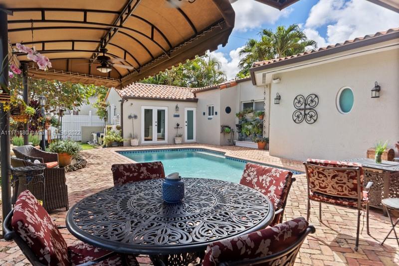 Warm & wonderful light-filled 4/3 pool home is the perfect union of charming Art Deco character & thoughtful contemporary spaces to enhance today’s ideal lifestyle. Hardwood flrs, open beamed ceilings & fireplace accent formal liv rm entry. Inviting formal din rm w/ pass-thru bar & wine refrig flow seamlessly to a cozy open fam rm & bright, beautiful, updated eat-in kitchen w/ volume ceilings, & counter island. Private oasis alfresco will allure you to the sunny pool, relaxing entertaining areas & covered summer kitchen. Split BR plan presents principal BR suite + sumptuous bath, 1/1 office/“casita". Uniquely large & practical indoor laundry/utility/pantry off kitchen. Partial impact glass, windstorm protection, updated plumbing, electrical. Attached carport and 4 add'l parking spaces.