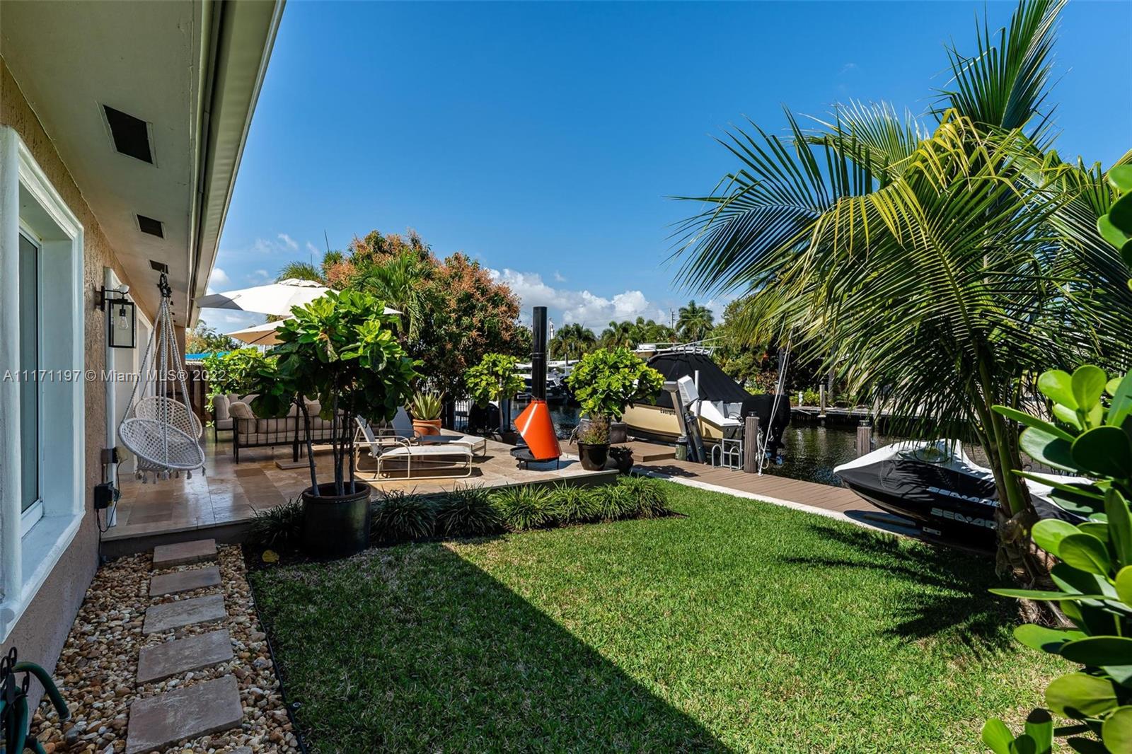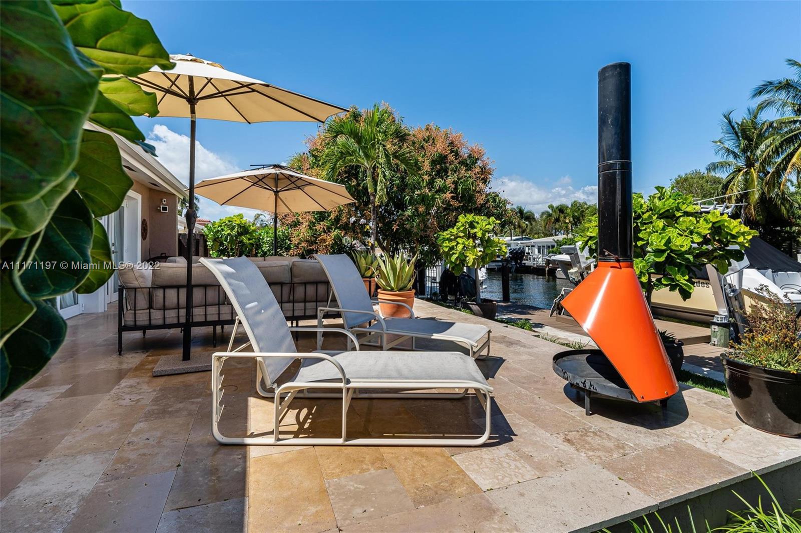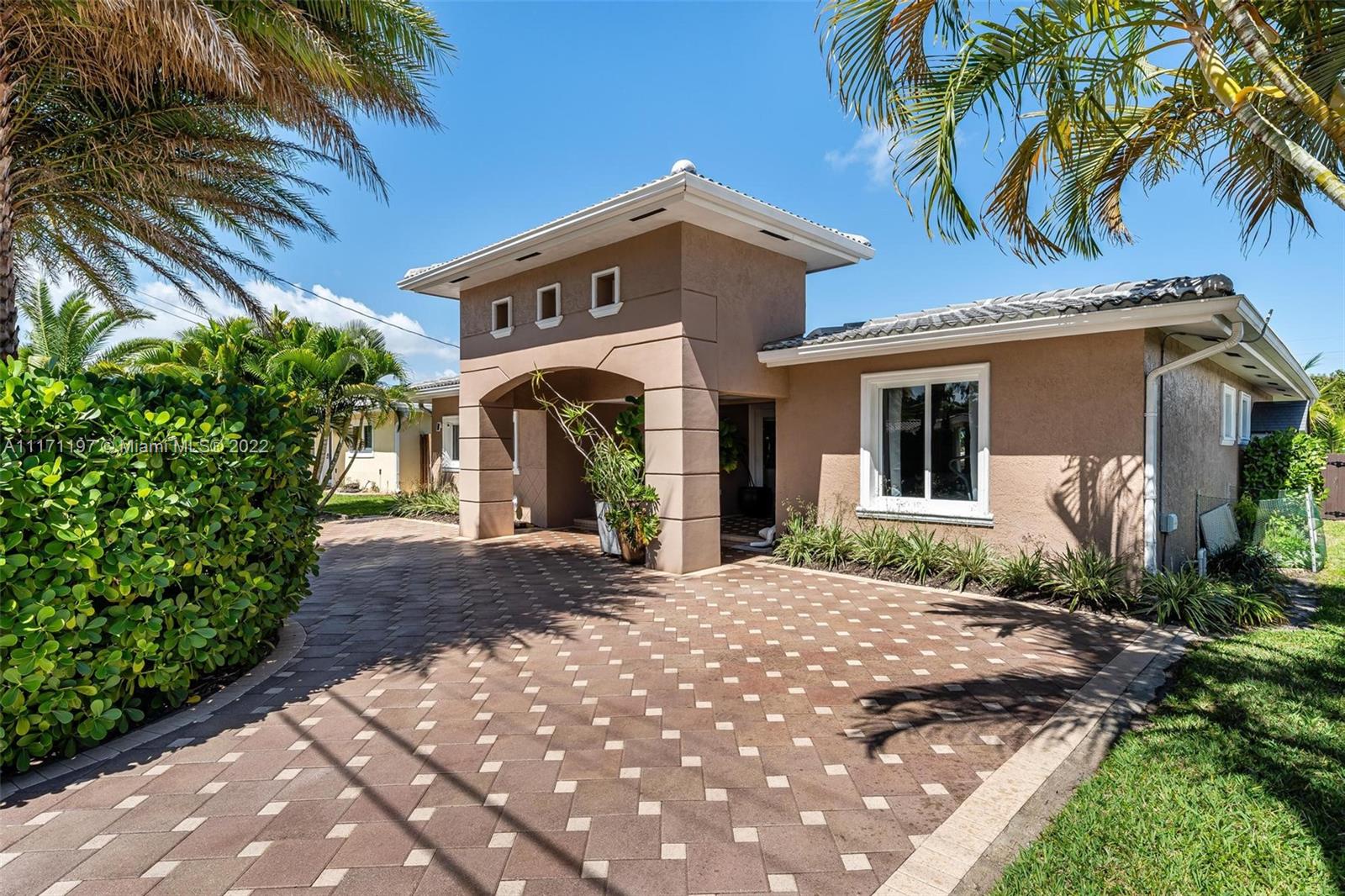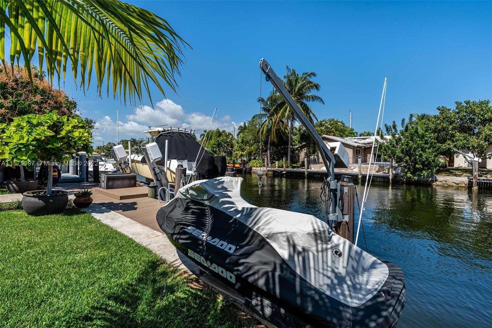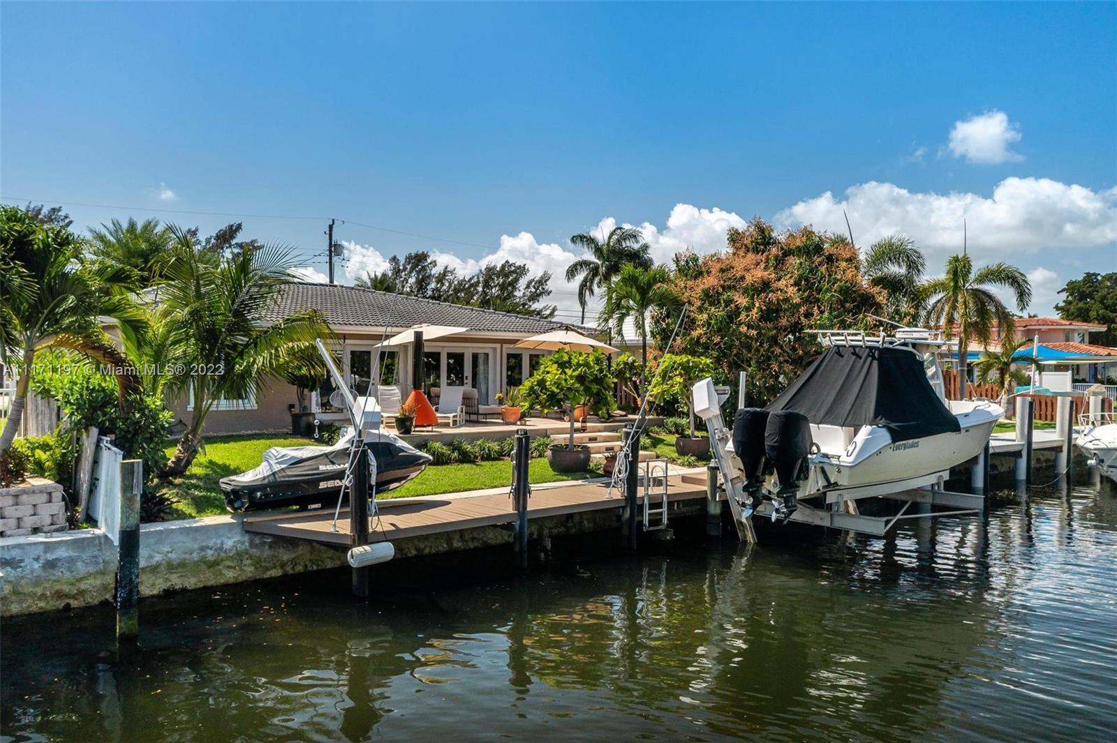 Stunning turnkey WATERFRONT 3 BEDRMS/3BATHS estate home! Located on deep water, no fixed bridges with direct ocean access. Over 60 feet of water frontage with 17,000 lb capable elevator boatlift and an electric davit. Take advantage of indoor-outdoor open concept living with French doors leading out to your beautiful custom travertine patio with built in lighting. Large, remodeled kitchen with custom quartz island for entertaining your guests while taking in the water views. Two masters with ensuite bathrooms and private guest suite with bathroom. All impact windows and glass, walk in closets, covered porch, 3 outdoor sheds. Large paver stone circular driveway with EV charging station included. Premier location close to the new Pompano pier, Hillsboro inlet, restaurants, beaches & more.