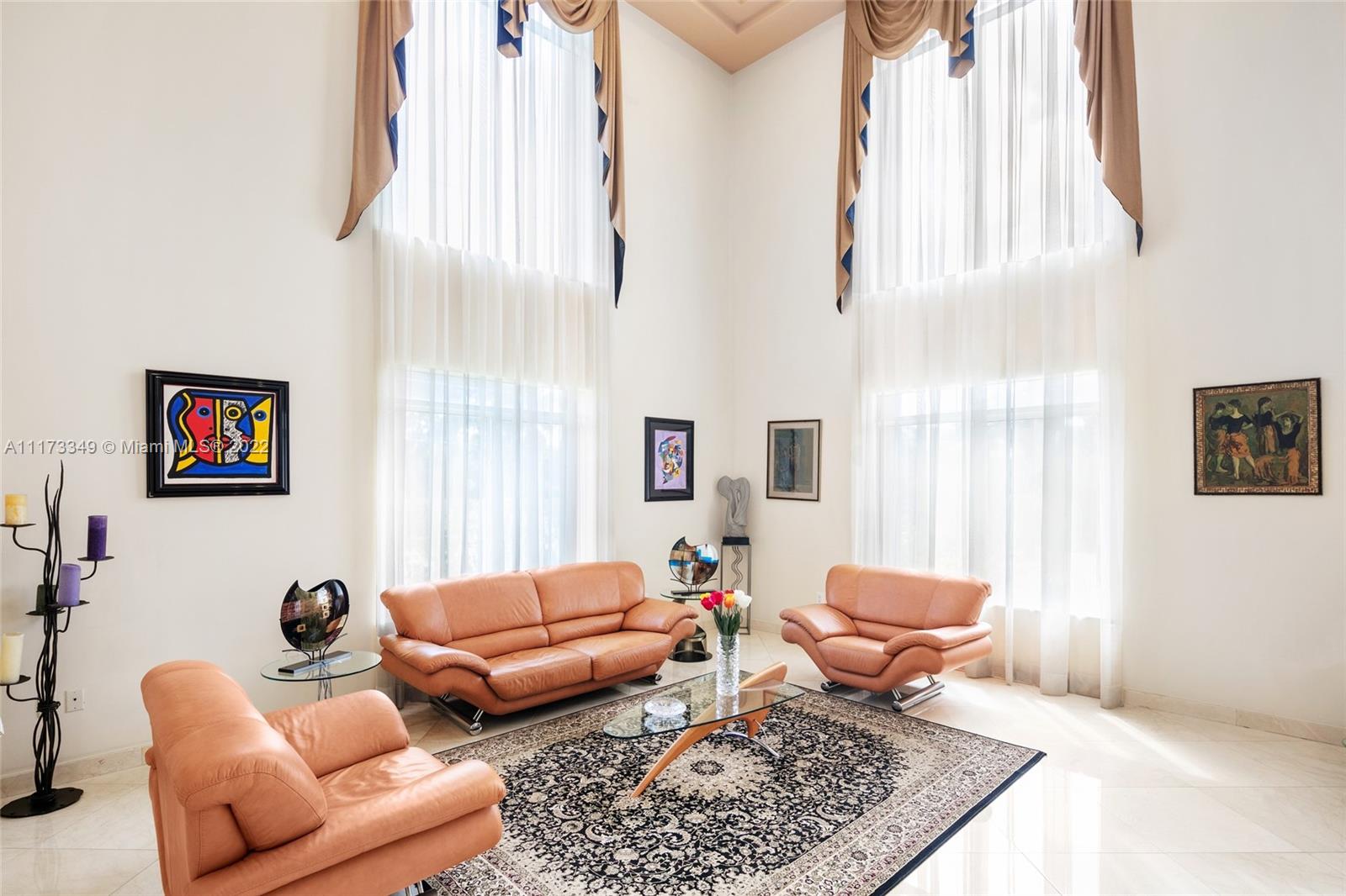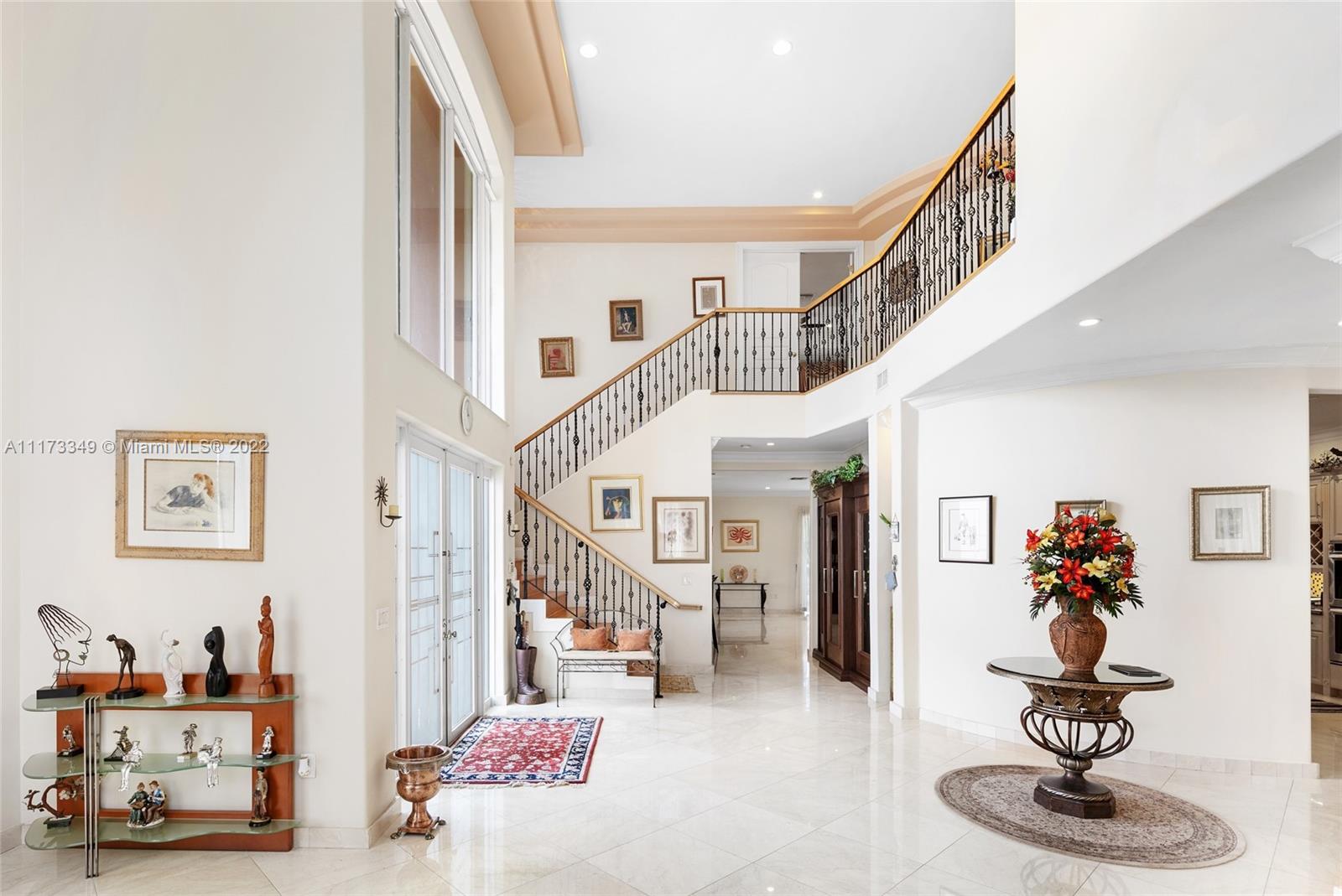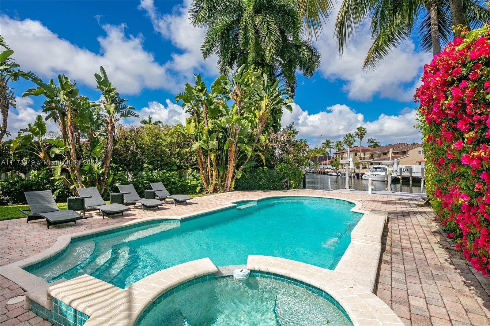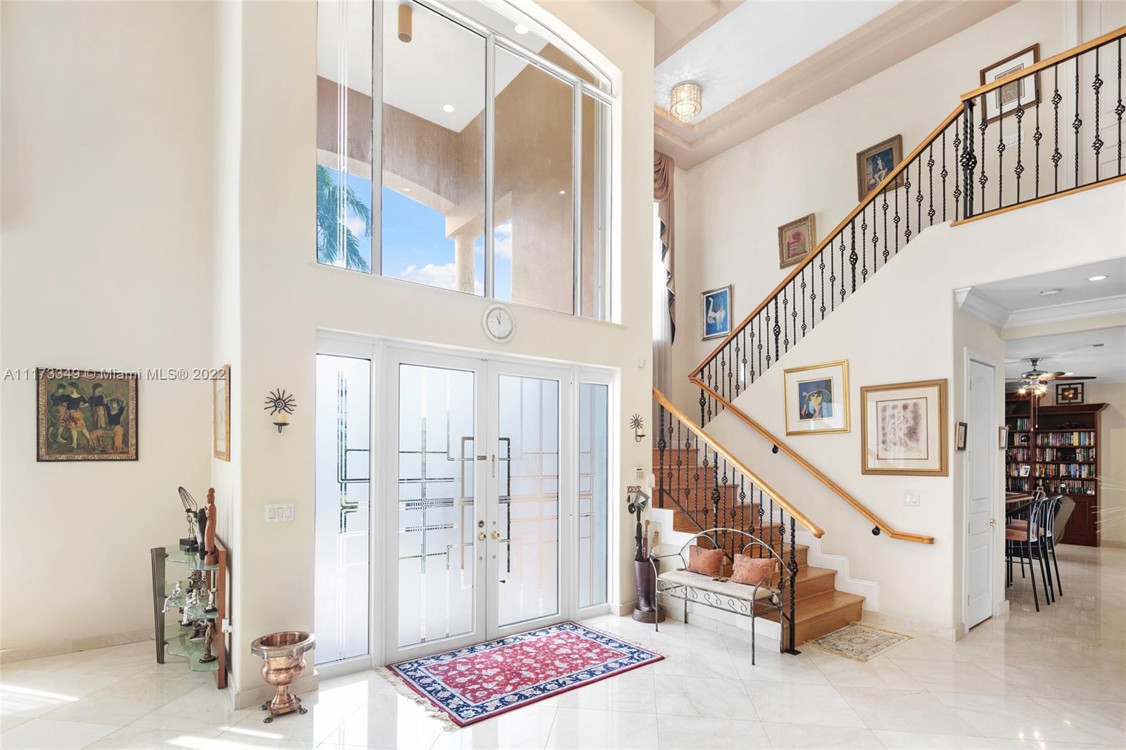 Beautiful waterfront residence in guard gated Eastern Shores. Boasting 5,089 square feet with 5 beds/5baths + 2 half baths, and sitting on an oversized 13,565 square foot lot, this is a boaters paradise with deep water, no fixed bridges to bay, composite wood dock, and 15,000 lbs. boat lift. As you enter, you are greeted by vaulted ceilings and natural light beaming through double-height windows. Spacious open layout, featuring a wet bar and wine storage, is perfect for entertaining. Gourmet kitchen with breakfast nook opens out to the covered patio with heated pool and jacuzzi. Expansive principal suite with a sitting area and dual closets as well as an upstairs loft area. Two car garage. Great yard space. Minutes from the beach, Bal Harbour shops & Aventura Mall/restaurants.