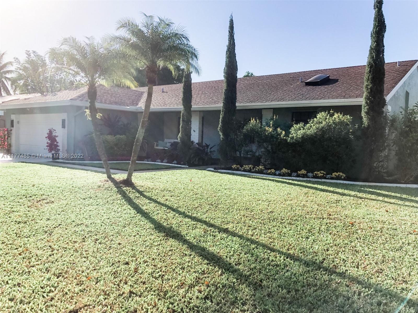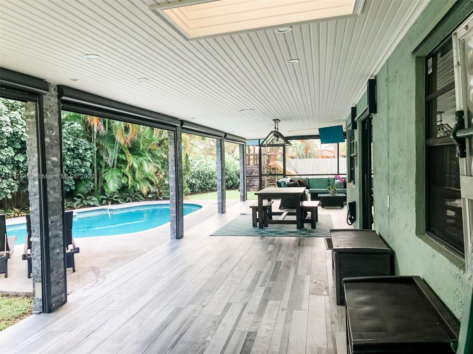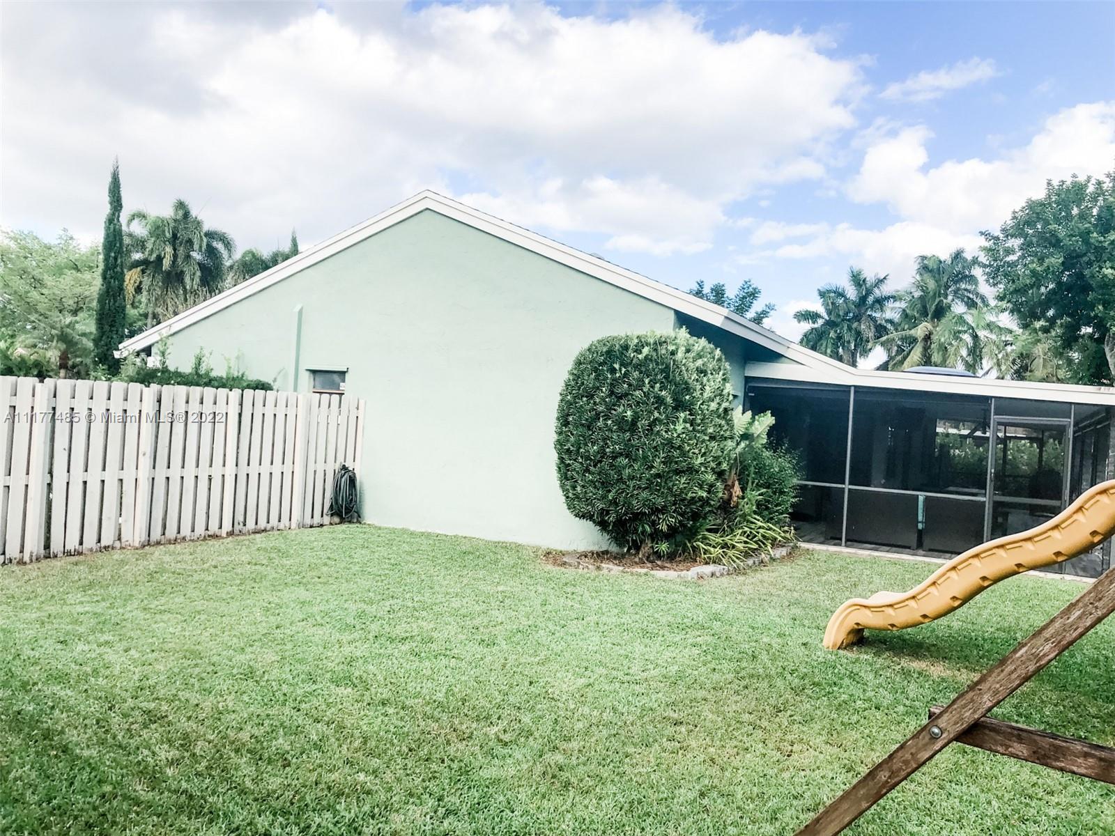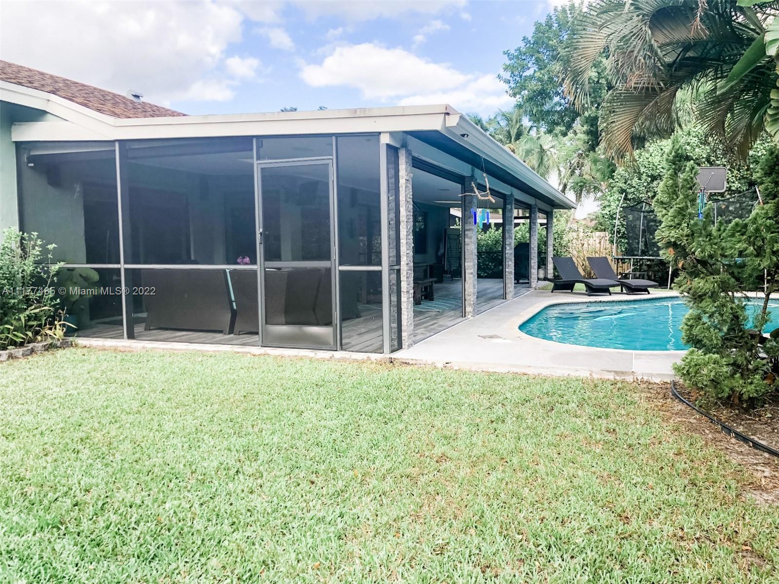 Updated 3/2 on a spacious corner lot in West Davie. Neighborhood living with sidewalks. Split floorplan with vaulted ceilings. Kitchen has granite countertops and stainless steel appliances. Completely upgraded patio is perfect for entertaining with recently tiled floors, insulated ceiling to cool it down, app-controlled speaker system, dimmable lighting, remote controlled roller screens with additional roller shade to block the afternoon sun. Neutral tile throughout main living areas and wood floors in bedrooms. Extra large washer and dryer. Pool has disco lighting and a fence. Extra-wide driveway. Very close to park and splash pad. Close to Weston, major highways, Mall, tons of activities and nightlife.