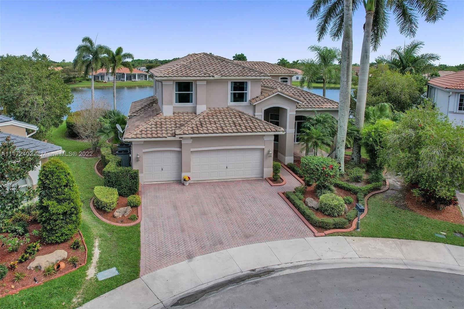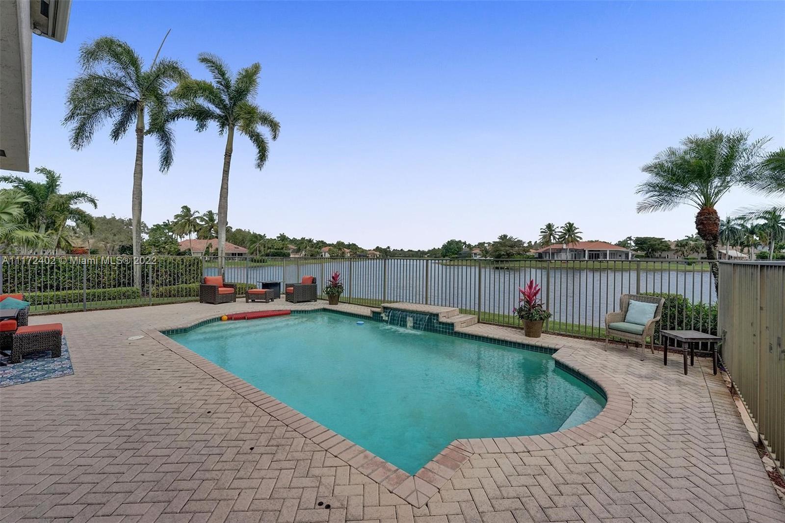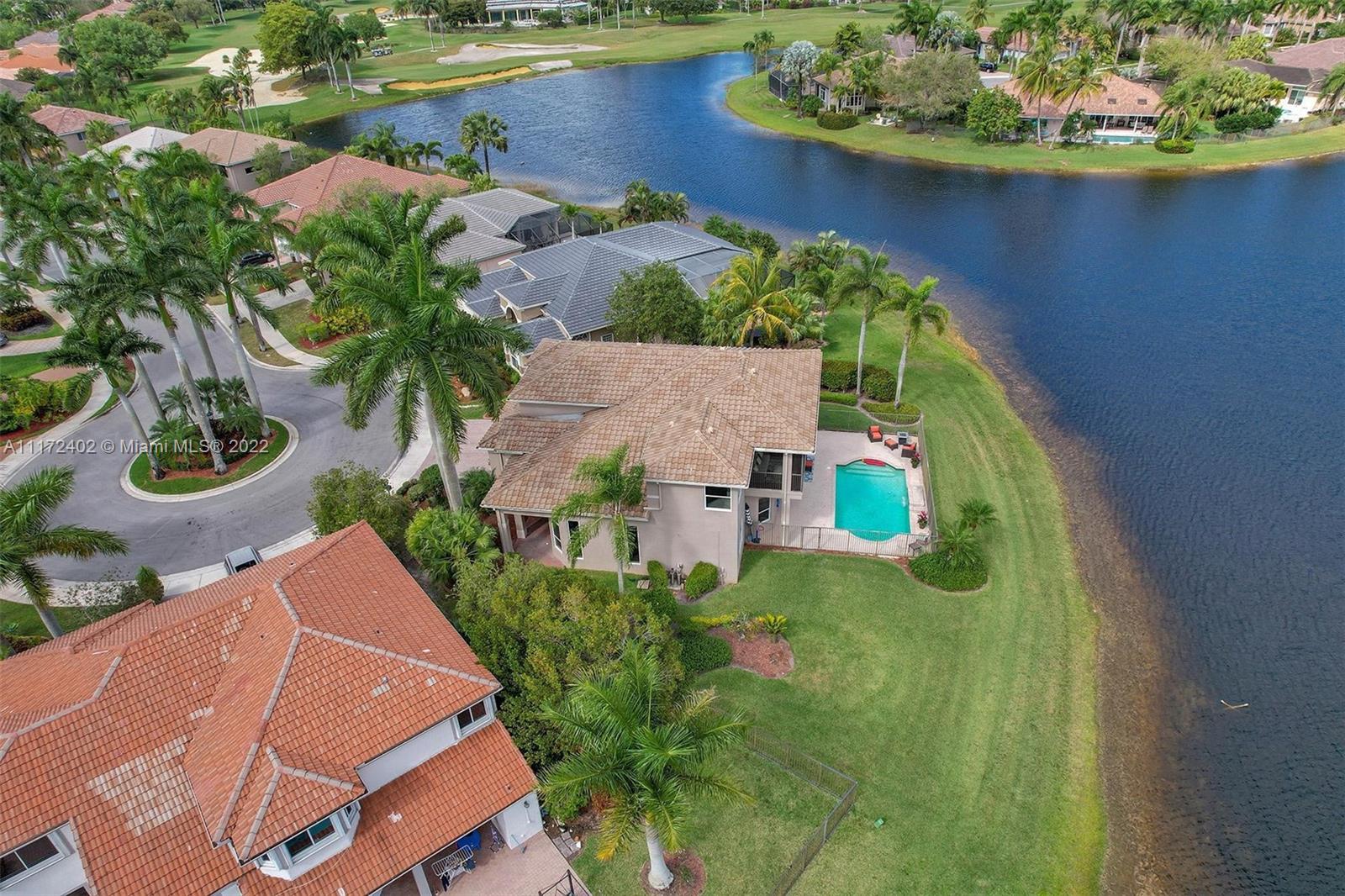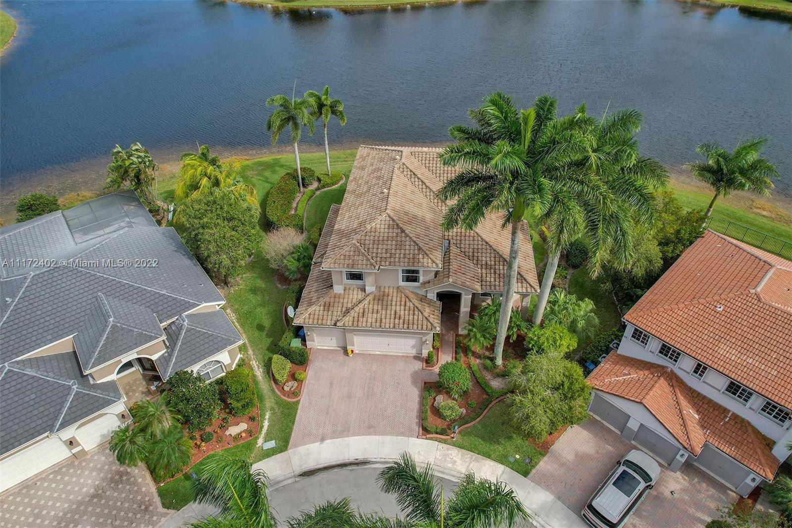 Tucked on a royal palm tree-lined street in Jardin at the prestigious gated golf community of Weston Hills Country Club. Stunning pointe water lot with long, panoramic lake views. 5 bed, 4 bath, 3 car garage. Enjoy soaring ceilings in the living room, a formal dining, a spacious family room, and an office/den/bed first floor plus renovated marble cabana bath. Renovated modern kitchen w/ shaker cabinets, center island, sunny breakfast nook, stainless steel appliances, quartz countertops. The oversized owner's bedroom on the second floor features a private screened balcony. Fenced private backyard with a free-form pool on an expansive cul de sac lot. Marble floors throughout the first level, rectified porcelain wood in bedrooms, full impact windows.