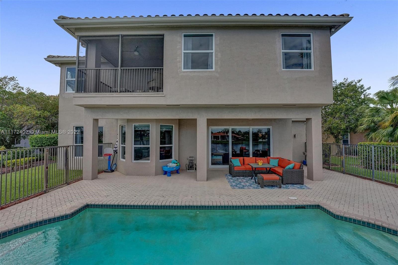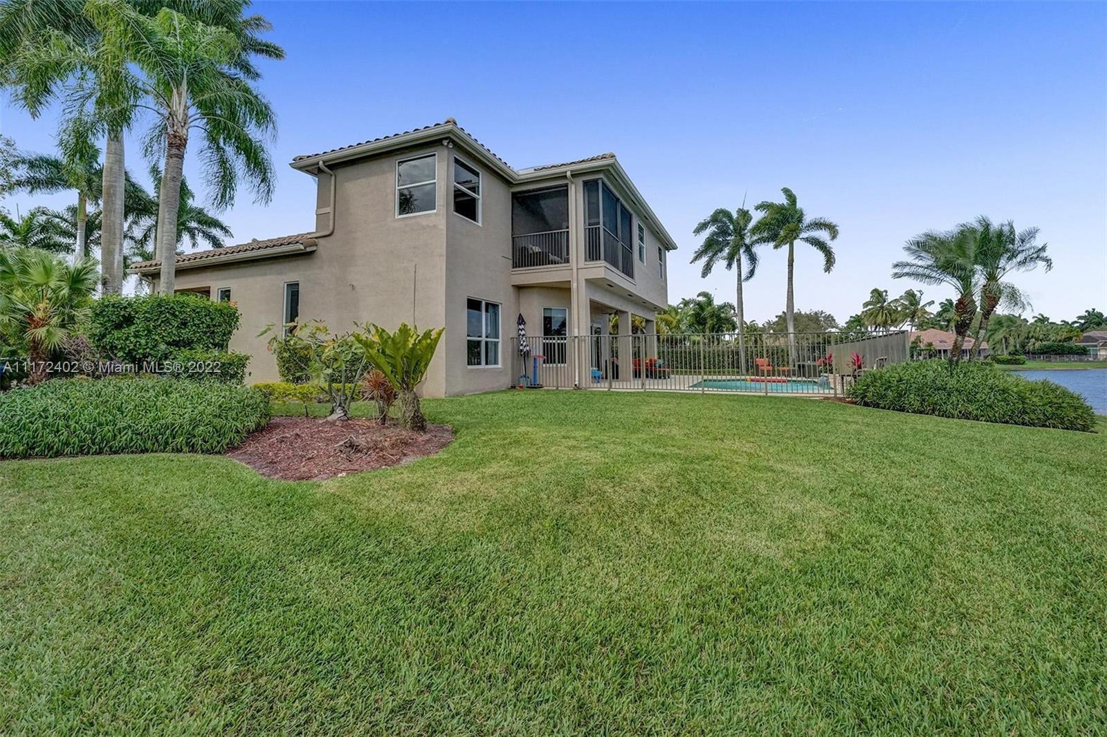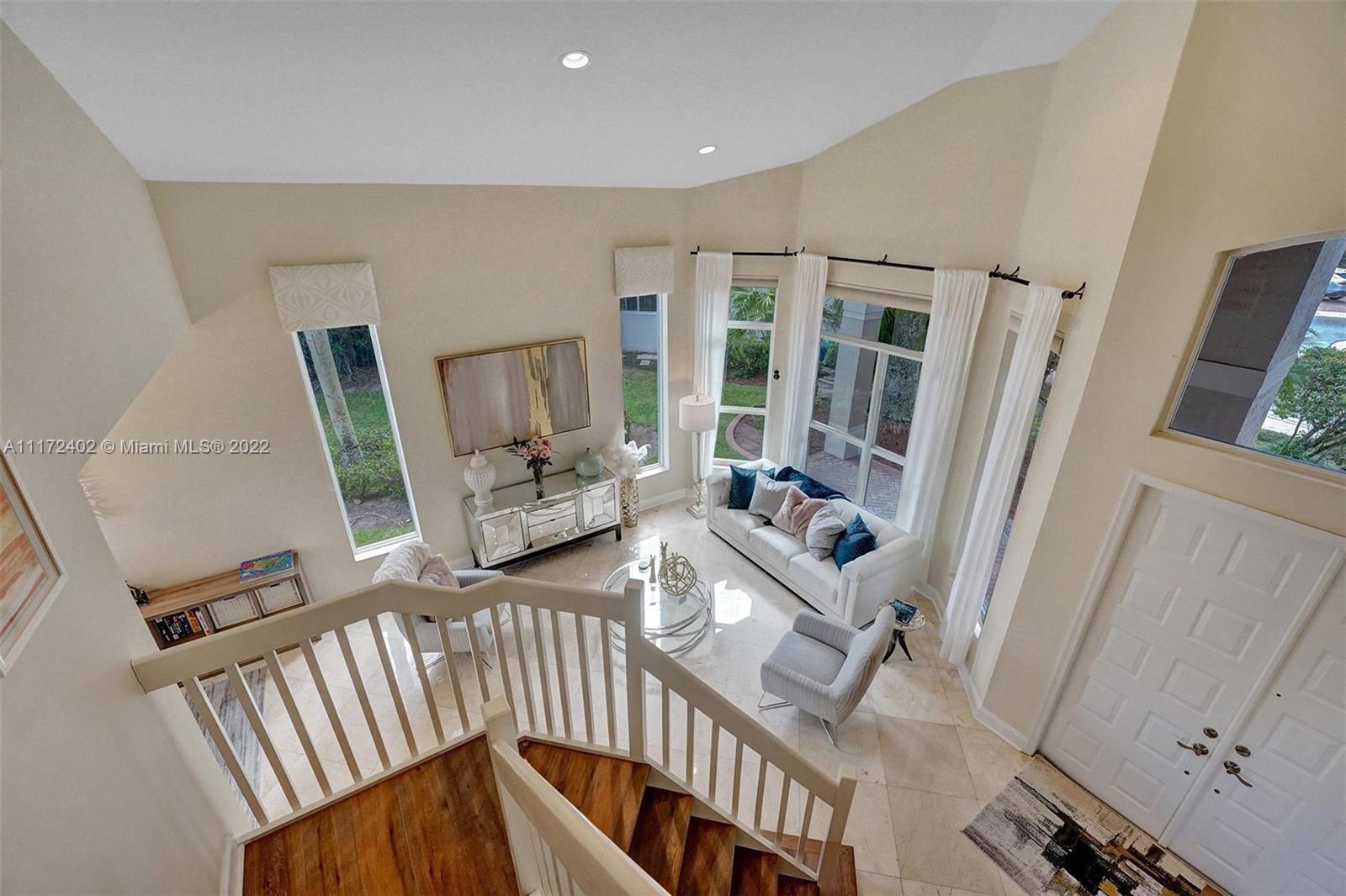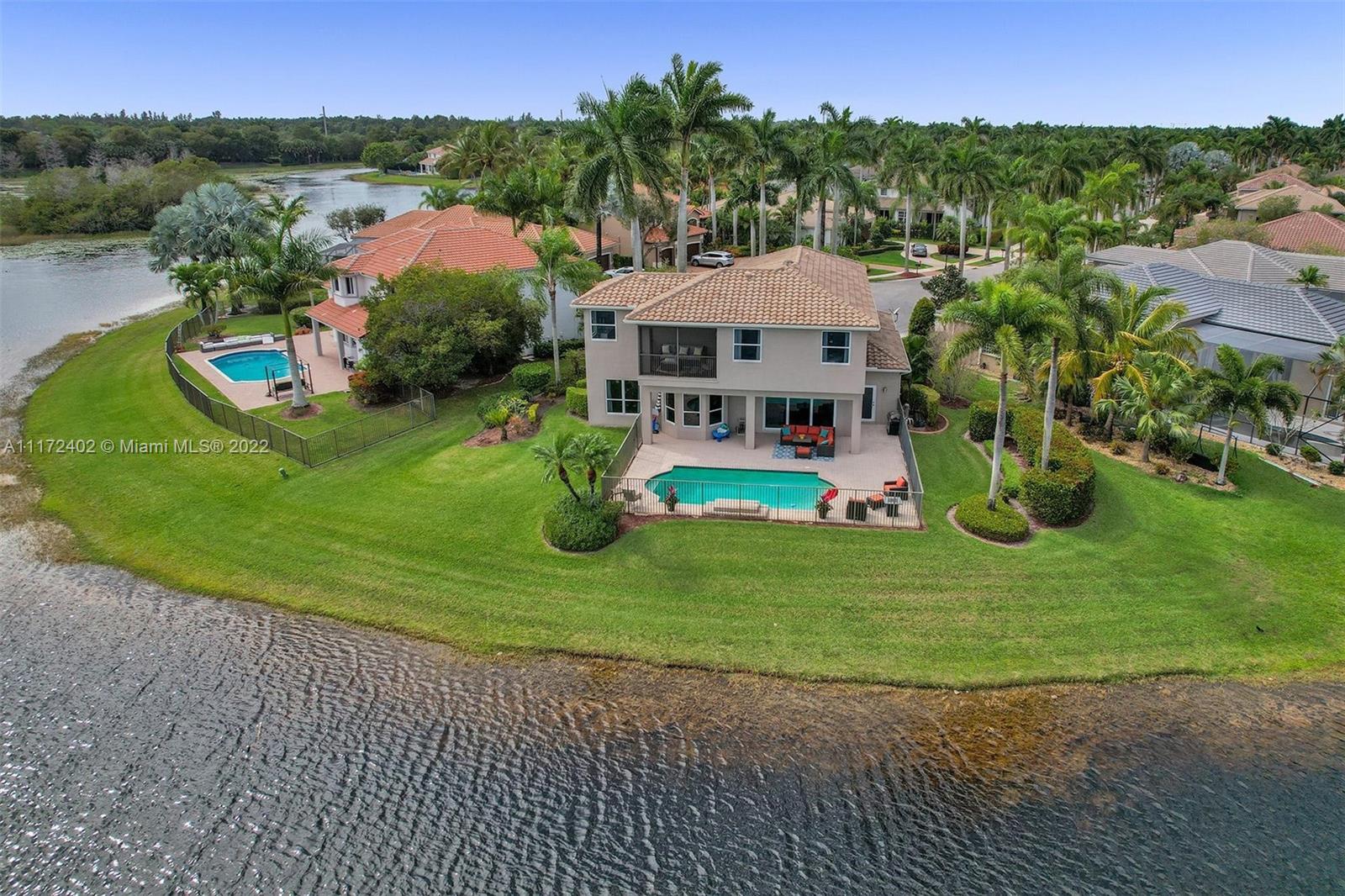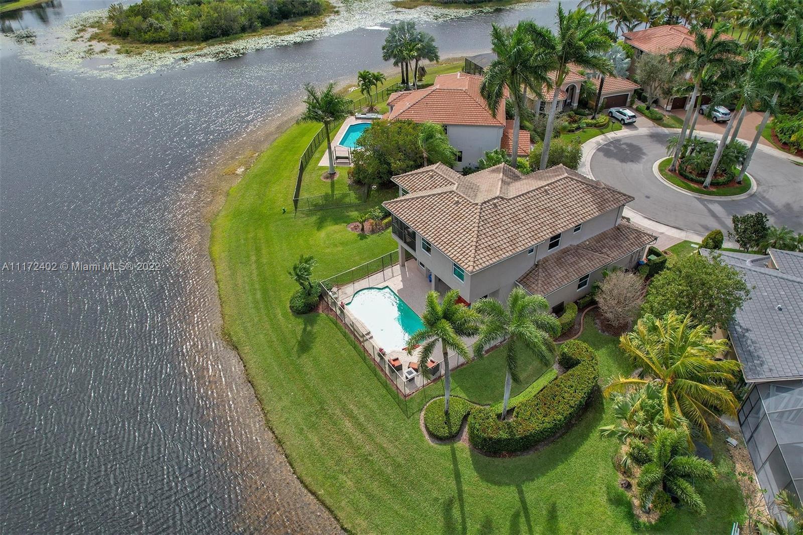 Tucked on a royal palm tree-lined street in Jardin at the prestigious gated golf community of Weston Hills Country Club. Stunning pointe water lot with long, panoramic lake views. 5 bed, 4 bath, 3 car garage. Enjoy soaring ceilings in the living room, a formal dining, a spacious family room, and an office/den/bed first floor plus renovated marble cabana bath. Renovated modern kitchen w/ shaker cabinets, center island, sunny breakfast nook, stainless steel appliances, quartz countertops. The oversized owner's bedroom on the second floor features a private screened balcony. Fenced private backyard with a free-form pool on an expansive cul de sac lot. Marble floors throughout the first level, rectified porcelain wood in bedrooms, full impact windows.