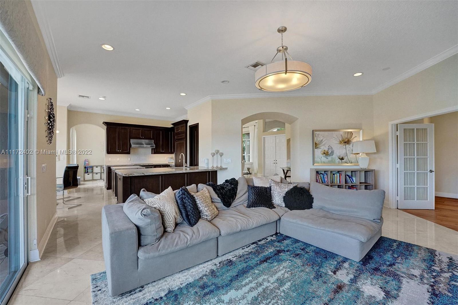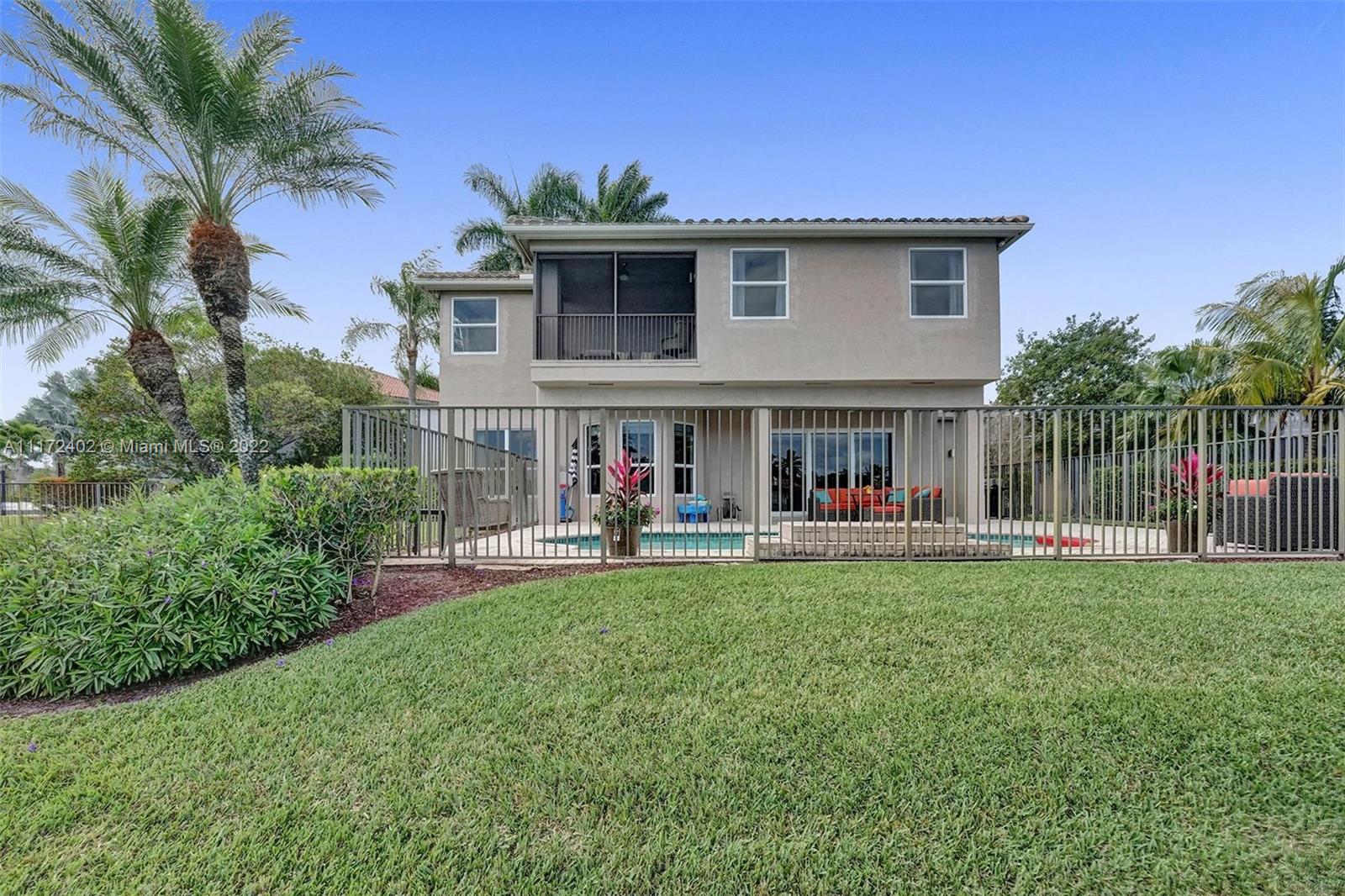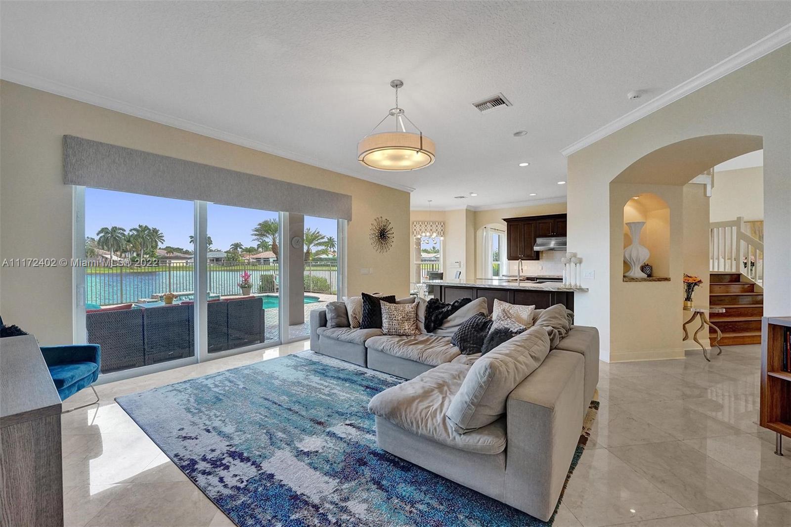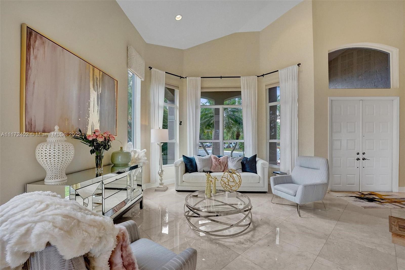 Tucked on a royal palm tree-lined street in Jardin at the prestigious gated golf community of Weston Hills Country Club. Stunning pointe water lot with long, panoramic lake views. 5 bed, 4 bath, 3 car garage. Enjoy soaring ceilings in the living room, a formal dining, a spacious family room, and an office/den/bed first floor plus renovated marble cabana bath. Renovated modern kitchen w/ shaker cabinets, center island, sunny breakfast nook, stainless steel appliances, quartz countertops. The oversized owner's bedroom on the second floor features a private screened balcony. Fenced private backyard with a free-form pool on an expansive cul de sac lot. Marble floors throughout the first level, rectified porcelain wood in bedrooms, full impact windows.