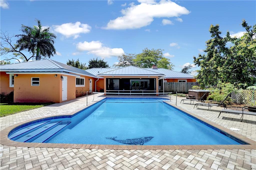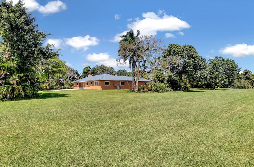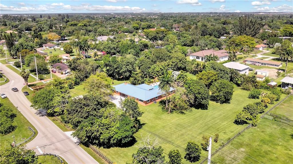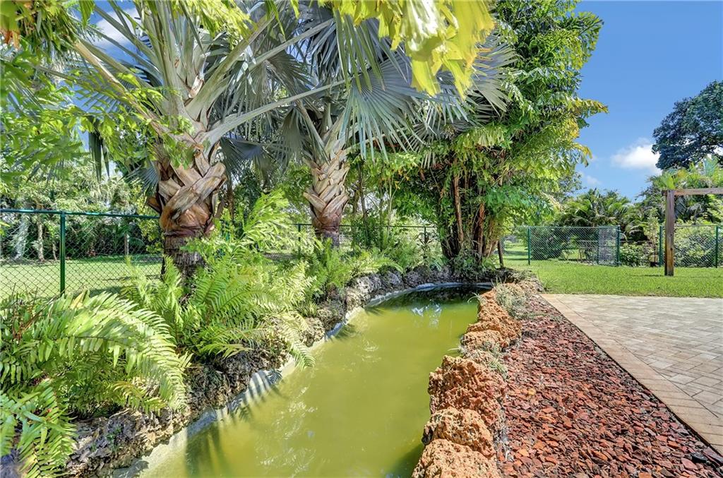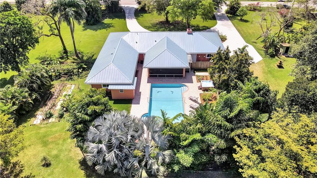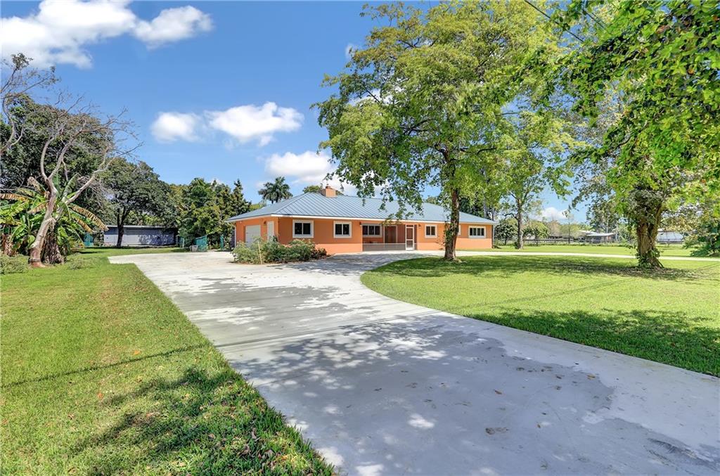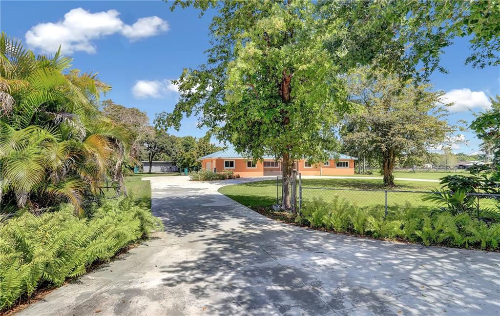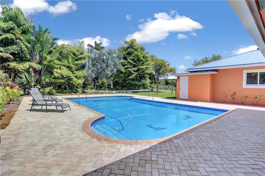 This incredibly rare and impressive property is nestled on a quiet, coveted street in unincorporated Davie; sits comfortably on just under two acres of lush tropical land; features 4 BD’s + office, 3.5 BA’s + poolside cabana bathroom. A covered, brick-paved, and screened-in patio features a summer kitchen, overlooking the oversized pool and cascading rock waterfall, is perfect for entertaining or private enjoyment alike. A sprawling circular driveway can easily accommodate a small fleet of vehicles. Substantially remodeled, reinforced to meet the latest code, and expanded, boasting tile throughout the living areas, hardwood in the bedrooms, complete impact windows and doors all around. The indoor kitchen boasts stainless-steel appliances, granite countertops, and wood cabinets.