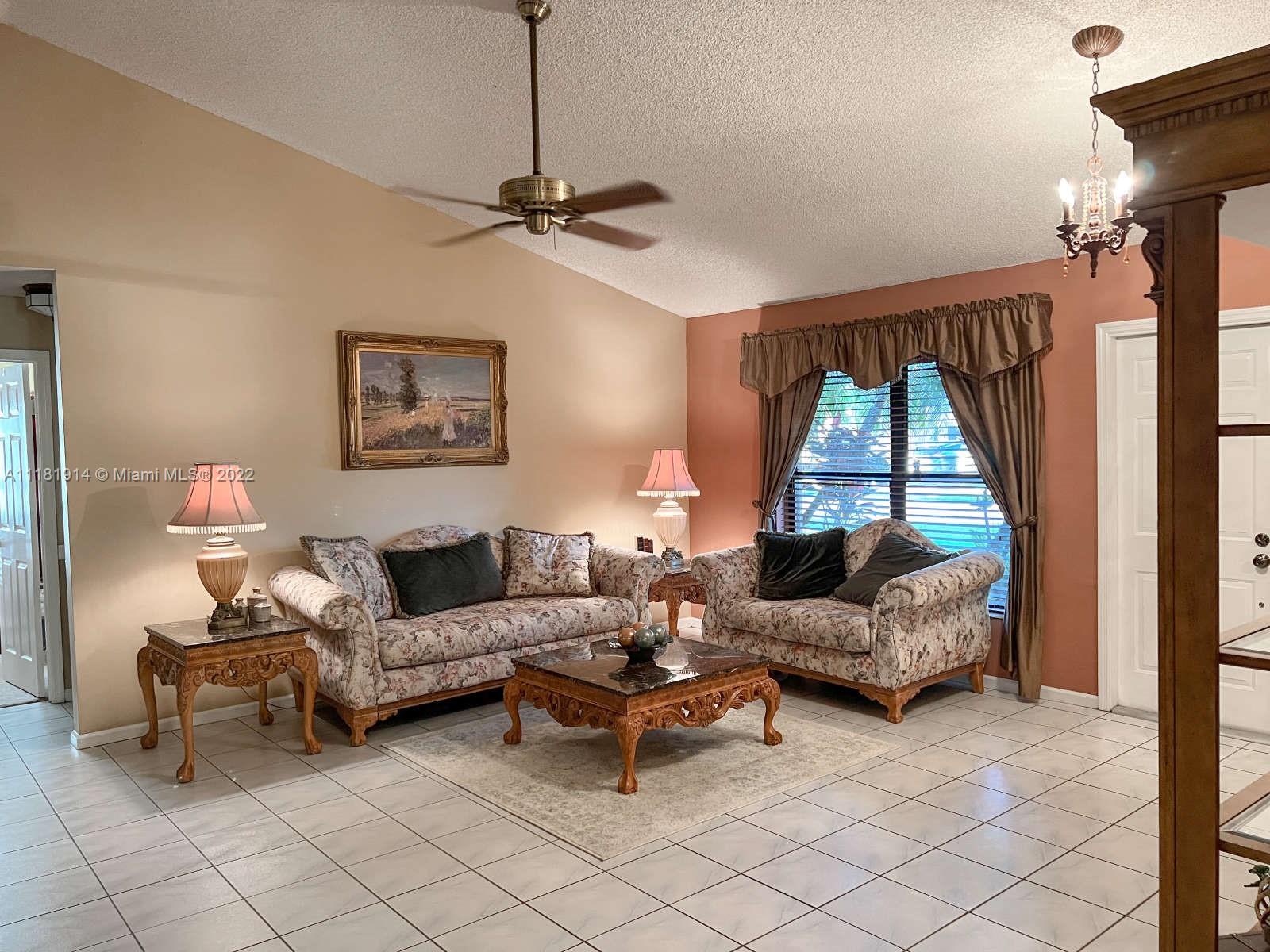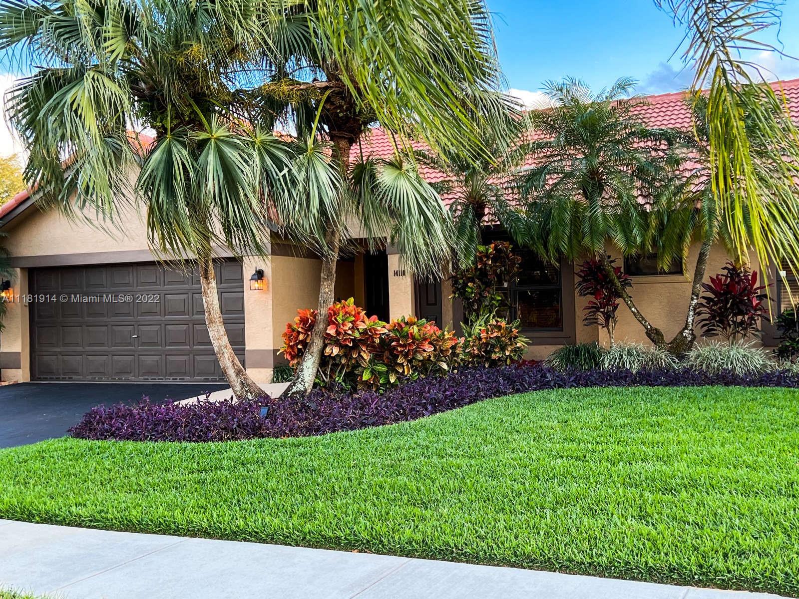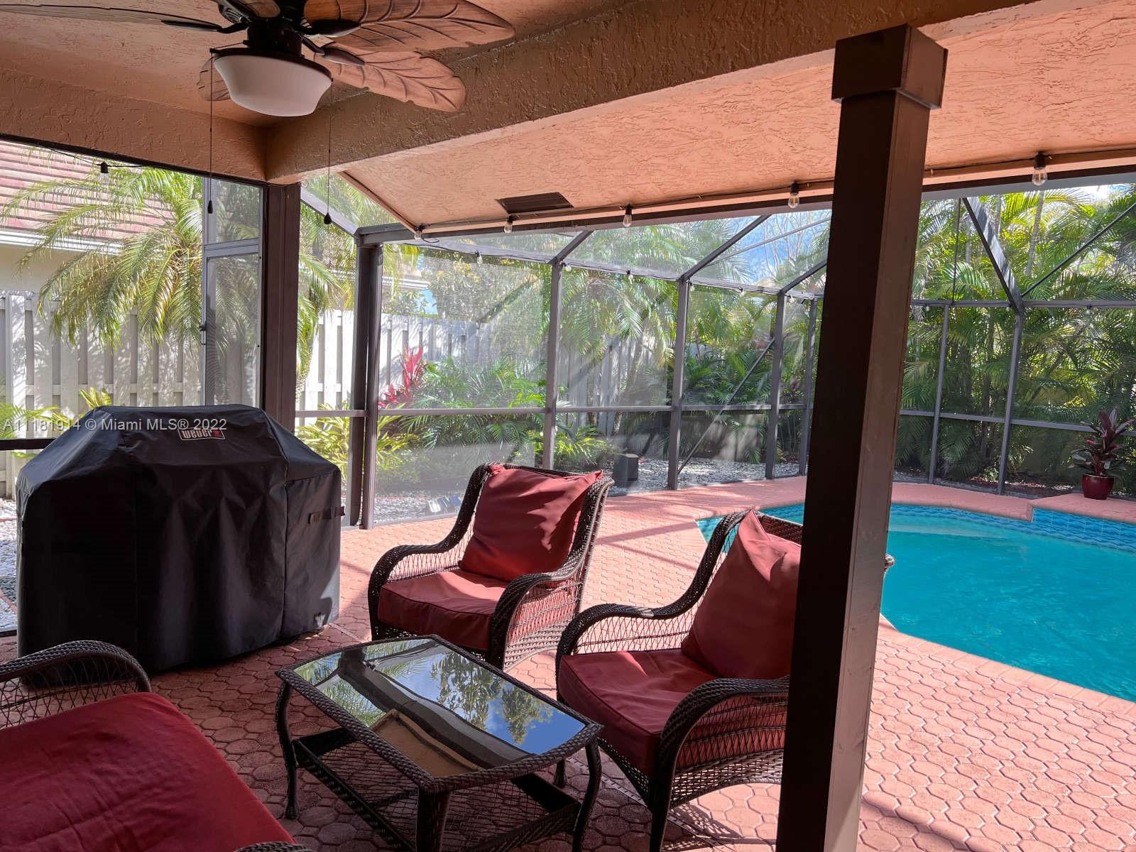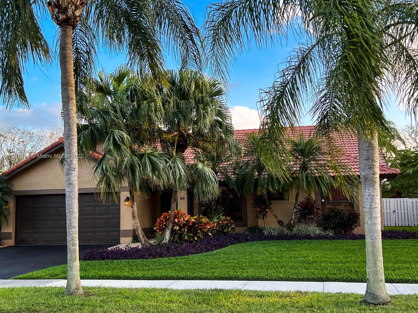 This elegant ranch-style house feels like home the minute you pull up. Beyond the double doored front entry, you are greeted by the 15 ft. vaulted ceilings of the elegant great room. This luminous entryway flows into an open concept living room that showcases a tropical paradise. The resort-like backyard boasts a large, screened-in swimming pool and waterfall jacuzzi, paved patio, fully fenced backyard, and lush landscaping. The newly renovated kitchen is right off the patio area, perfect for entertaining guests or enjoying a family dinner. The open floor plan and large sliding glass doors throughout, allow for for you to enjoy the captivating views of your backyard oasis both morning and night. The roof on this luxurious home was recently replaced and still under warranty. Welcome Home!