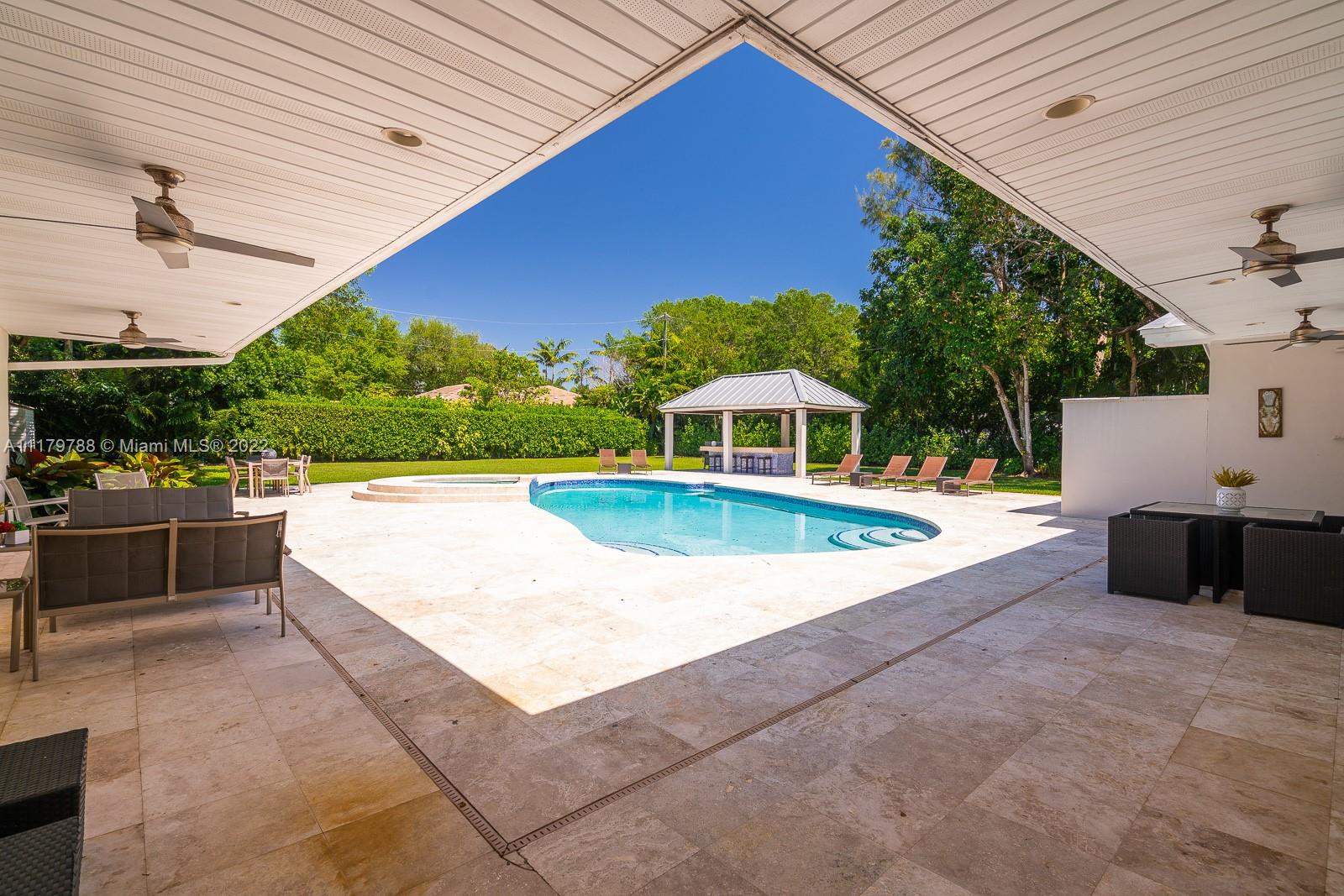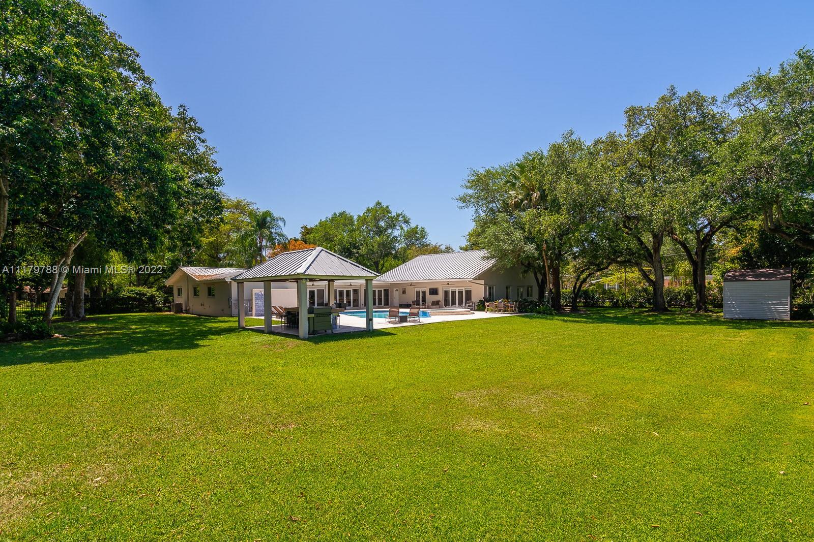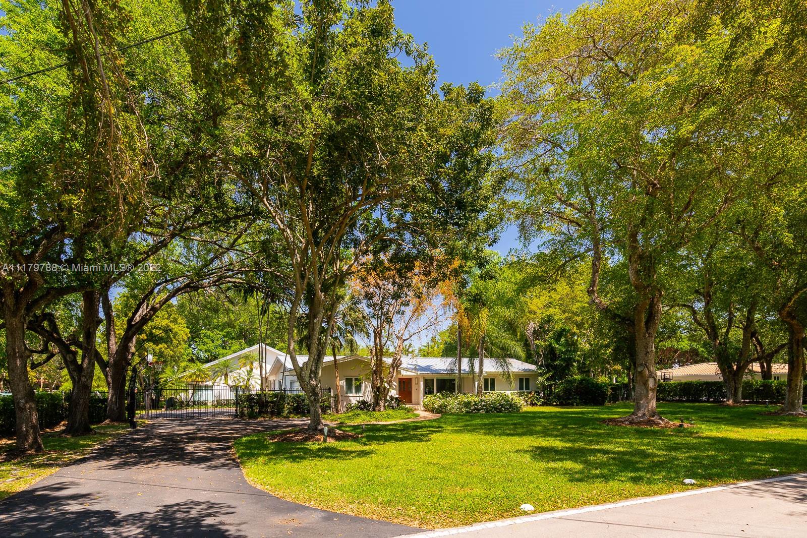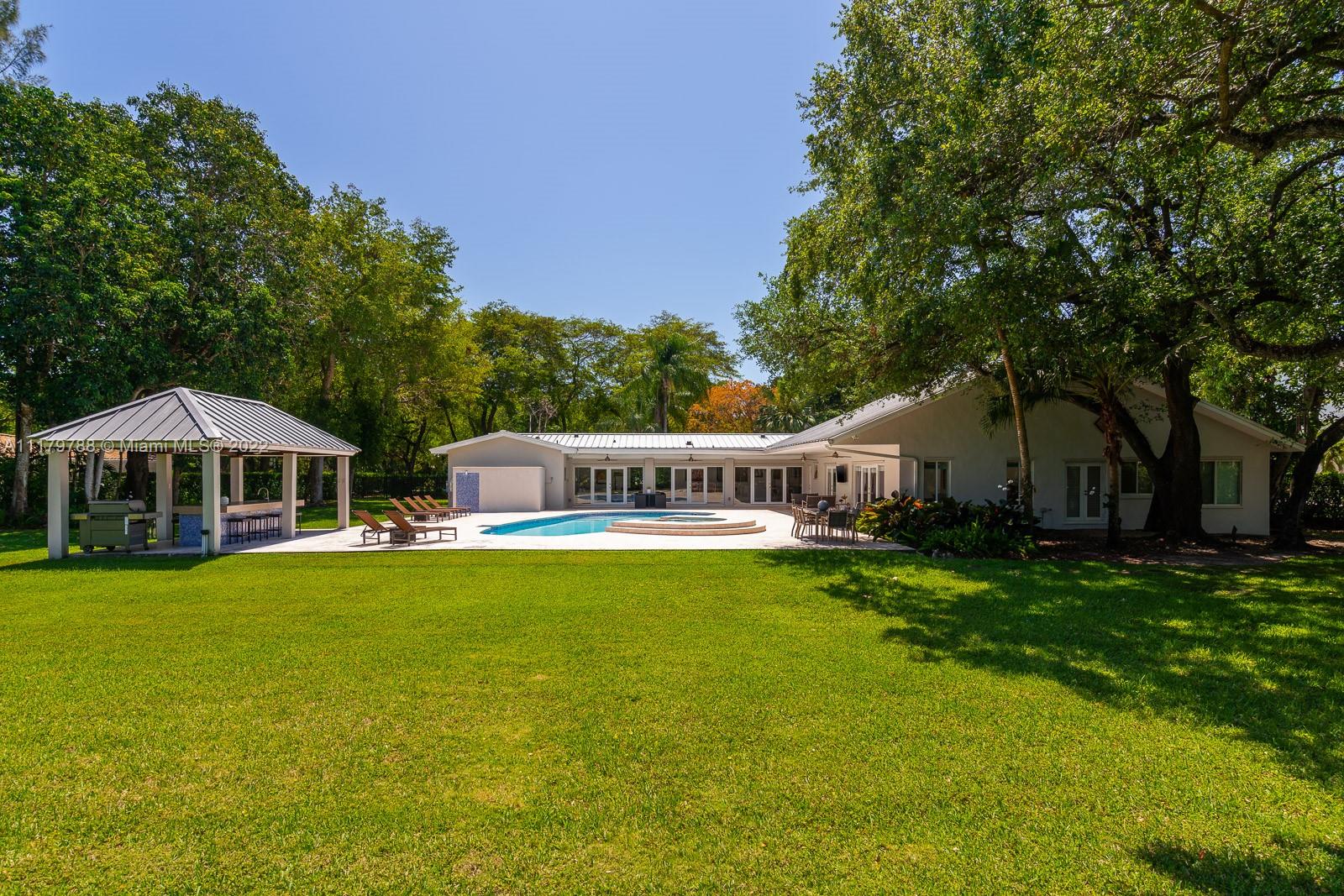 You will be charmed the moment you arrive at this wonderful home which sits on a magnificent and lush 37,156 sq ft property in highly sought-after N Pinecrest. This 6 bedroom / 4 bath split plan has an updated kitchen that opens to the family room. The formal living, dining and Florida rooms are all spacious and light-filled. French doors lead to large terrace with pool, a covered gazebo with wet bar & extensive manicured gardens - perfect for entertaining! The private primary suite includes two office / sitting areas and a substantial master bath & walk-in closet. Other special features include guest suite w/ separate entrance, gated 2-car garage, cabana bath & gorgeous oaks. Don't miss this unique opportunity that has infinite potential!