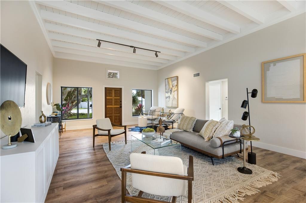 Must see Totally Renovated 3 Bedroom Waterfront home LIKE NEW: unique property. Custom exterior architecture and High exposed wood beam ceilings bring a mid-century modern character to south Florida waterfront, paired with total modernization from top to bottom: All new hurricane impact windows & sliding doors, all new kitchen and bathrooms, new wiring and plumbing, dual-zone climate control with 2 brand new AC systems, NO cast iron pipes, all new Stracciatella quartzite kitchen countertops and marble backsplash. Extra long 99 ft of water frontage, no fixed bridges, a backyard full of possibilities with a constant breeze, and a brand new dock.