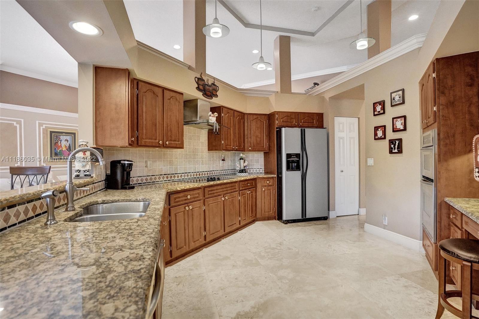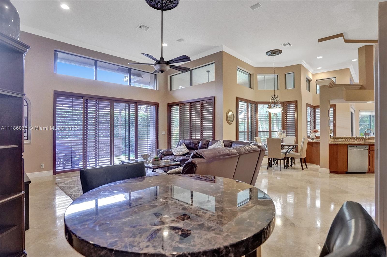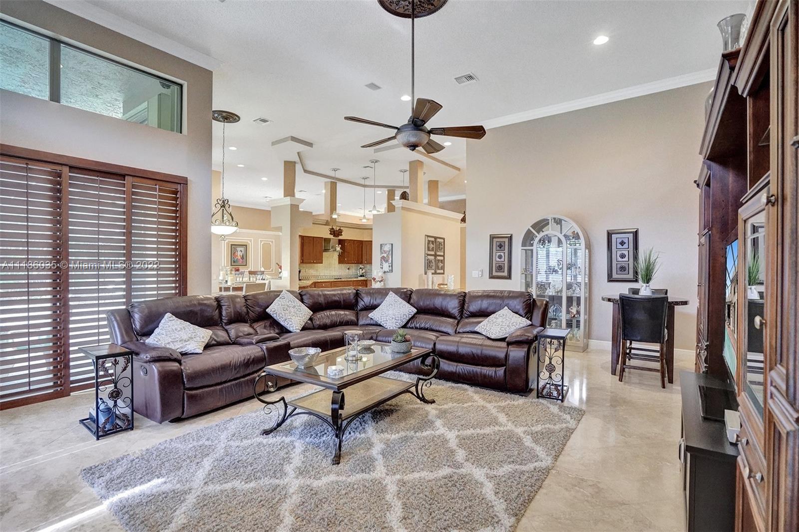 Turnkey home in the gated community of Palm Island. This home features 5 Bedrooms with 4 Full Bathrooms and 2 Half Baths. Great curb appeal sitting on an oversized 14,682 Square Foot lot on a Royal Palm Tree-lined street. Soaring ceilings in Living Areas. Marble floors flow through Living Areas with an elegant step-down Living Room. Gourmet kitchen with Granite countertops, Stainless Steel appliances, wall Oven, and two Pantries. Large owners Suite with Walk-In Closets and en-Suite Bathroom with Dual sinks and large Jacuzzi Tub and standing Shower. Privacy is hedged with lush mature landscaping surrounding the property encompassing the screened Pool Area and a Pergola Deck. True pride in ownership.