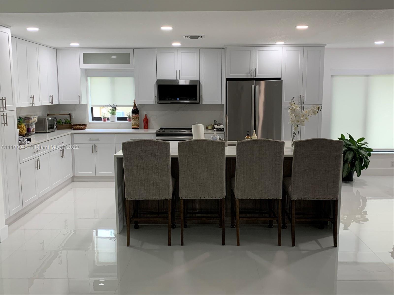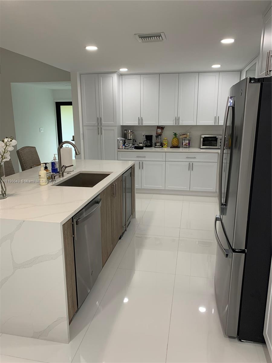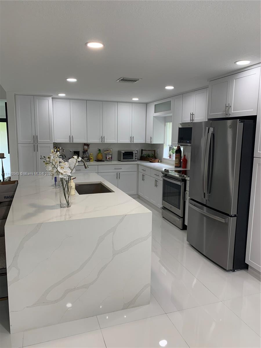 WOW Remarkable "One of a kind" newly renovated One story End Unit Villa backing the canal with beautiful views, from beginning to End all Newly Painted, knockdowns ceilings, all New 52 LED high hats, all new baseboard and door moldings, all new A/C ducts and vents changes with acid wash and handler cleaning. All New Window treatments, New Impact Windows and Doors including front double door all frosted glass, All New grey Washer and Dryer front loaders with warranty. All New GE Profile Aplliances Dishwasher, Glass stove, Microwave, Refrigerator, Wine and soda Half size refrigerator custom installed in waterfall kitchen Island, ALL New porcelain White 24x48, Floors Huge Walk in master closet and Master vanity with walk in shower rain shower head wing 3 phase massage jets, rain gutters