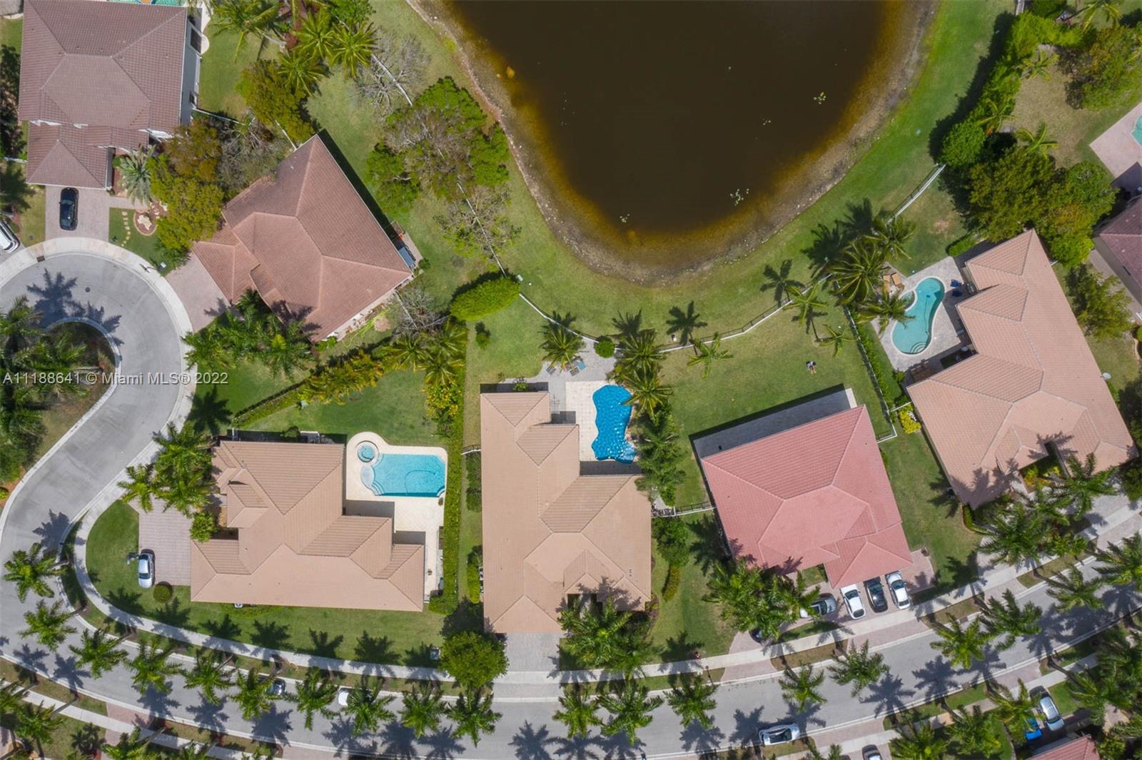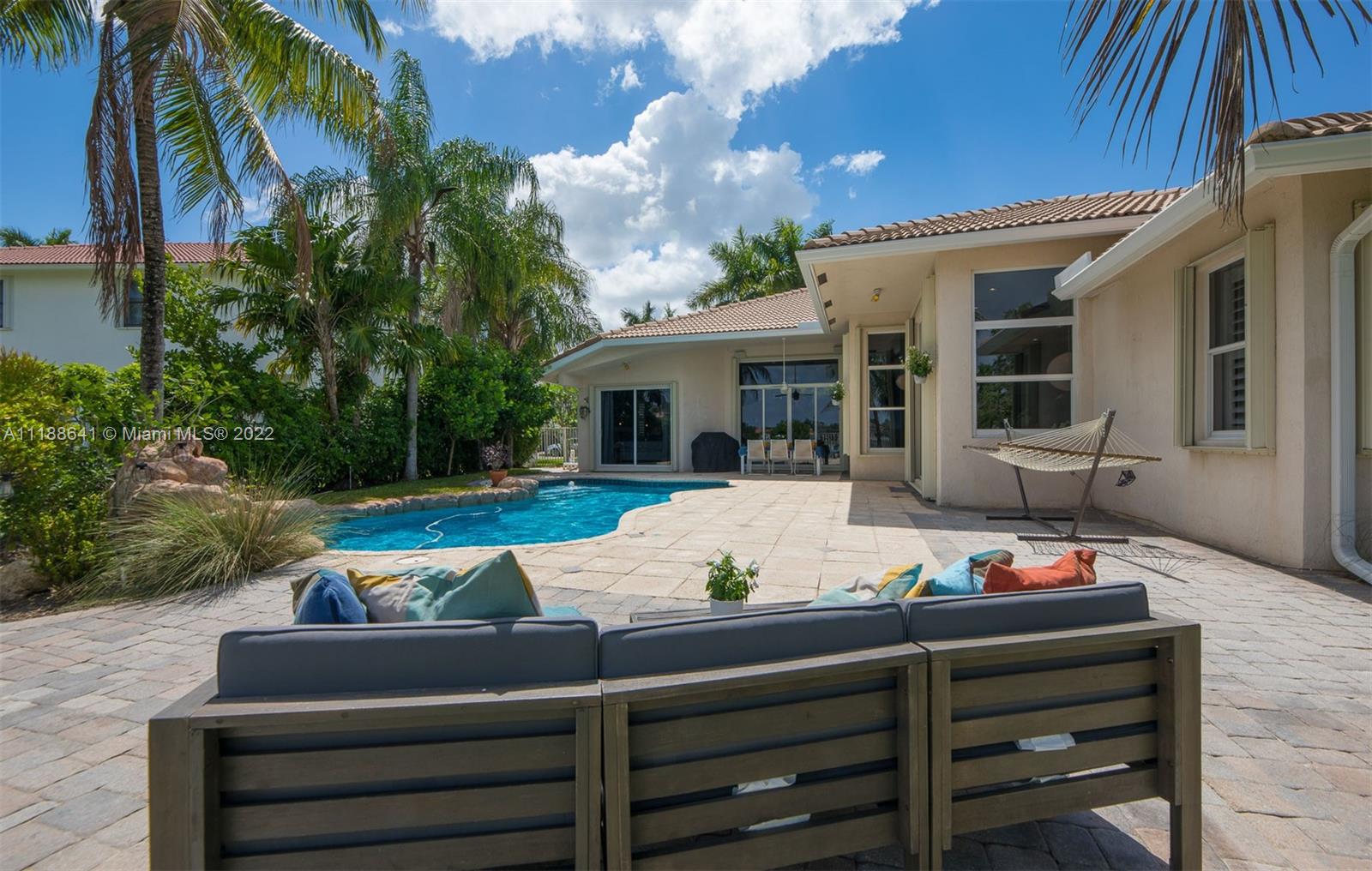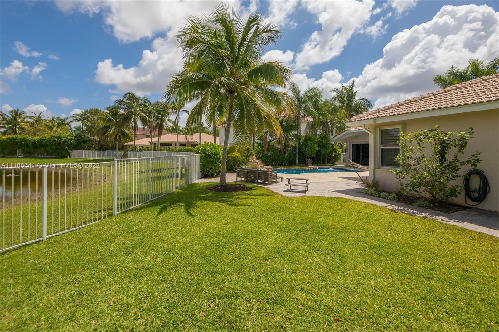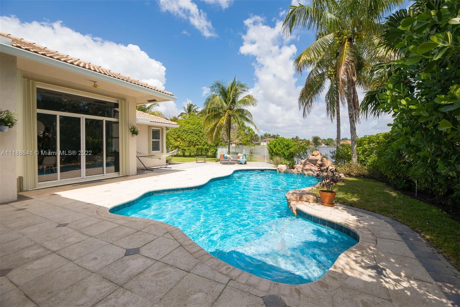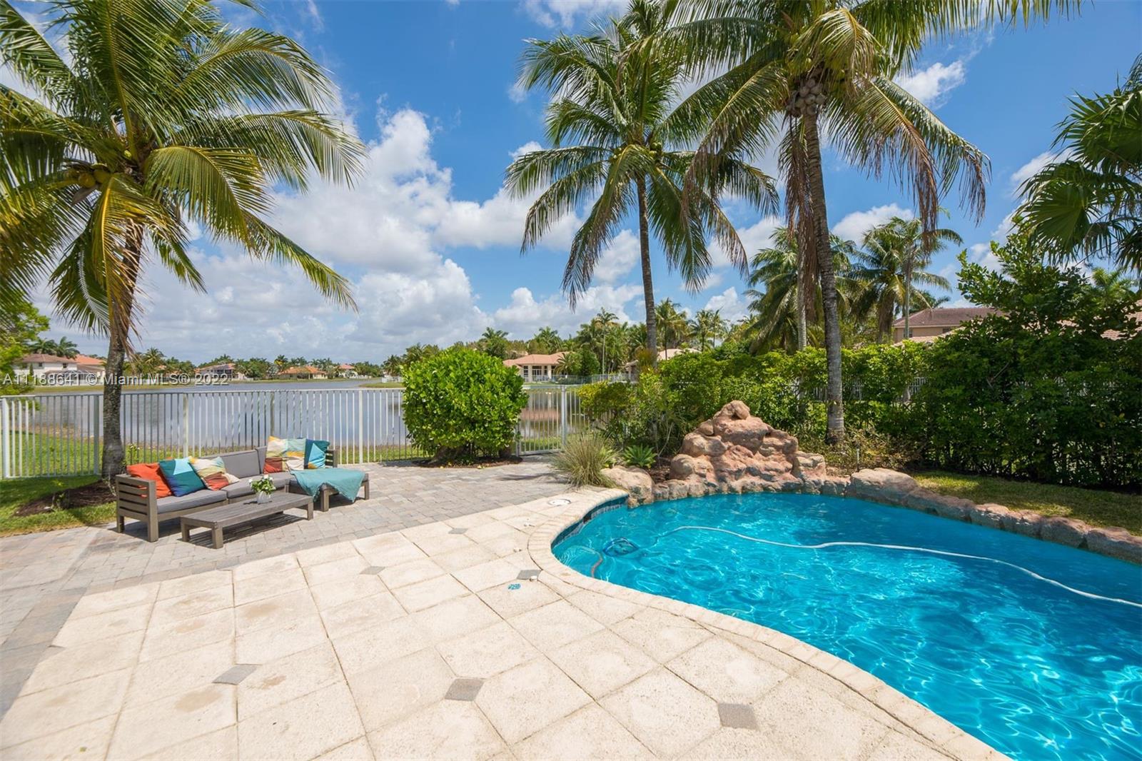 Imagine your family & friends gathering on this beautiful patio watching the sunset. Swim in the free form pool and enjoy the waterfall and this picturesque view of the lake. When you walk through the front door you will be in awe of the open floor plan with vaulted ceilings and gorgeous natural lighting. Multiple living areas and the triple split floor plan on 3879 sf provide plenty of room for entertaining. This well maintained home features a fully remodeled kitchen,renovated bathrooms,California closets,newer AC,complete Accordian Shutters,partial Impact windows and Plantation shutters. Nestled in the prestige subdivision 'The Cove' in Savanna, Weston. This highly desired community has resort style amenities, low HOA and is located in one of the best school districts in Broward County.