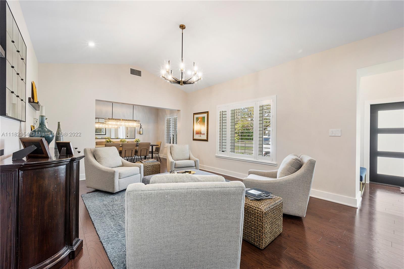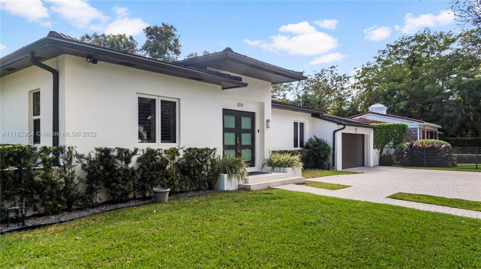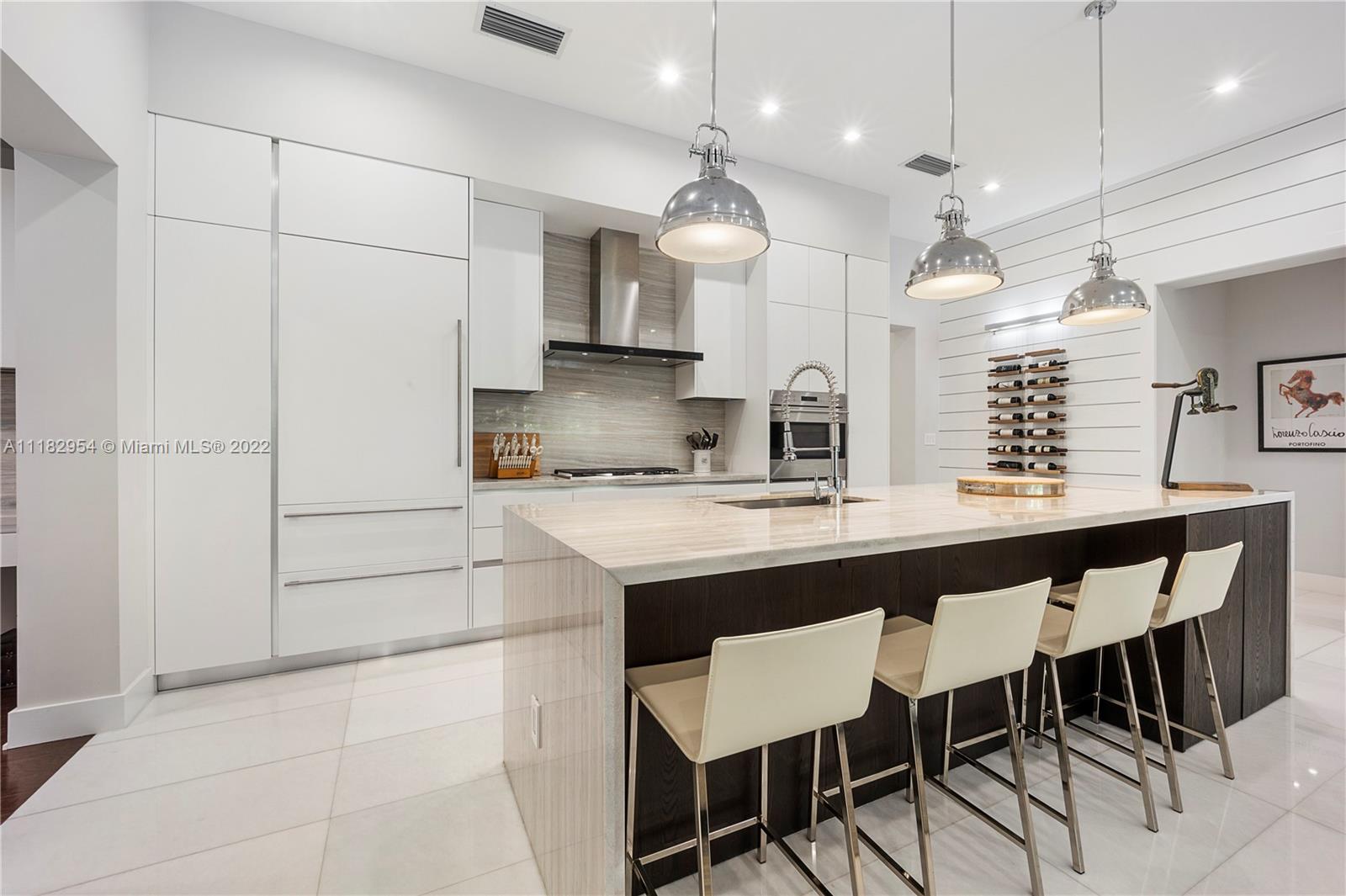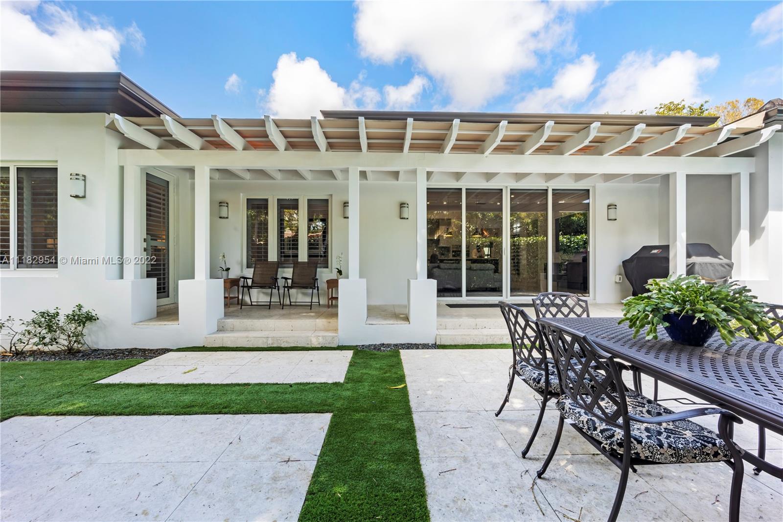 This stylish and contemporary one-story home is located in the Golden Triangle of Coral Gables on a beautiful street w/wide swale. Walking distance to the Biltmore Hotel and Golf Course and Downtown Coral Gables and within a short stroll to Fine dining and entertainment at Miracle Mile. All done with high-end finishes and excellent quality. This spacious family home features a welcoming foyer entrance with a formal living and dining room area with an adjacent butler’s pantry. The gourmet kitchen, with Wolf appliances (gas range), Sub-Zero refrigerator, and custom ITALKRAFT cabinetry, overlooks the family room area with a beautiful shiplap accent wall. Full house generator! Move-in ready! Location! Location! Location! Outstanding! A must-see!