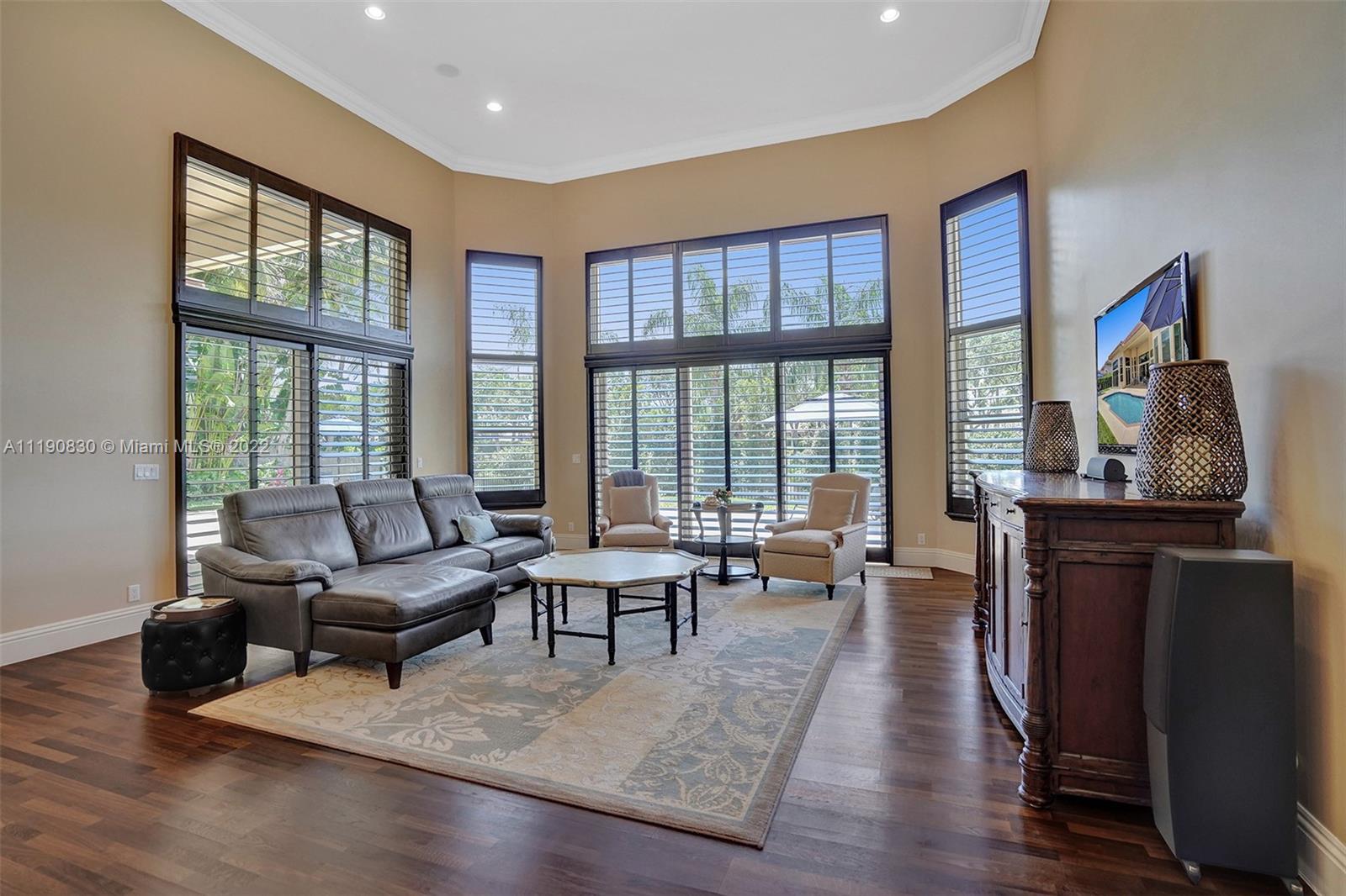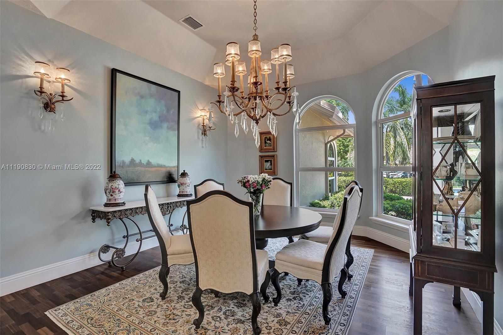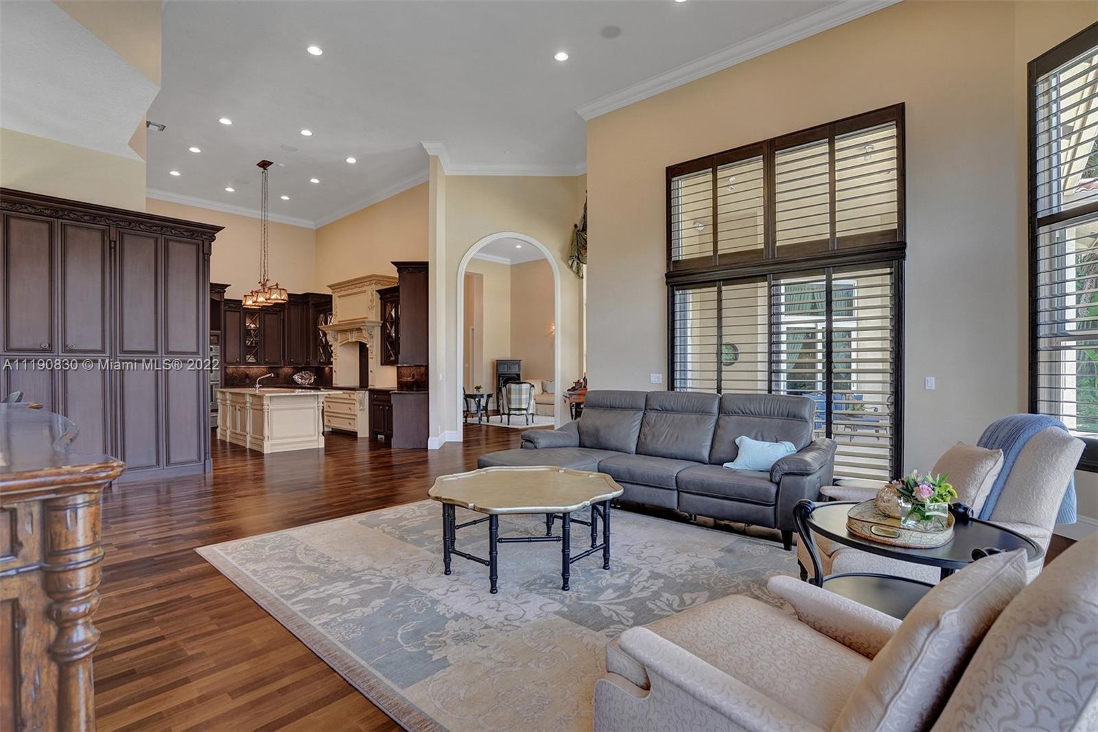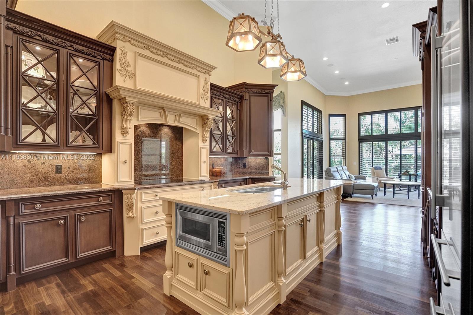 Perfectly placed on royal palm tree-lined cul de sac street in the gated community of Riviera at Weston Hills CC. 4800 sq ft under air, 5 bedrooms, 5.5 renovated baths plus an office. BRAND NEW IMPACT WINDOWS*NEWER ROOF*Real wood floors throughout living areas*volume ceilings*extensive crown moldings*exquisite custom light fixtures throughout*Plantation shutters. Gorgeous unobstructed water views. Renovated kitchen*custom wood cabinetry, center island, granite countertops, Stainless steel appliances, Double Subzero Refrigerator, double oven w/ warming drawer, wine cooler, top-of-the-line appliances, breakfast area. Master suite w/sitting area, his/hers closets, breathtaking, luxurious marble bath w/ vessel tub. Grand covered patio overlooking pool, lake w/lush landscaping. Fully fenced