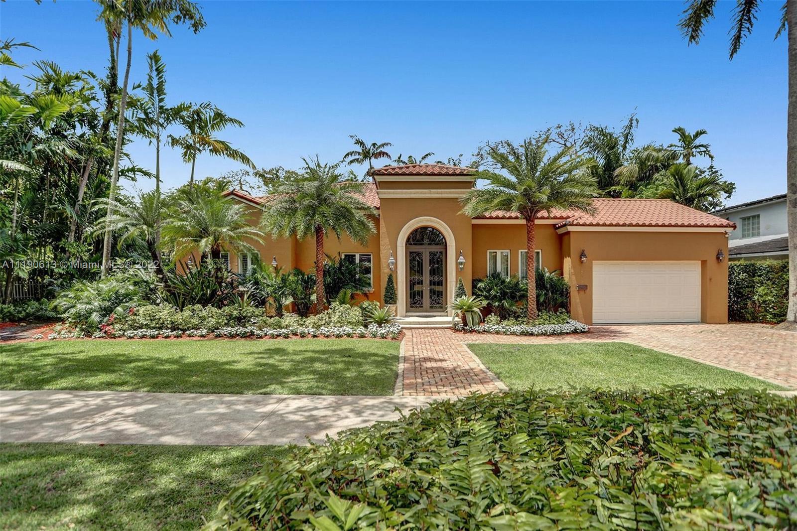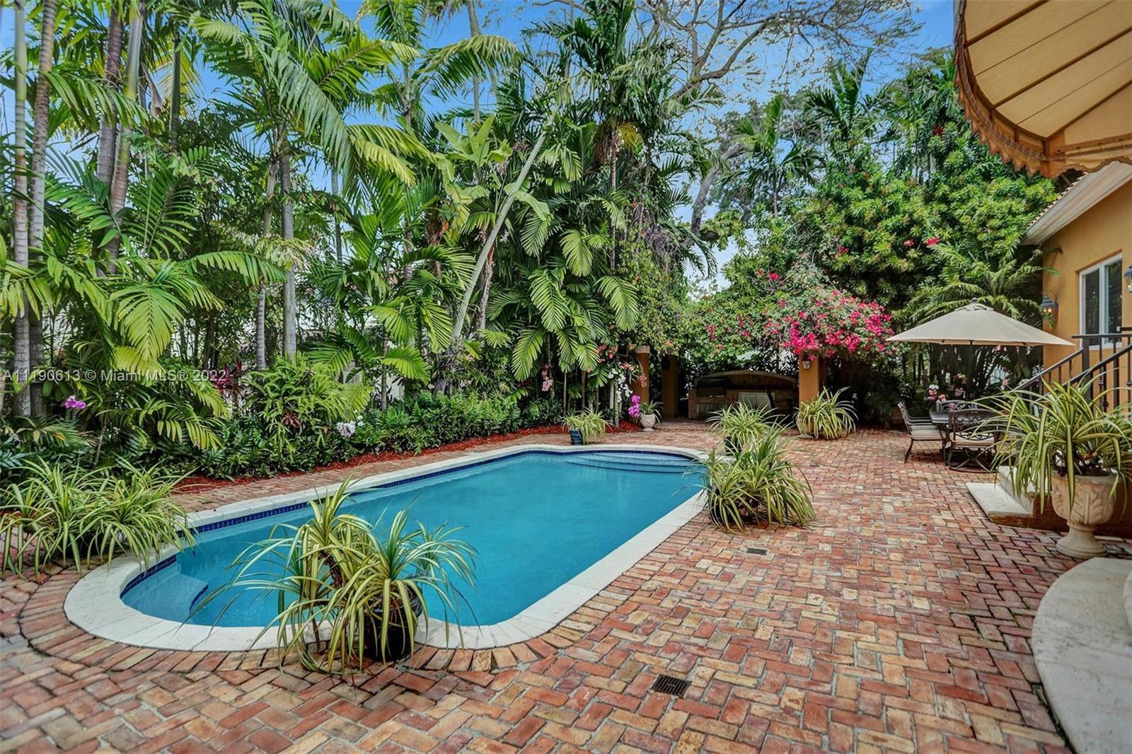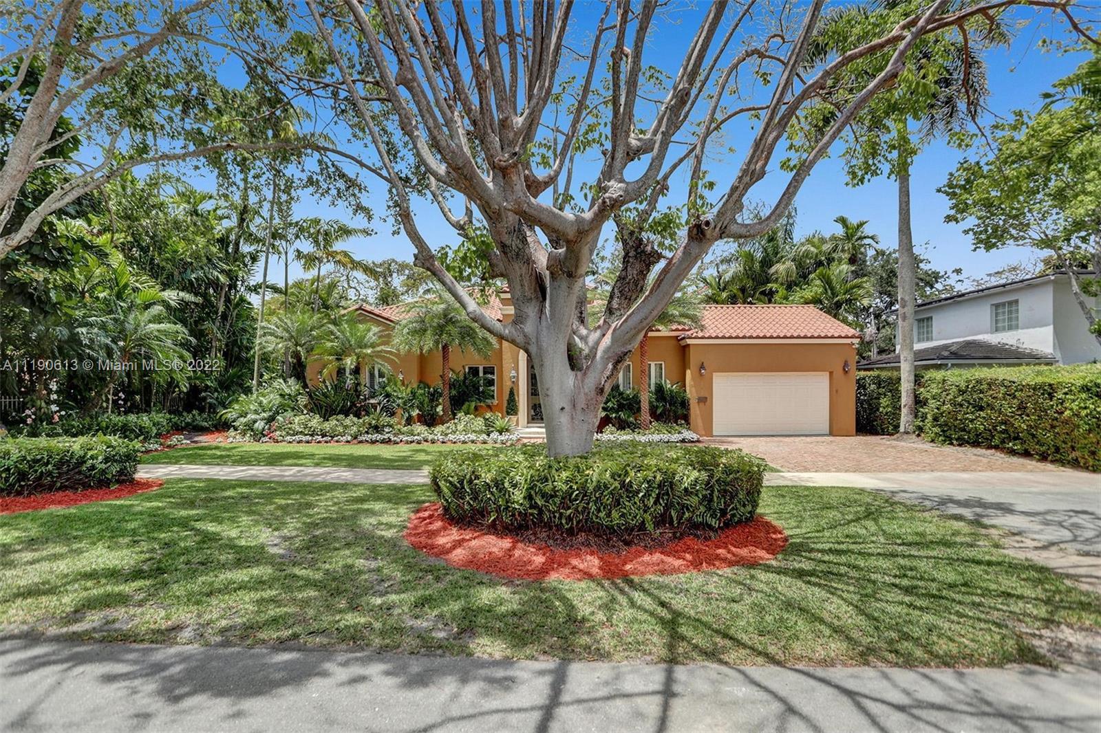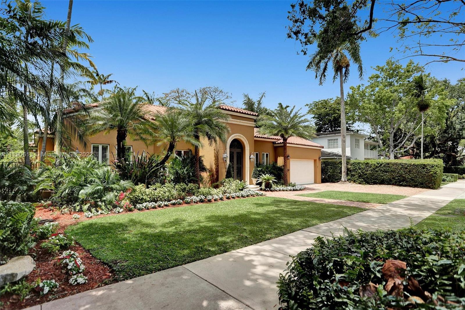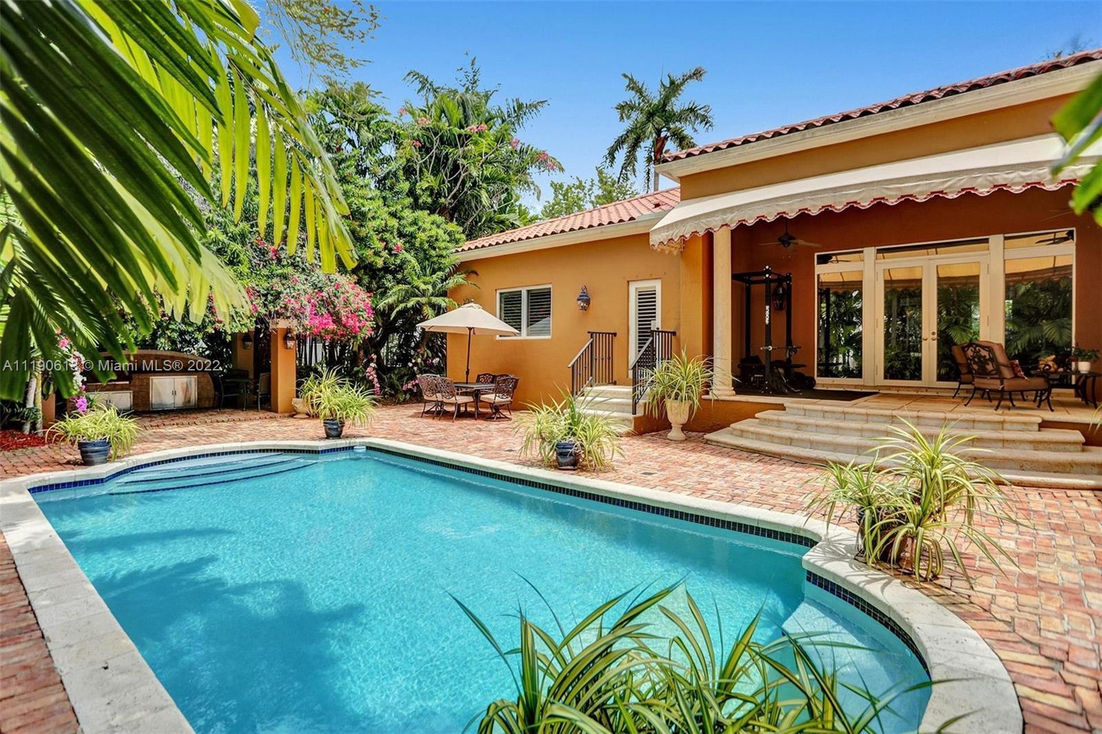 Stunning residence in a sought-after central Coral Gables area location awaits. An inviting foyer leads to a spacious living room, formal dining, entertainment room, and a large kitchen with cooking island with an informal dining area. The principal suite and two bedrooms with a hall bath are on one wing of the home; the 4th bedroom or office is opposite, with an adjacent hall/guest/cabana bath. Soaring ceilings throughout, and a bonus gardener's bath in the garage. Poolside, a covered terrace and pergola with a summer kitchen make the tropical outdoors quite inviting. Expanded and updated in 2002, the property offers a fabulous lifestyle in a desirable residential area, yet close to all the Downtown Gables amenities that our treasured City Beautiful offers.