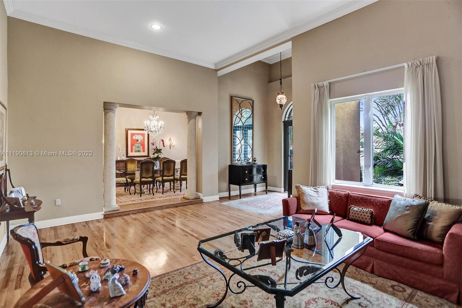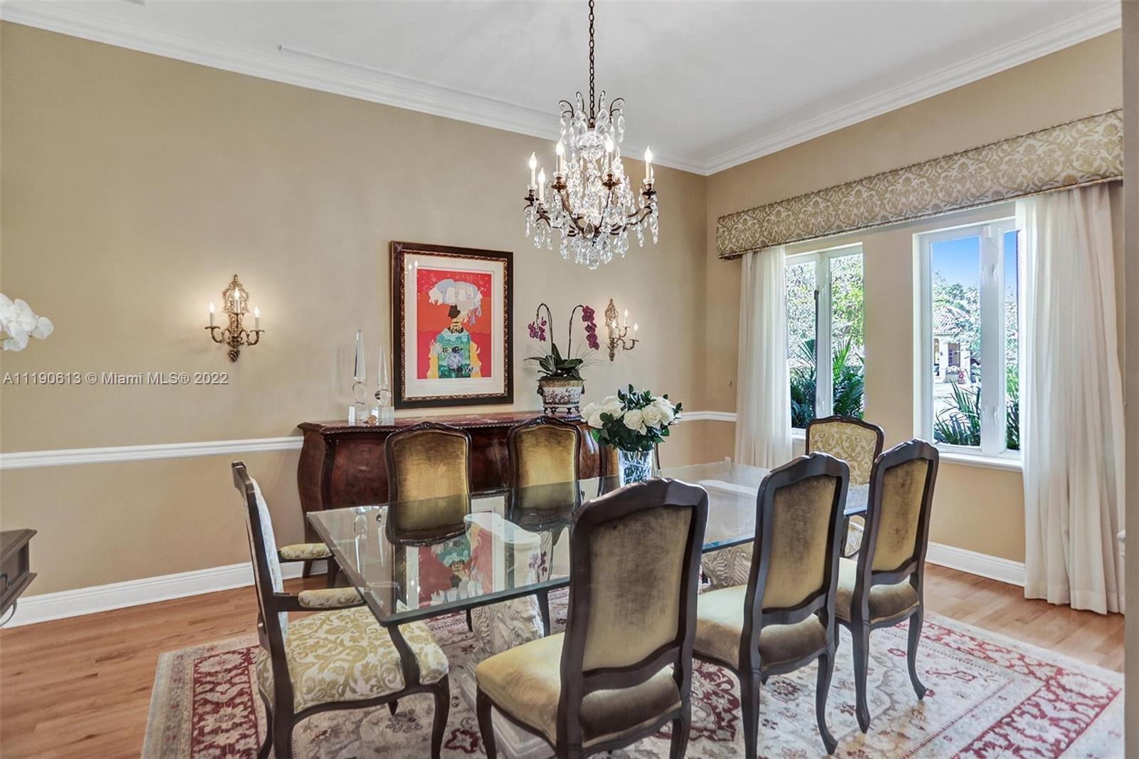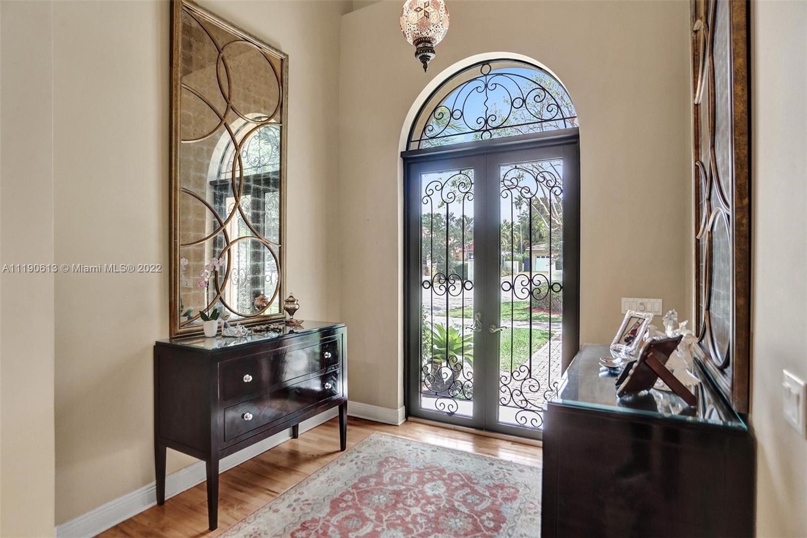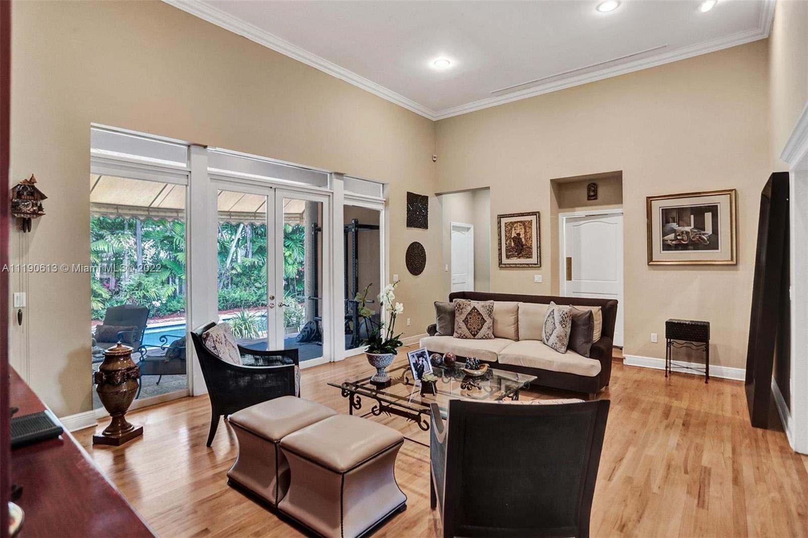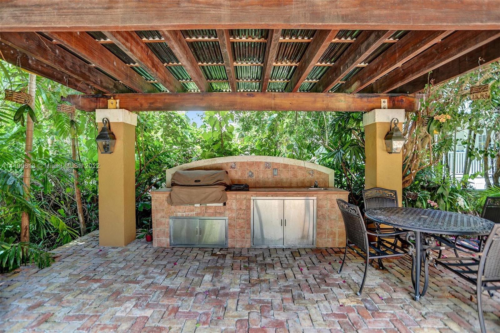 Stunning residence in a sought-after central Coral Gables area location awaits. An inviting foyer leads to a spacious living room, formal dining, entertainment room, and a large kitchen with cooking island with an informal dining area. The principal suite and two bedrooms with a hall bath are on one wing of the home; the 4th bedroom or office is opposite, with an adjacent hall/guest/cabana bath. Soaring ceilings throughout, and a bonus gardener's bath in the garage. Poolside, a covered terrace and pergola with a summer kitchen make the tropical outdoors quite inviting. Expanded and updated in 2002, the property offers a fabulous lifestyle in a desirable residential area, yet close to all the Downtown Gables amenities that our treasured City Beautiful offers.