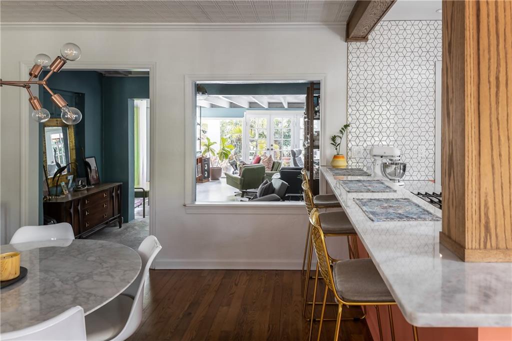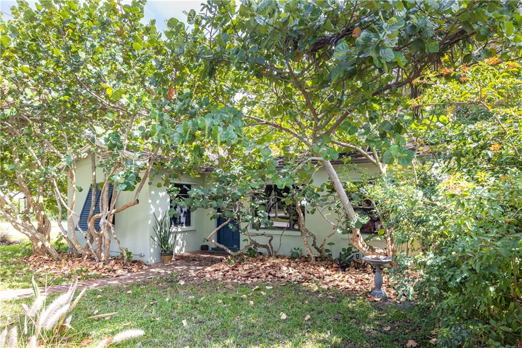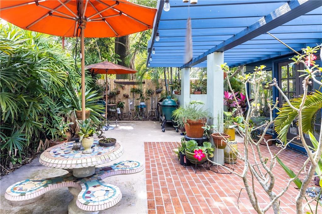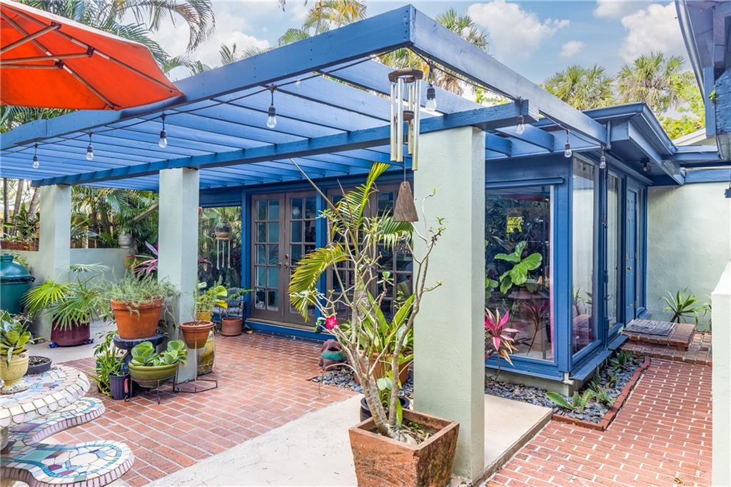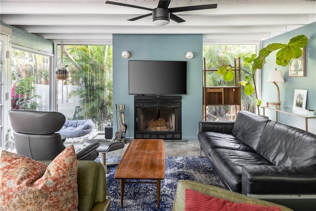 Charming 2 bed & 1 bath home with updated kitchen, exposed post and beam architectural details, stainless steel appliances, quartz counters, gas range, and breakfast bar. Original hardwood floors in the kitchen, dining room and both bedrooms. The large living room with floor to ceiling windows is light and bright. A working fireplace makes the space feel cozy, perfect for relaxing on a cool winter evening. From the living room, open the french doors onto the courtyard to create an awesome space for entertaining or dining al fresco. Mature oak trees and lush landscaping offer plenty of shade and reprieve from the south Florida heat.