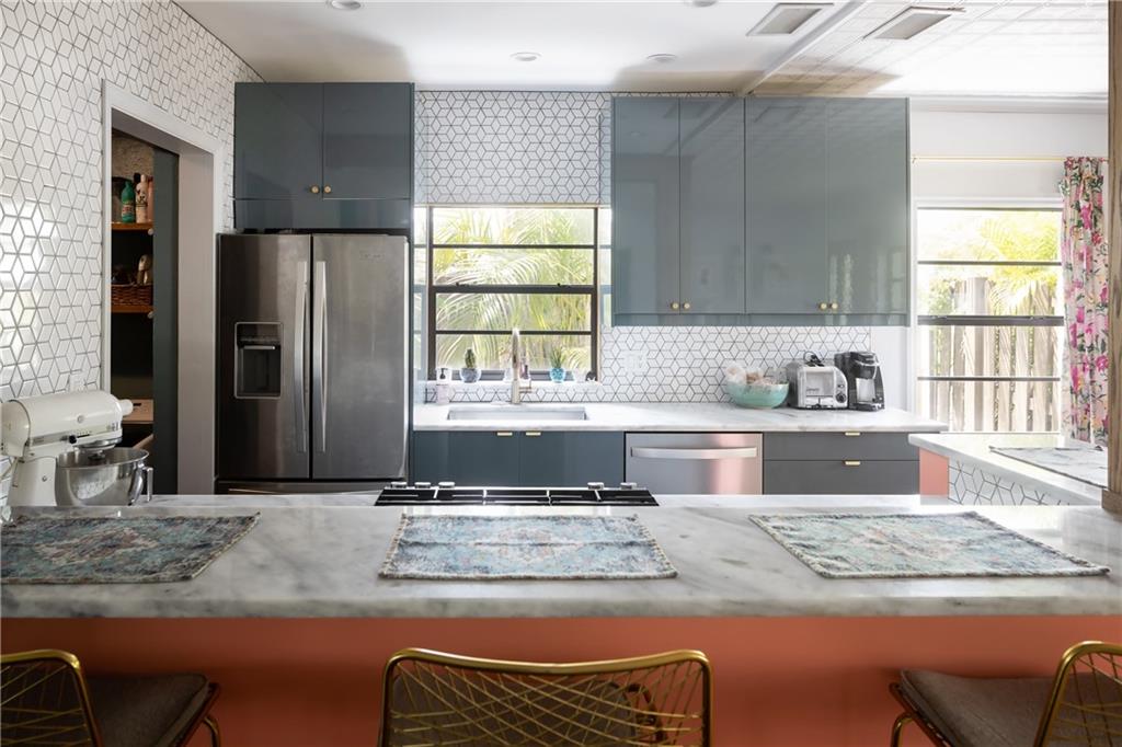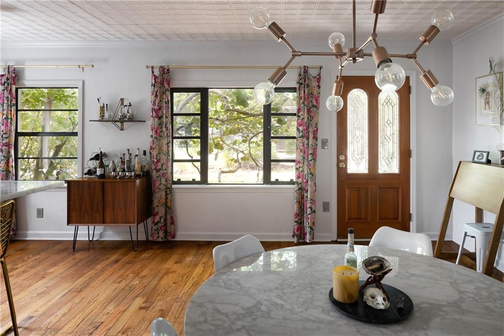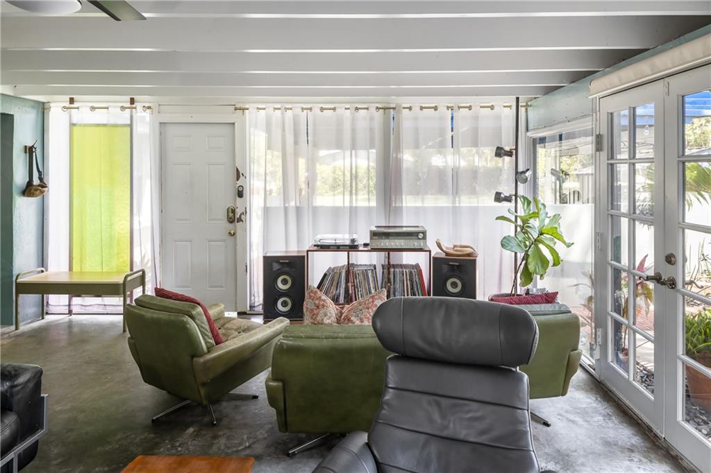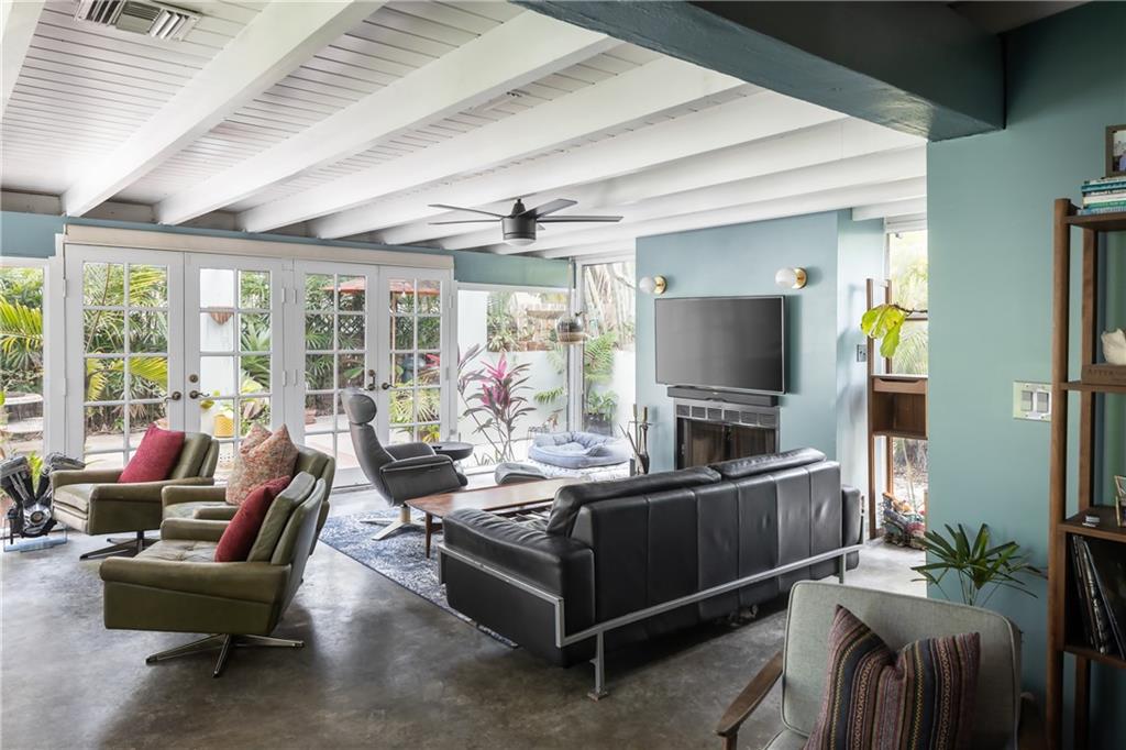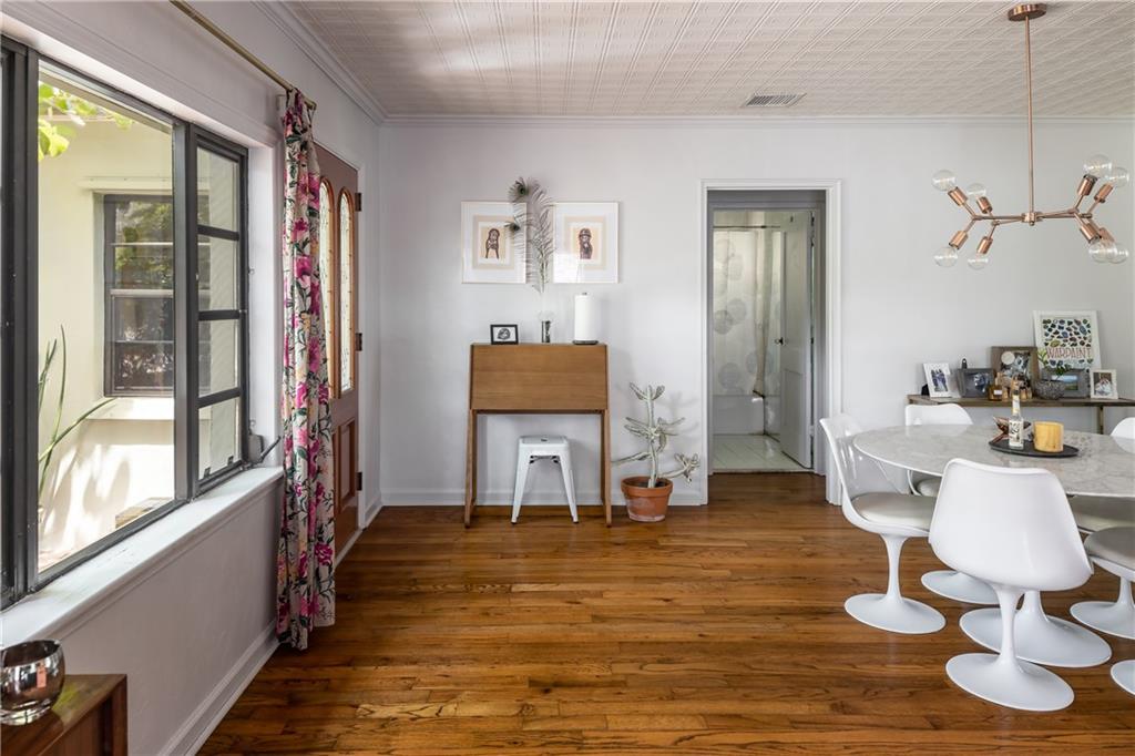 Charming 2 bed & 1 bath home with updated kitchen, exposed post and beam architectural details, stainless steel appliances, quartz counters, gas range, and breakfast bar. Original hardwood floors in the kitchen, dining room and both bedrooms. The large living room with floor to ceiling windows is light and bright. A working fireplace makes the space feel cozy, perfect for relaxing on a cool winter evening. From the living room, open the french doors onto the courtyard to create an awesome space for entertaining or dining al fresco. Mature oak trees and lush landscaping offer plenty of shade and reprieve from the south Florida heat.